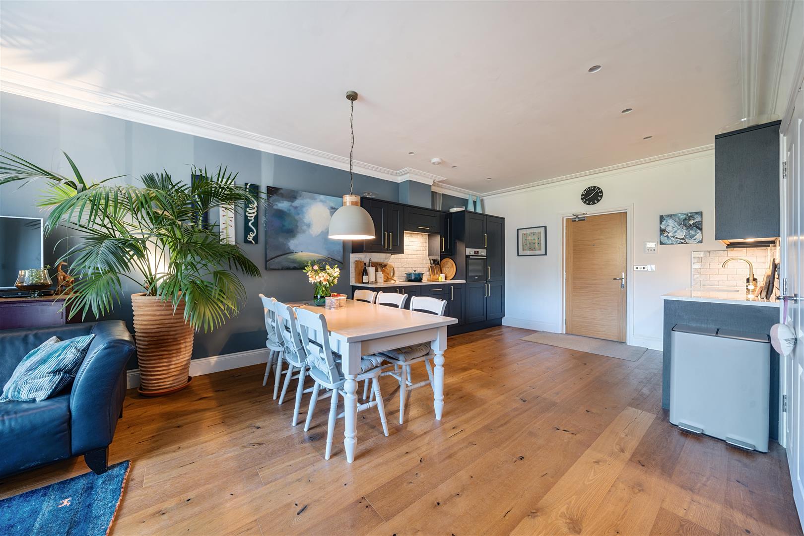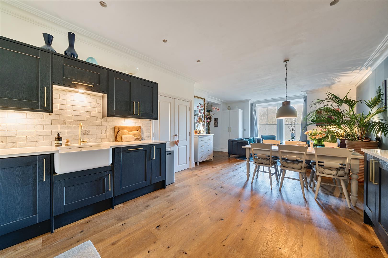 As you step into this beautifully presented ground-floor apartment, you’re welcomed by a bright and spacious open-plan kitchen and living area, offering a stunning view out from the front of the manor. The contemporary kitchen is well-equipped with modern appliances, including a built-in fridge and freezer, a dishwasher, a hob, an oven, and a washer-dryer. The living space is thoughtfully designed to provide a comfortable setting for both everyday living and entertaining.