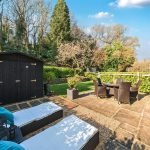 The outdoor space is well-maintained, with a combination of lawn and patio. There is also a sizable shed, ideal for storage or keeping gardening tools, and a separate access point leading to the communal grounds.