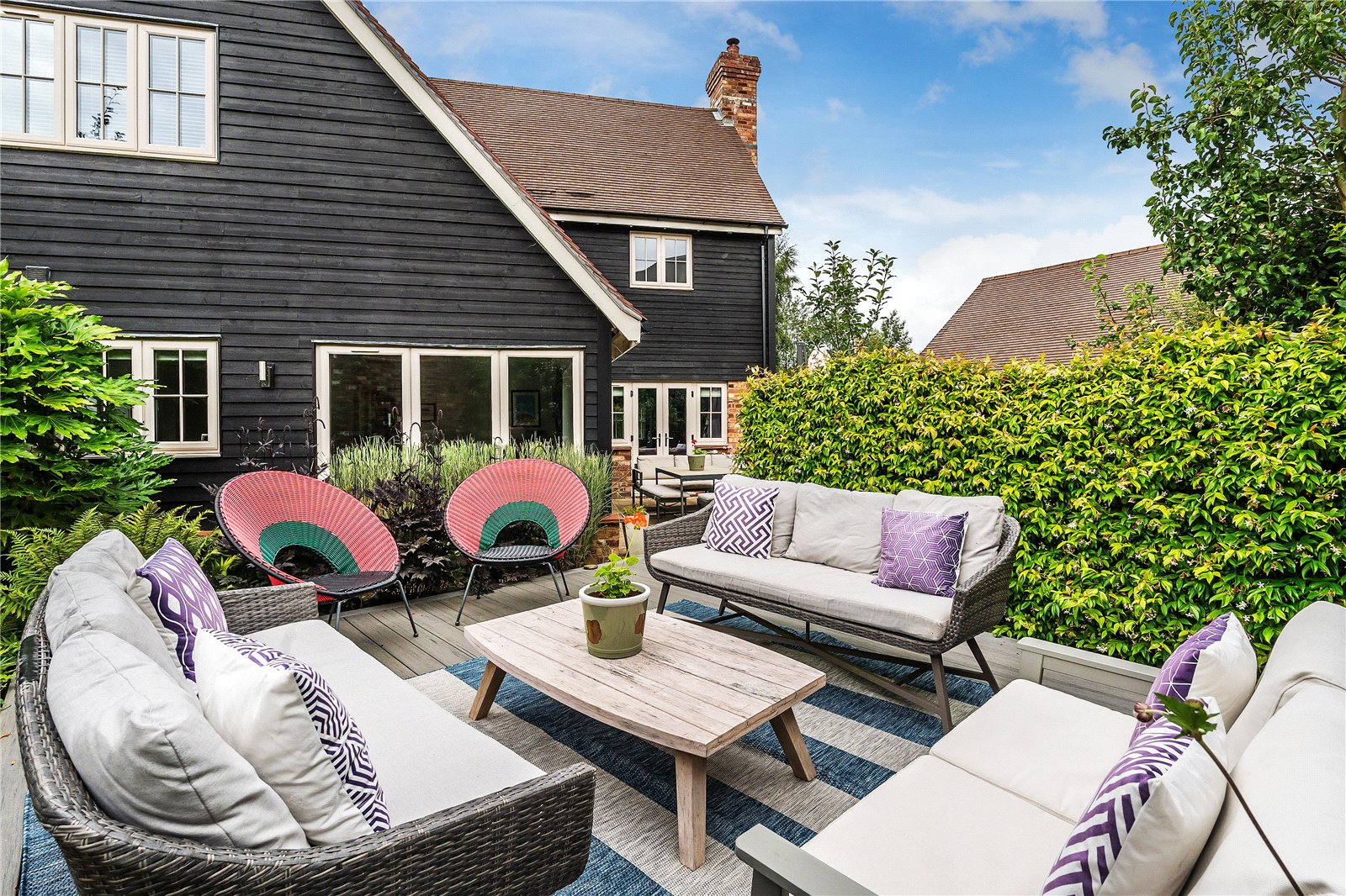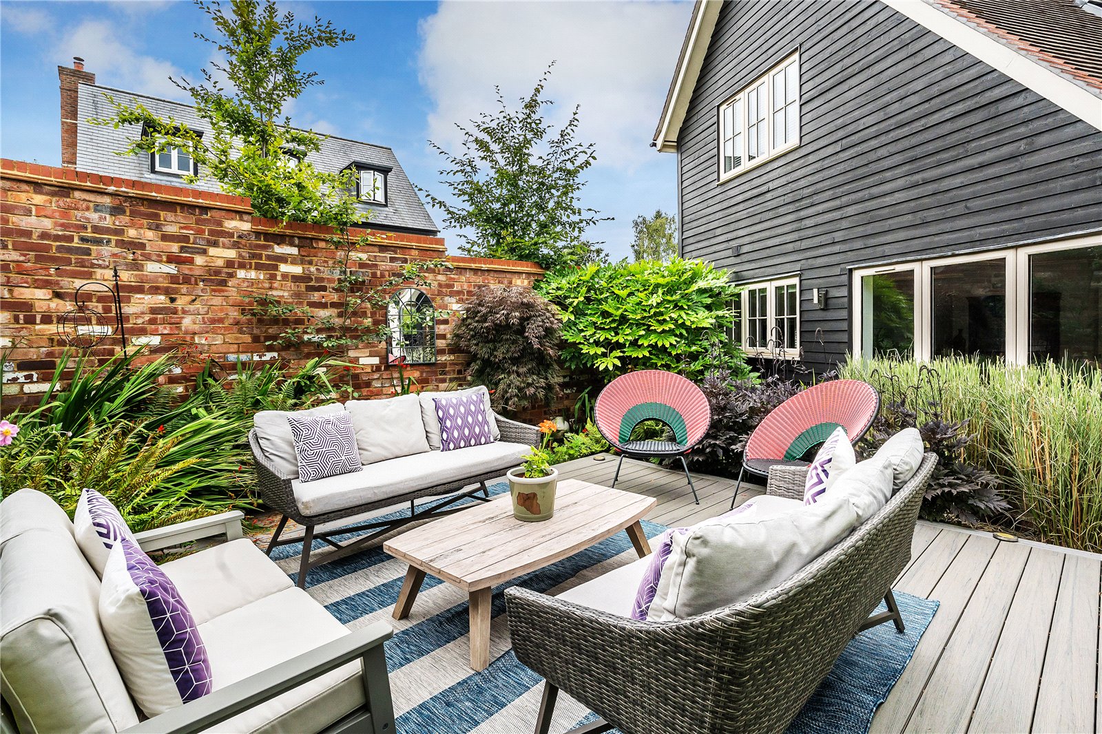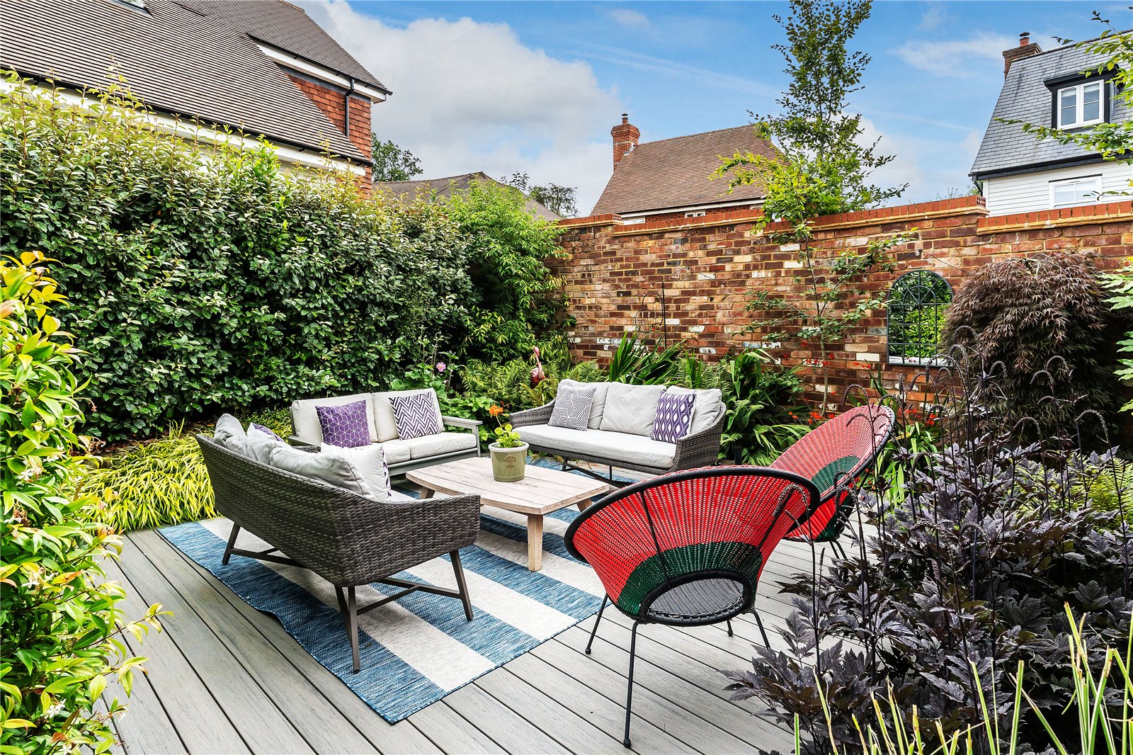 The rear garden wraps around the house, with a large patio area adjacent to the kitchen/breakfast/family room. This well-designed area is perfect for alfresco dining whilst overlooking a lawned area which has two apple trees and a pear tree. To the rear of the garden is access to the garage block. A clever “living wall” has been started to soften the side elevation of the garage. To the right of the garden is a raised decked area which is enclosed on two sides by a high privacy wall and a screened wall of jasmine which flowers during the summer. This perfect sun trap is beautifully planted with an array of summer grasses, an acer tree, Japanese anemone and an abundance of perennials selected to give this area an all-year-round display of colour, contrast and interest.