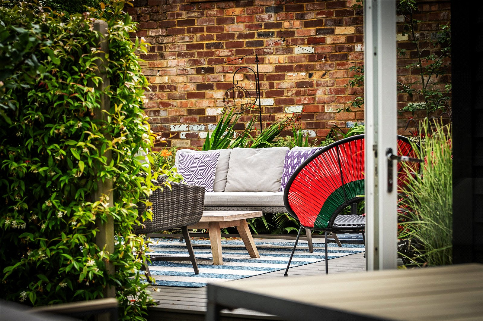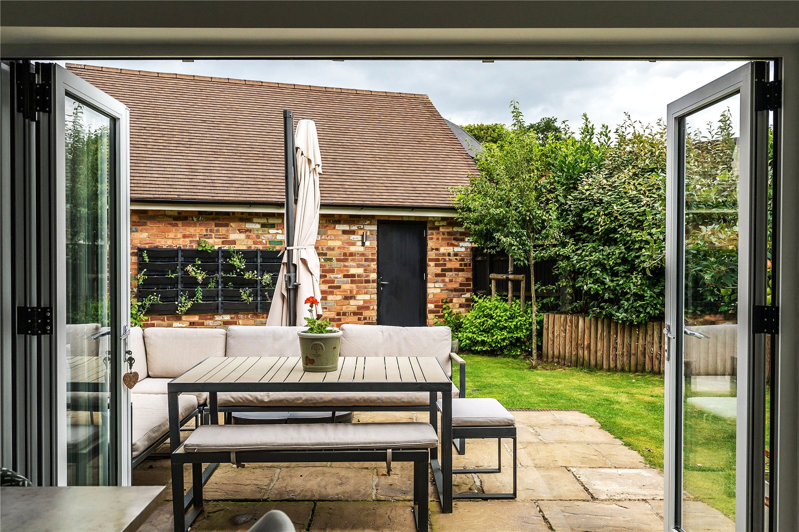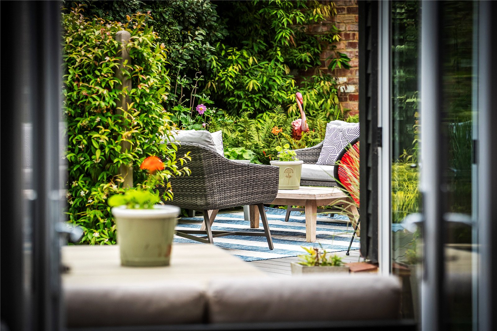 The rear garden wraps around the house, with a large patio area adjacent to the kitchen/breakfast/family room. This well-designed area is perfect for alfresco dining whilst overlooking a lawned area which has two apple trees and a pear tree. To the rear of the garden is access to the garage block. A clever “living wall” has been started to soften the side elevation of the garage. To the right of the garden is a raised decked area which is enclosed on two sides by a high privacy wall and a screened wall of jasmine which flowers during the summer. This perfect sun trap is beautifully planted with an array of summer grasses, an acer tree, Japanese anemone and an abundance of perennials selected to give this area an all-year-round display of colour, contrast and interest.
