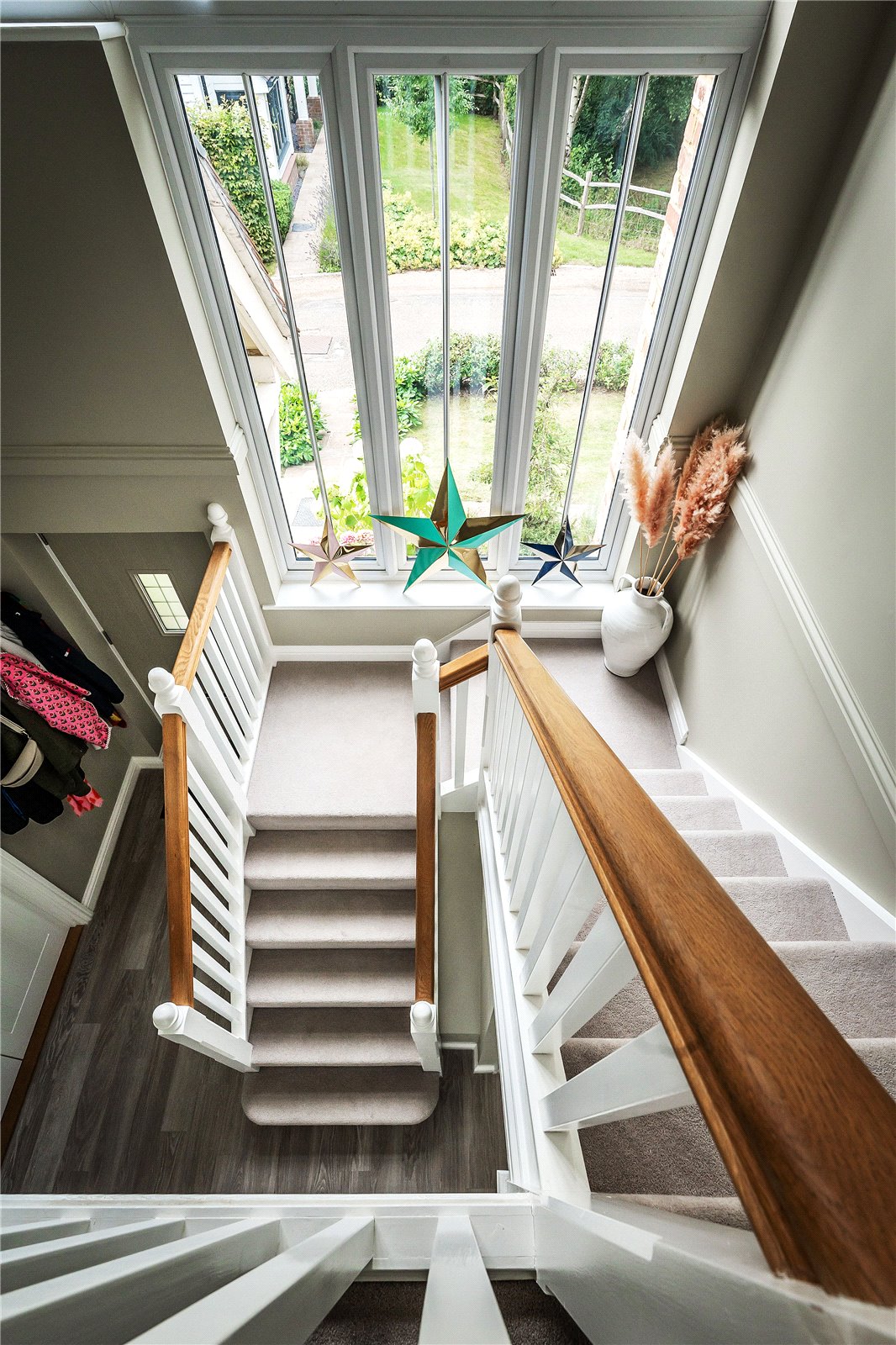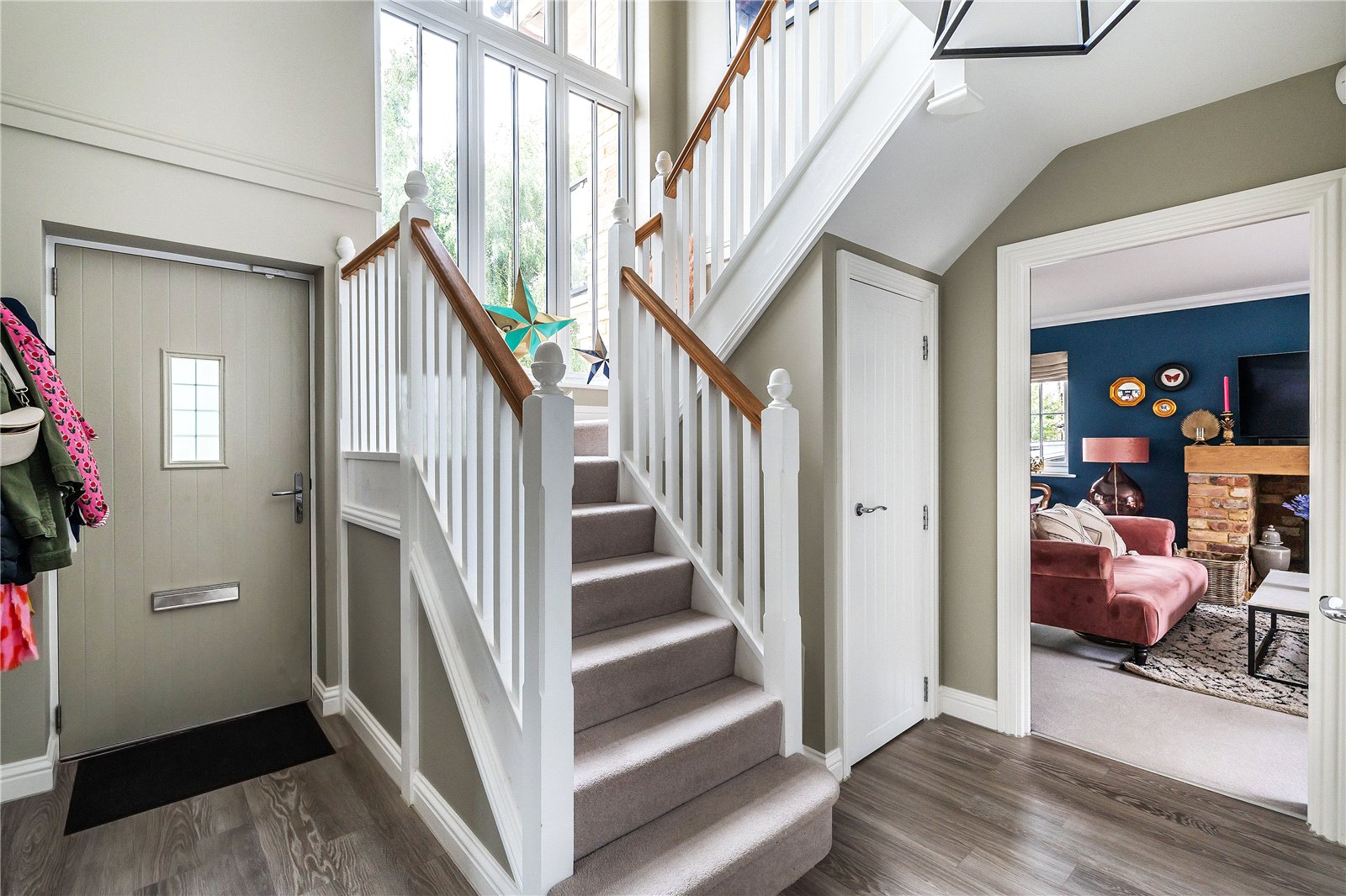 The covered entrance porch opens into the vaulted and galleried reception hall, with light flooding in from the incredible glass front elevation. The subtle grey limed oak effect Karndean flooring gives an immediate indication to the luxurious finishes that have been installed throughout the home.