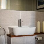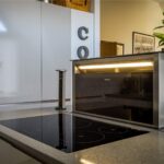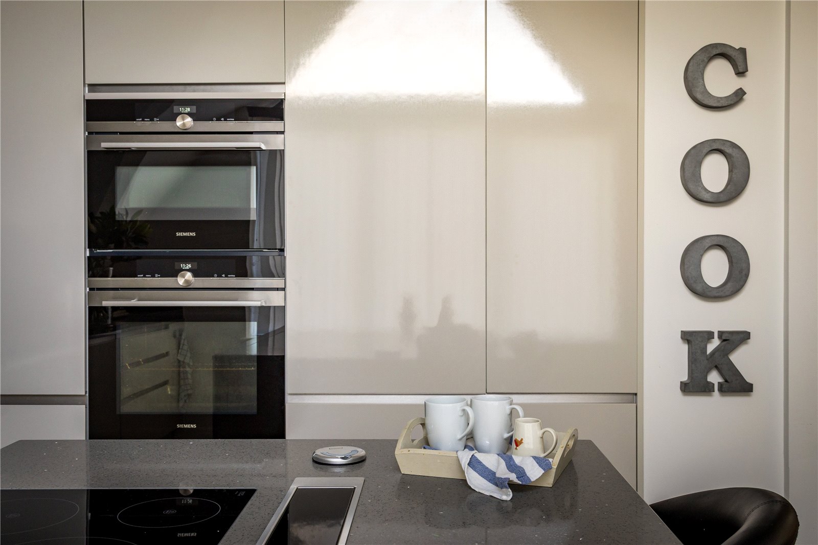 A beautifully modern Porcelanosa high gloss kitchen incorporating stone worktops with glass upstands has ample cabinetry. With two integrated Siemens multifunction fan-assisted ovens and a separate fitted microwave oven. Inset induction hob with a clever “downdraft” retractable extractor, integrated tall fridge/ freezer, and integrated dishwasher.