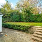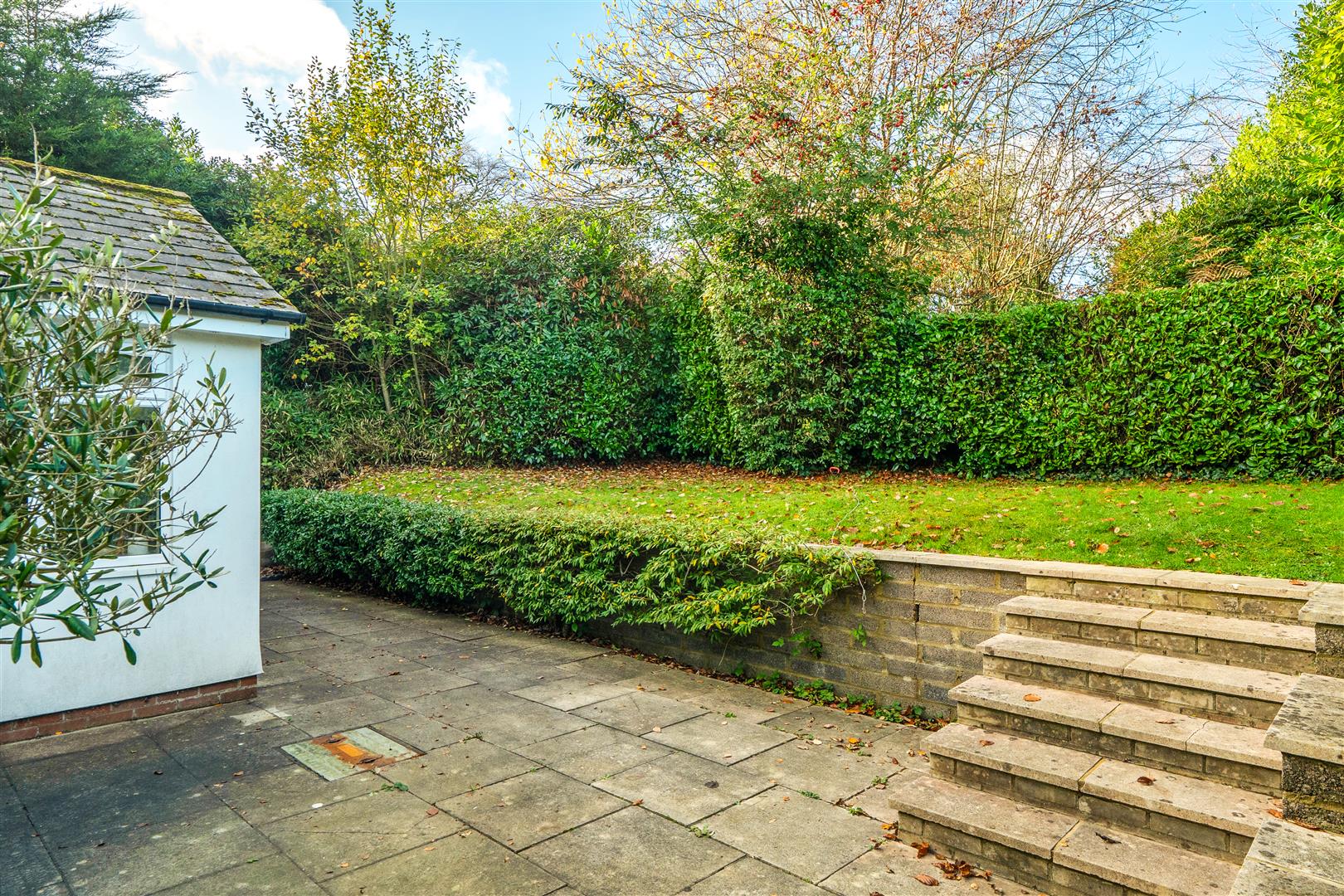 Outside there is a small raised lawned area, large patio, single garage and driveway for parking.