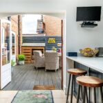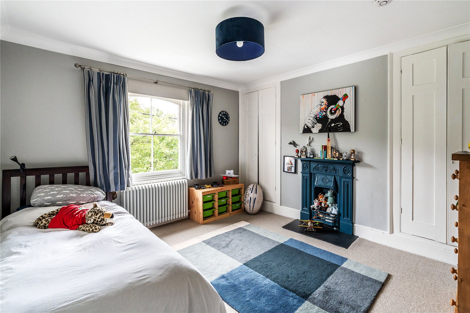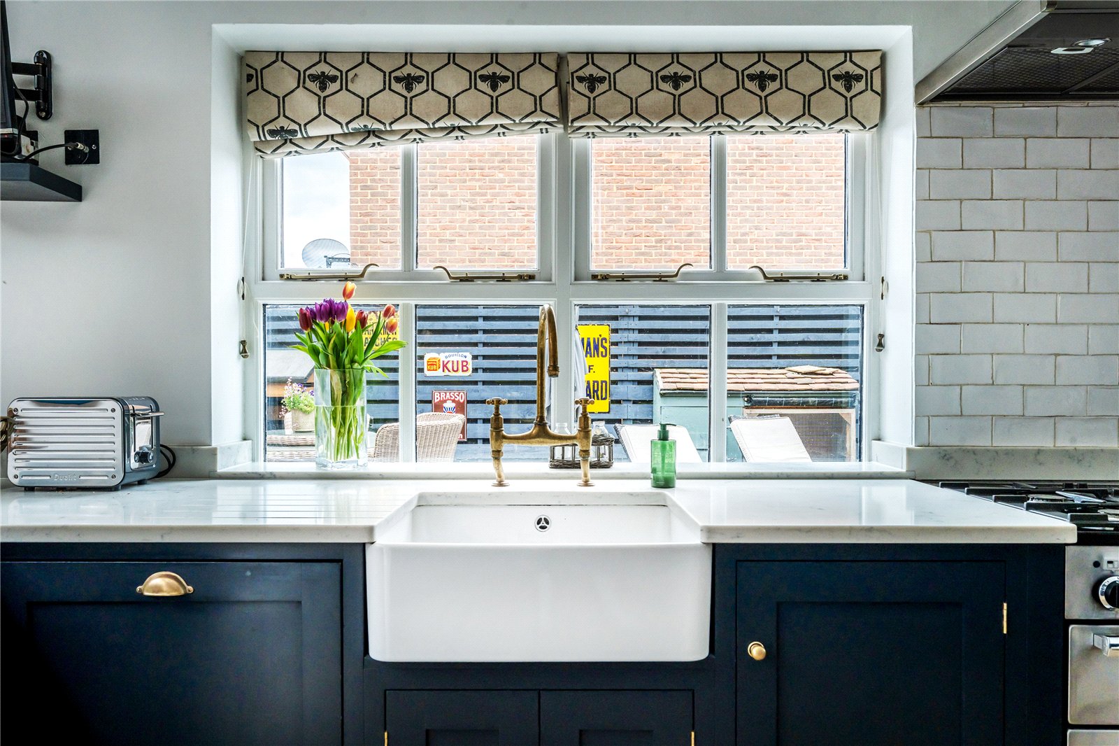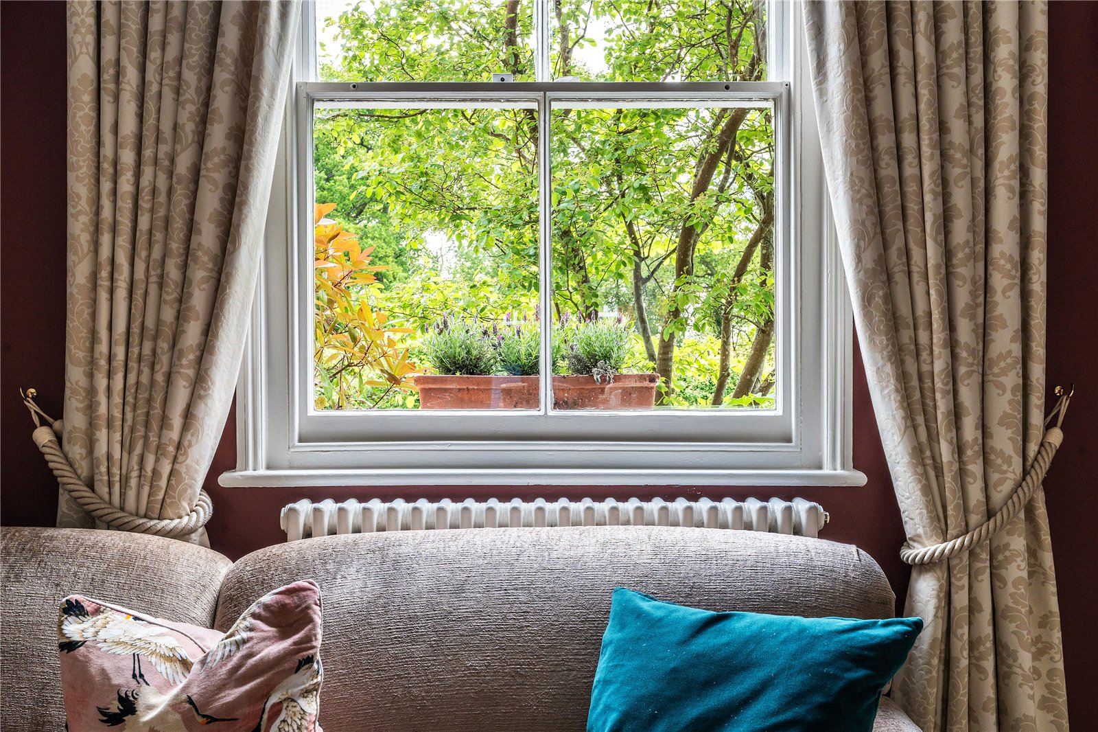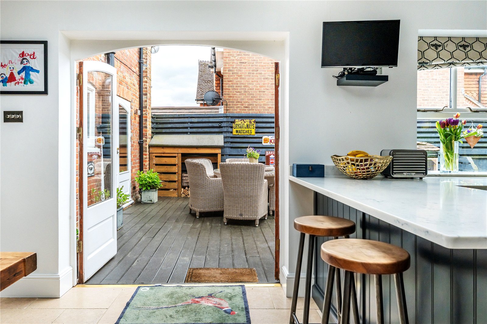 Two character-filled reception rooms flank the spacious entrance hall, each with sash windows, wooden floors, and fireplaces. The sitting room opens out onto the decked rear terrace and on to the gardens via French doors, providing an ideal entertaining space and link with the kitchen space.