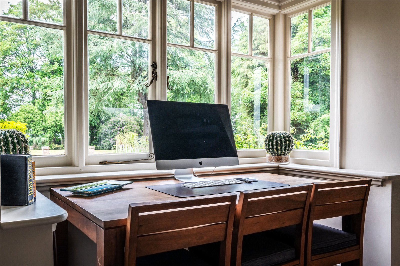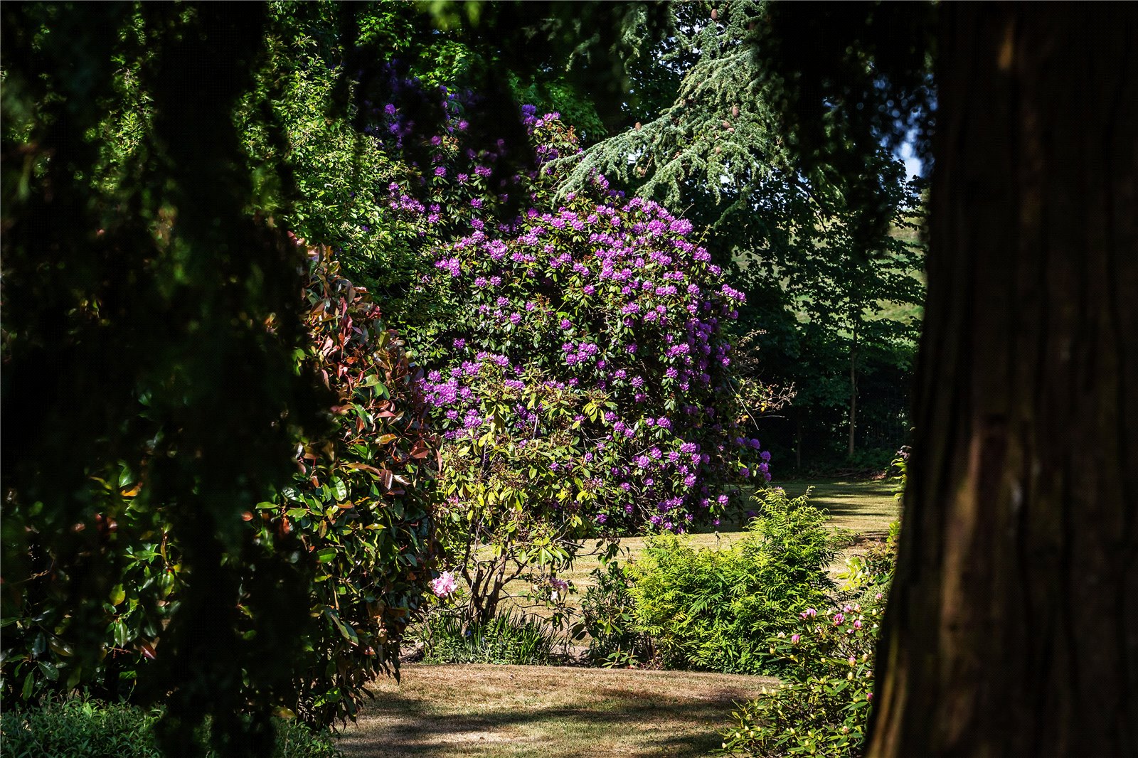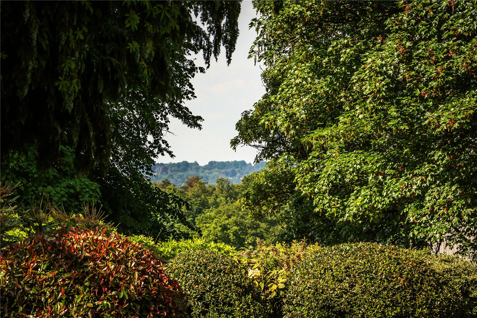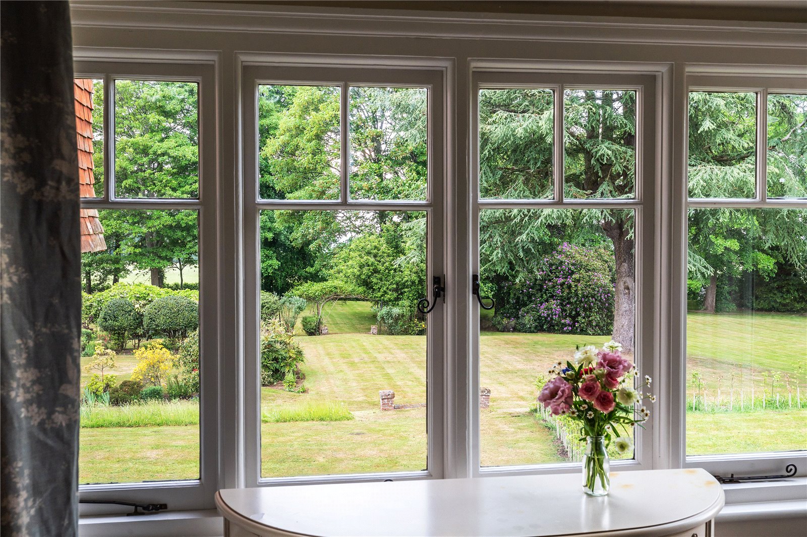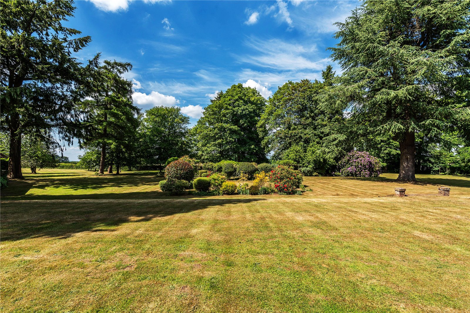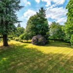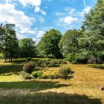 The grounds, extending to approximately 3.55 acres, are beautifully landscaped and planted with mature trees, including oak, beech, and birch. The northern garden features a more formal layout, with intersecting walkways and traditional rose beds. To the south, open lawns offer a sense of space and serenity, framed by magnificent woodland views.