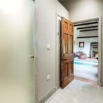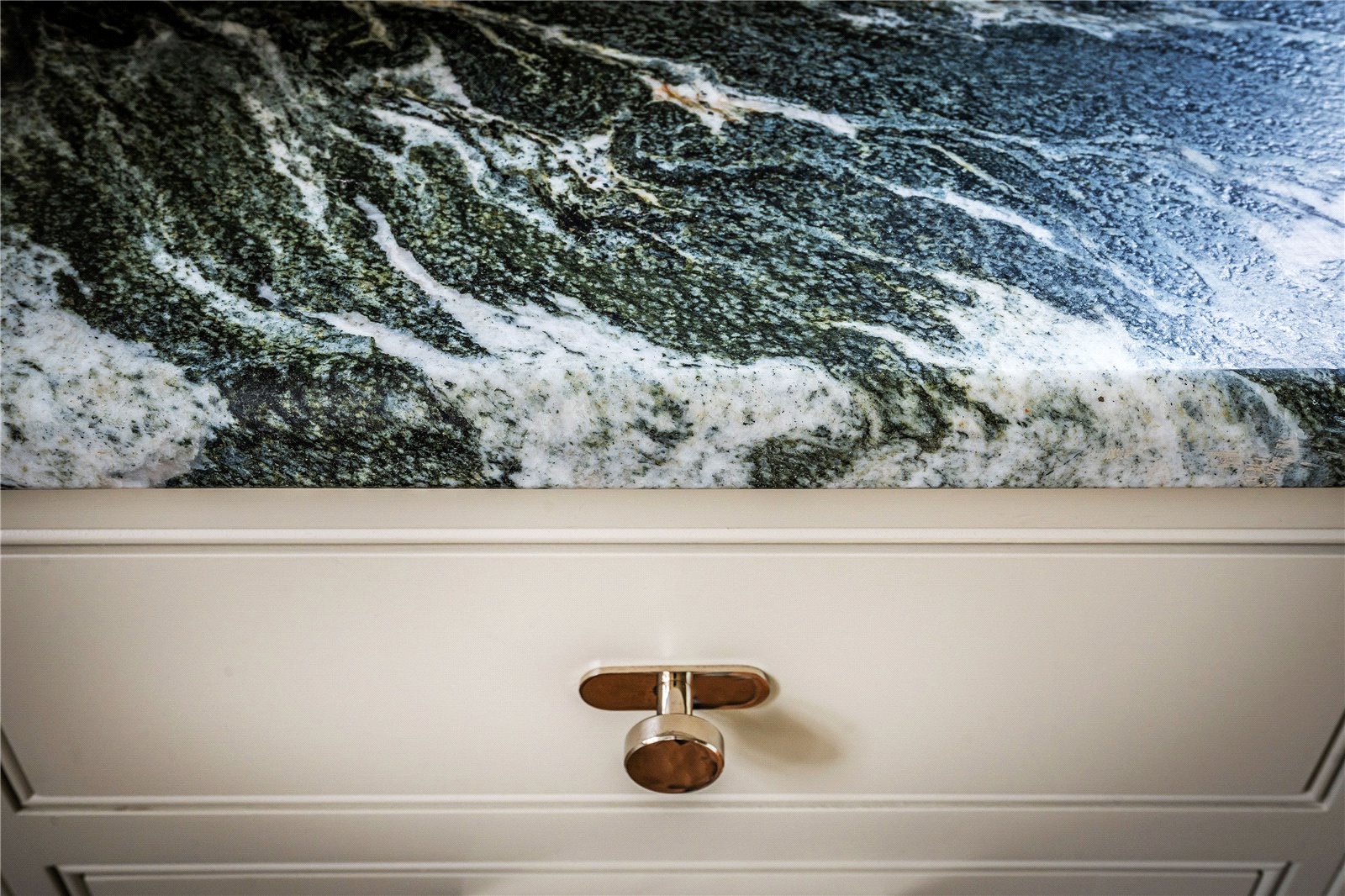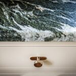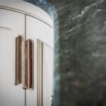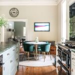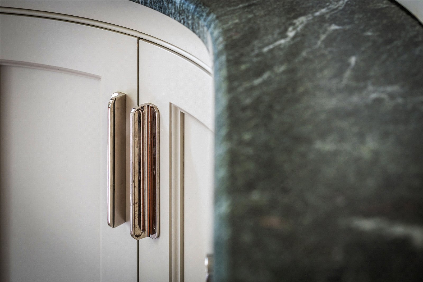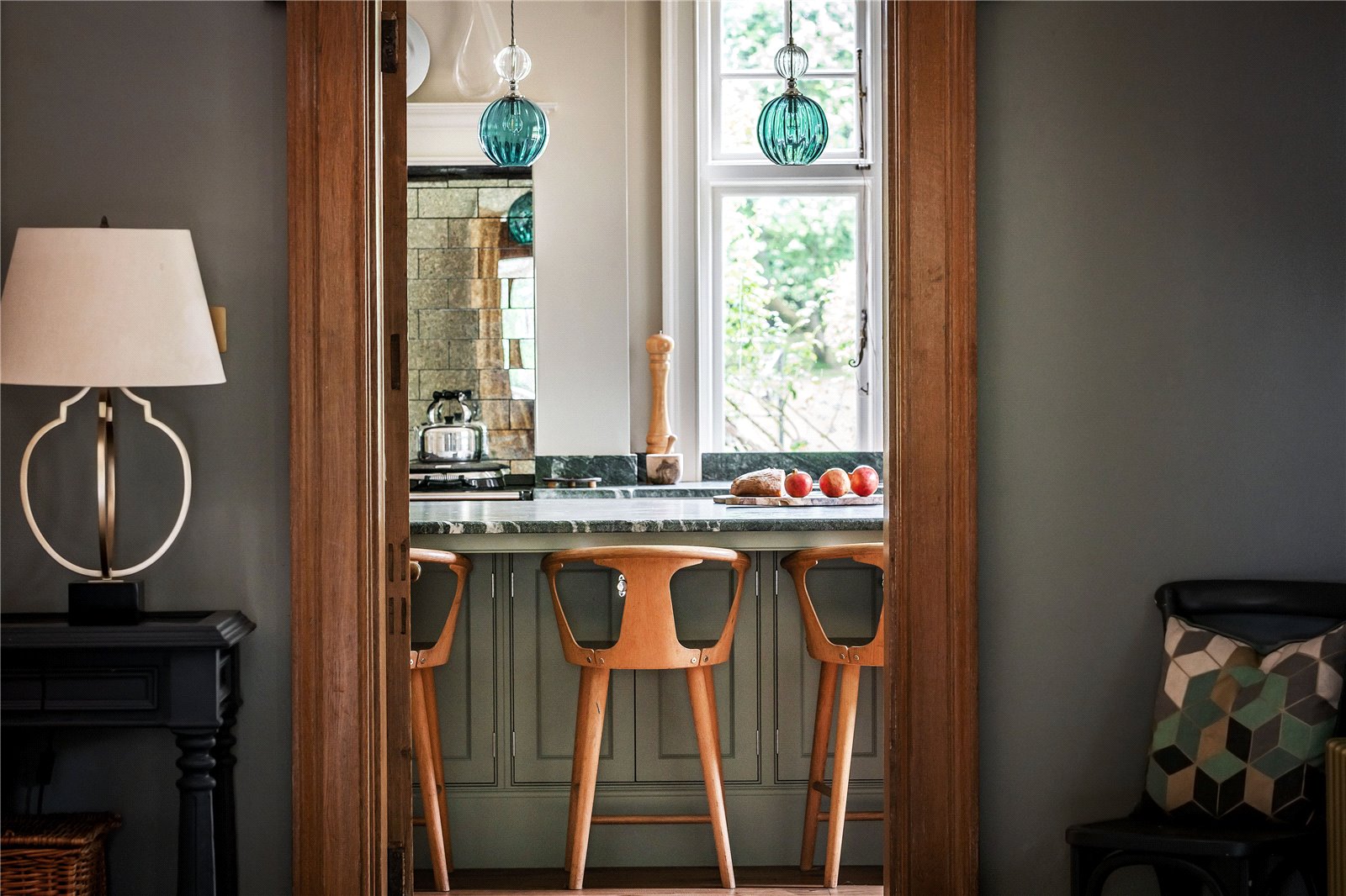 To the right of the hall is a newly installed luxury kitchen, designed and handcrafted by Ashcrest Joinery. This exquisite, bespoke kitchen features elegantly curved cabinetry, exceptional storage solutions, and Verdi Italia satin granite countertops. Carefully considered lighting enhances the refined design, while the layout has been tailored to suit both everyday living and entertaining.