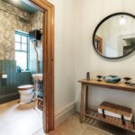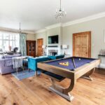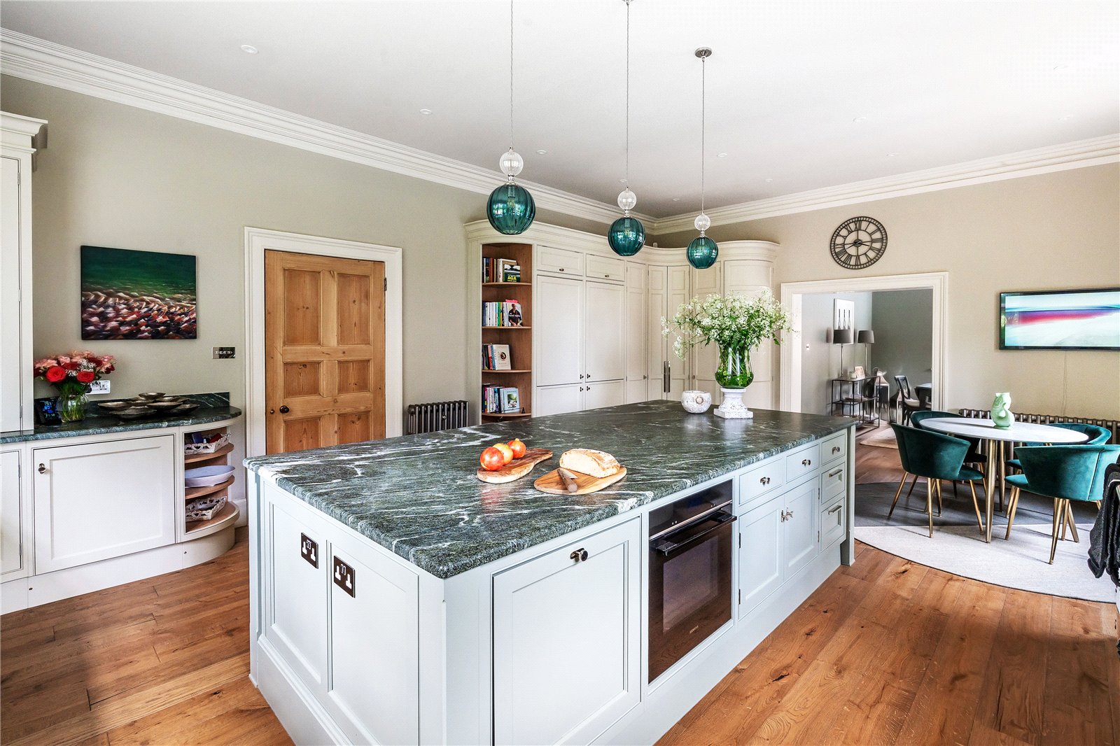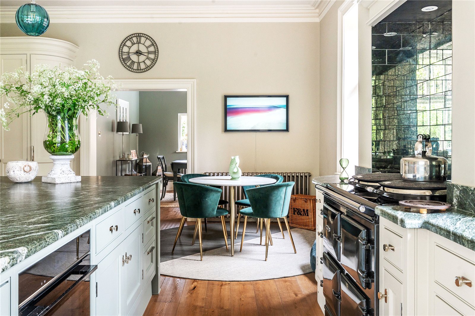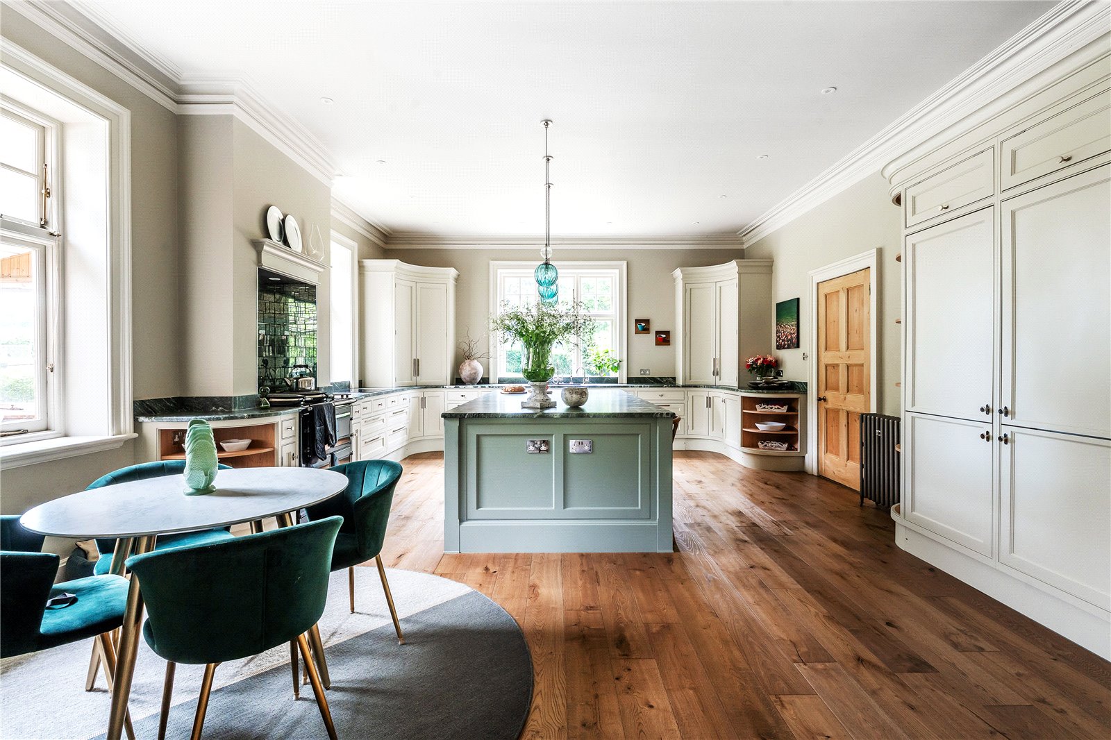 A standout feature is the Regency-inspired curved cabinetry, designed to align seamlessly with the ceiling height. Cornice detailing echoes the curvature of the cupboards, creating a harmonious and sophisticated aesthetic throughout. State-of-the-art appliances include a four-oven Aga, additional summer oven, Siemens induction hob, two Asko dishwashers, and twin Liebherr fridge and freezer units. A Perrin & Rowe tap offers instant boiling water.