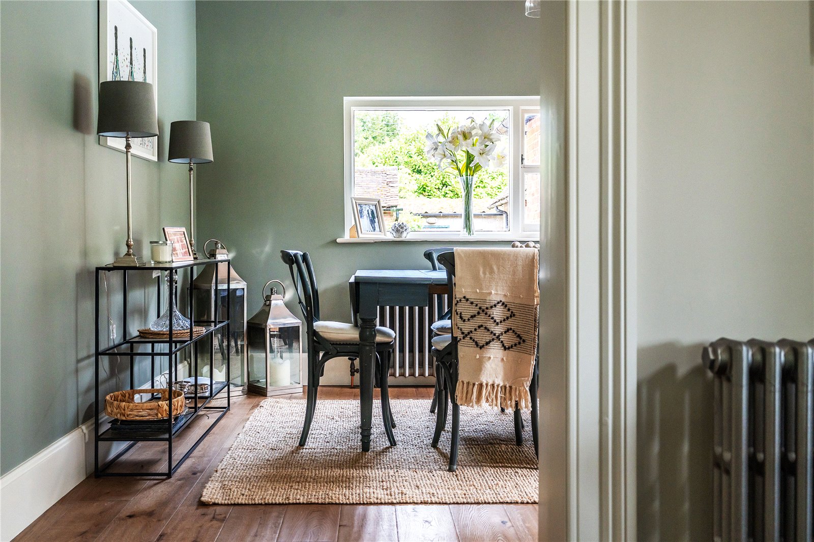Beyond the central island with breakfast bar, there is space for a family breakfast table, with wide access into the formal dining room and adjacent timber-framed conservatory. Planning permission (Ref: WA/2023/02123) has been granted for the replacement of the conservatory with a substantial orangery.