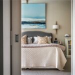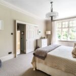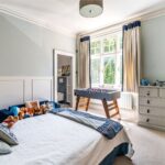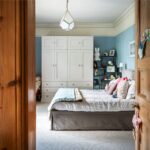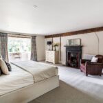 The galleried landing leads to the magnificent principal suite, positioned to take full advantage of its southerly aspect and far-reaching views across the gardens and fields. A few steps descend into a well-appointed dressing room, which in turn opens into a luxurious en suite bathroom, complete with walk-in shower, shaped bath, and twin basins set within a bespoke vanity station.