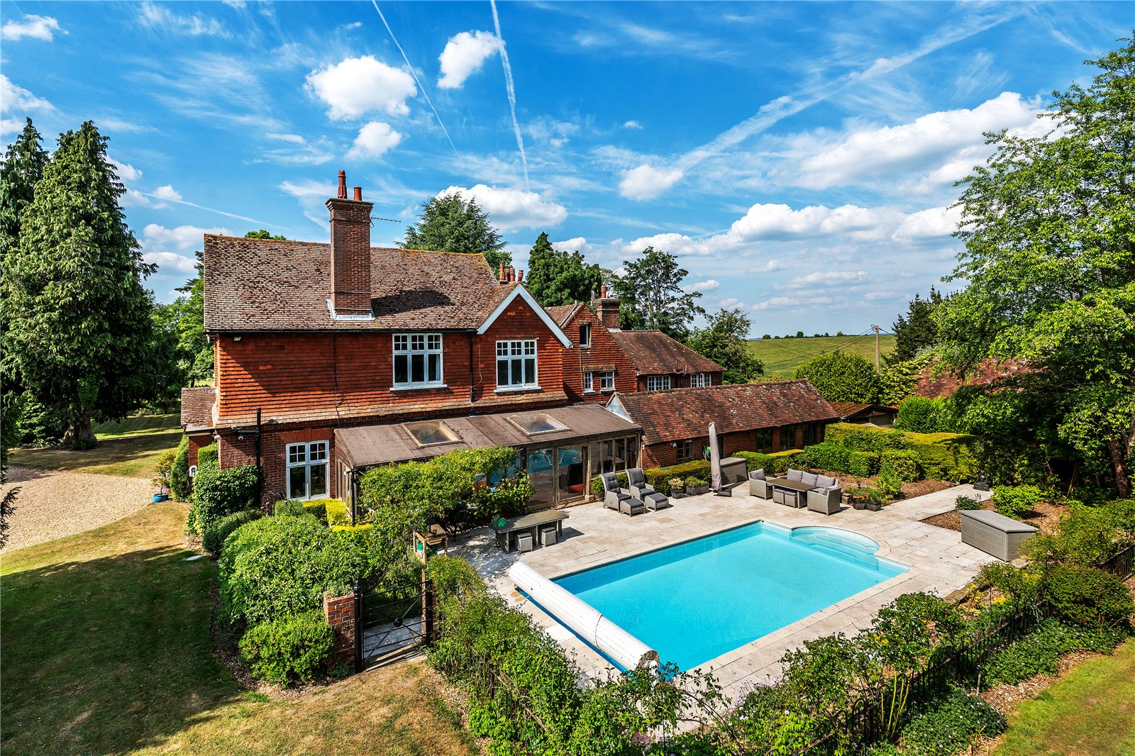 £11,000 pcmA magnificent six bedroom Country House with outstanding views over rolling countryside. Benefitting from a four car heated garage, swimming pool with pool house, tennis court with small pavilion all within approximately 3 acres.6 Bedrooms7 Bathrooms5 Receptions6 Bed 7 Bath -
