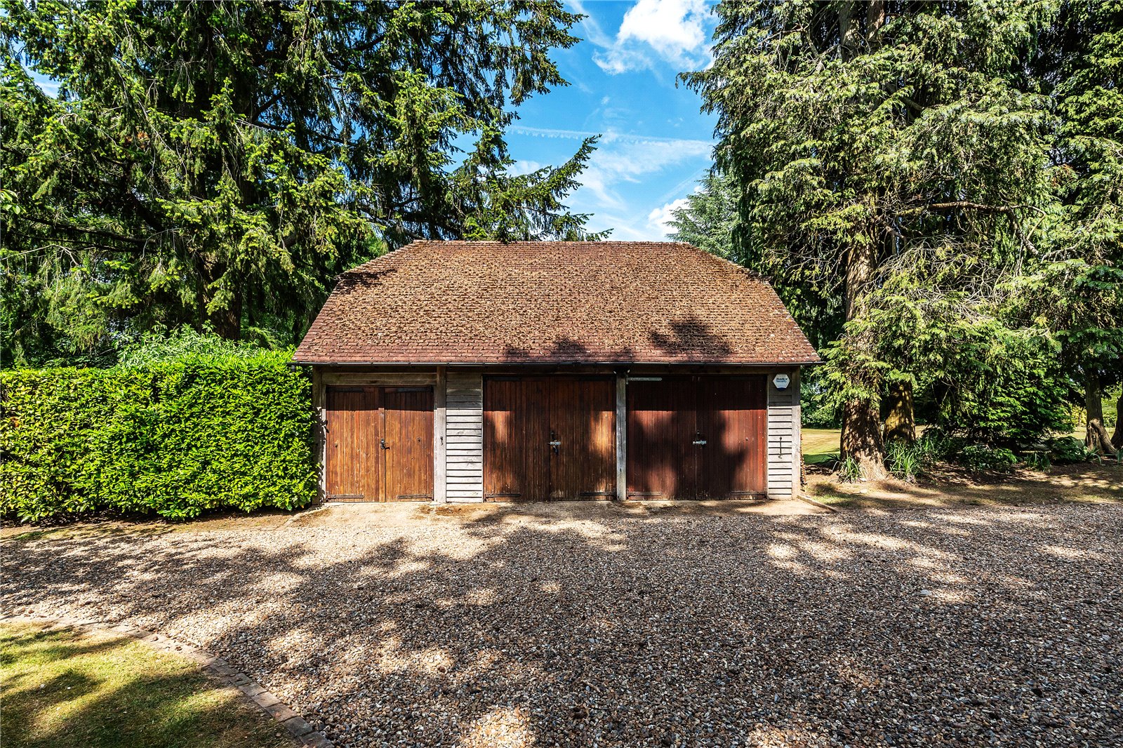 The house is approached via a tree-lined private drive accessed through electric gates. The driveway passes a substantial brick-built triple garage with mezzanine storage above, eventually arriving at a generous forecourt with parking for several vehicles.