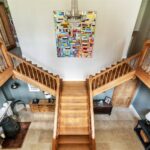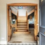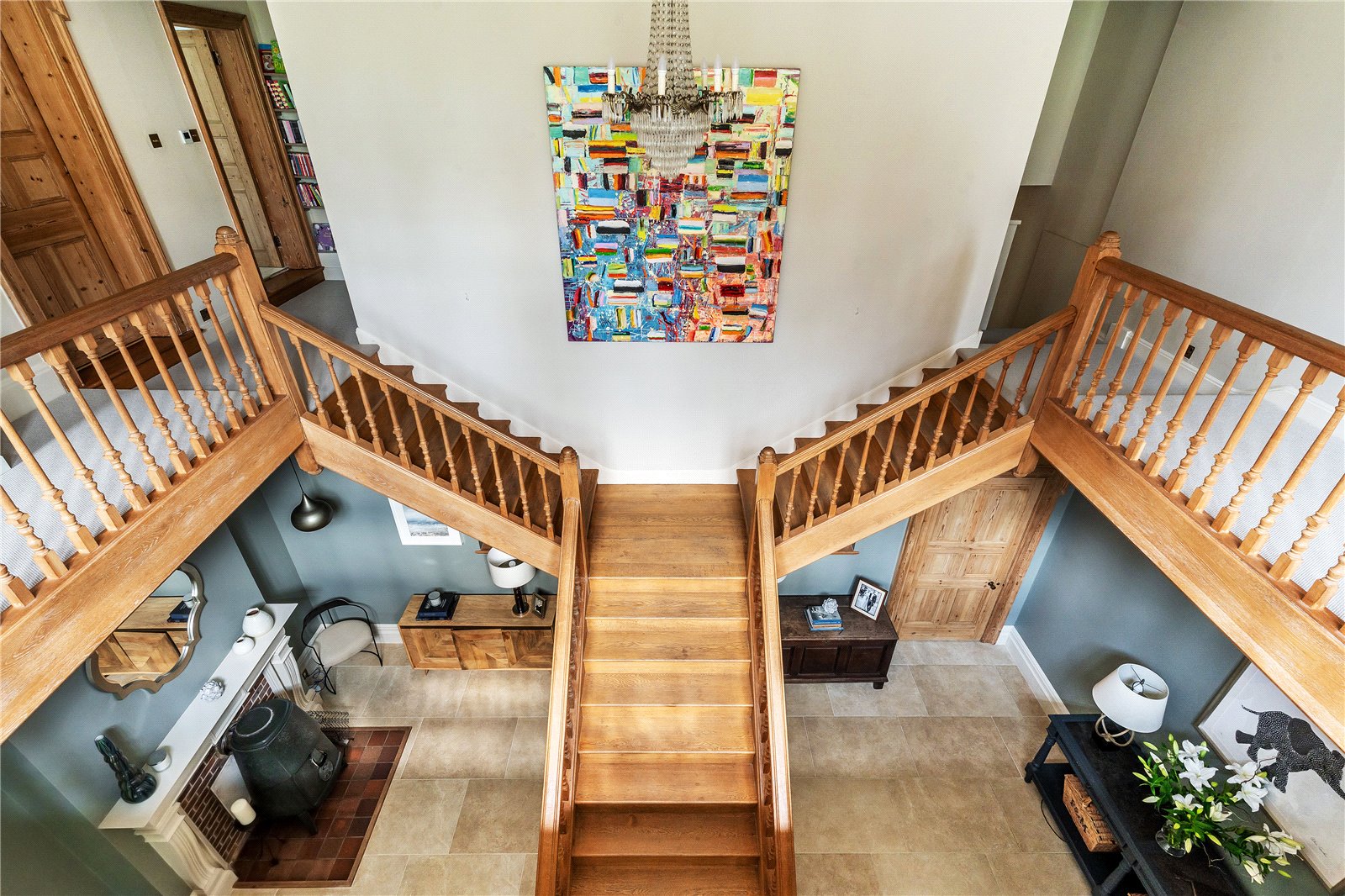 A substantial front door opens to a welcoming inner lobby, complete with coat and bag storage rooms on either side. From here, double-glazed doors lead into a grand reception hall, dominated by a striking oak bifurcated staircase rising to the galleried landing above.