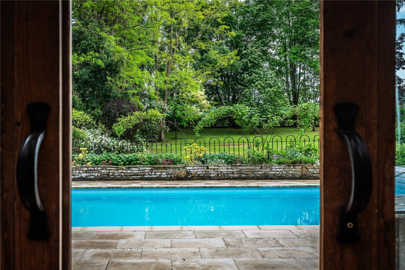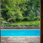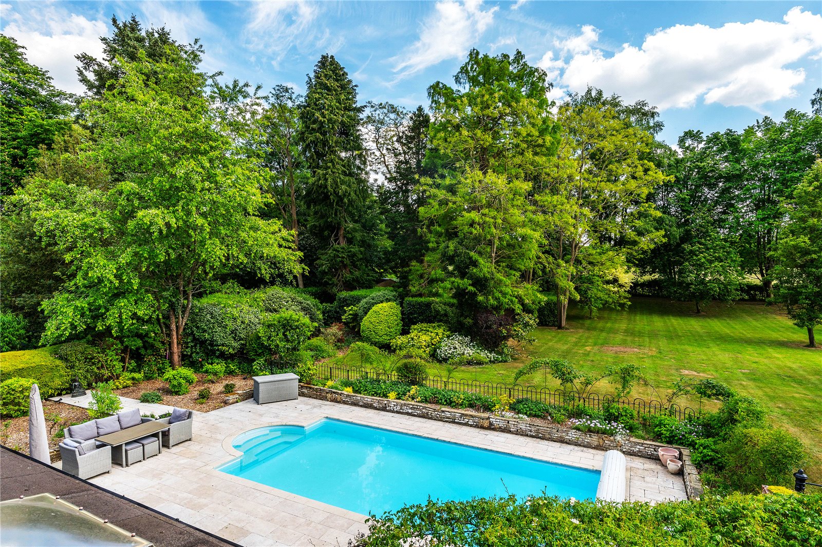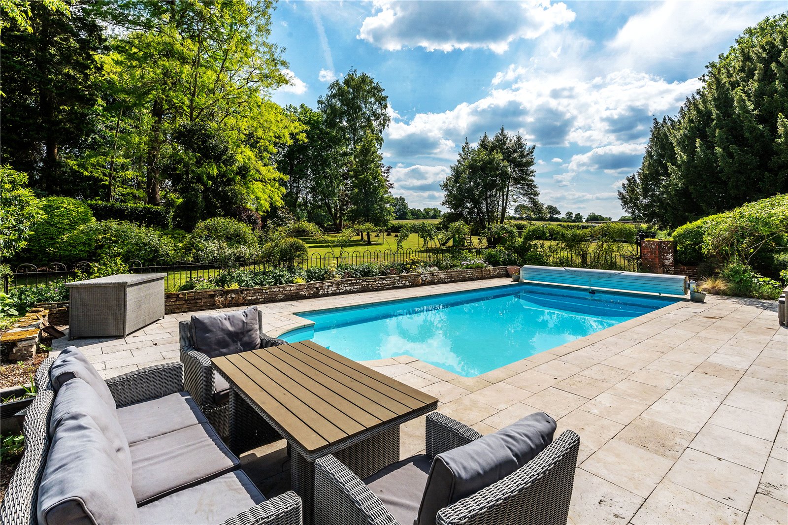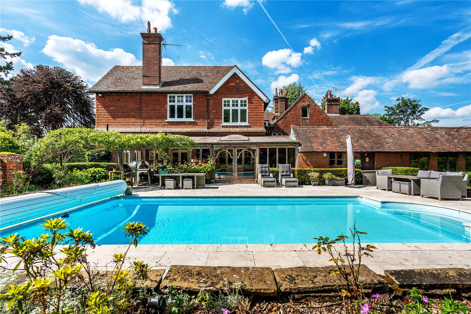 A southerly terrace wraps around a superb heated swimming pool, warmed via an air-source heat pump—ideal for summer entertaining and al fresco dining.