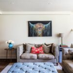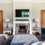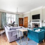 To the left of the hall lies a beautifully proportioned drawing room. With high ceilings and expansive windows overlooking the formal gardens and parkland, the room is bathed in natural light. An open hearth serves as a central focal point, and an adjoining entrance leads down into a cosy family room or snug.