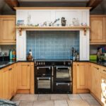 A modern shaker-style kitchen radiates country charm, with ample storage solutions, and a three oven range-style electric cooker. A breakfast bar separates the room with a generous space for a dining table.