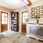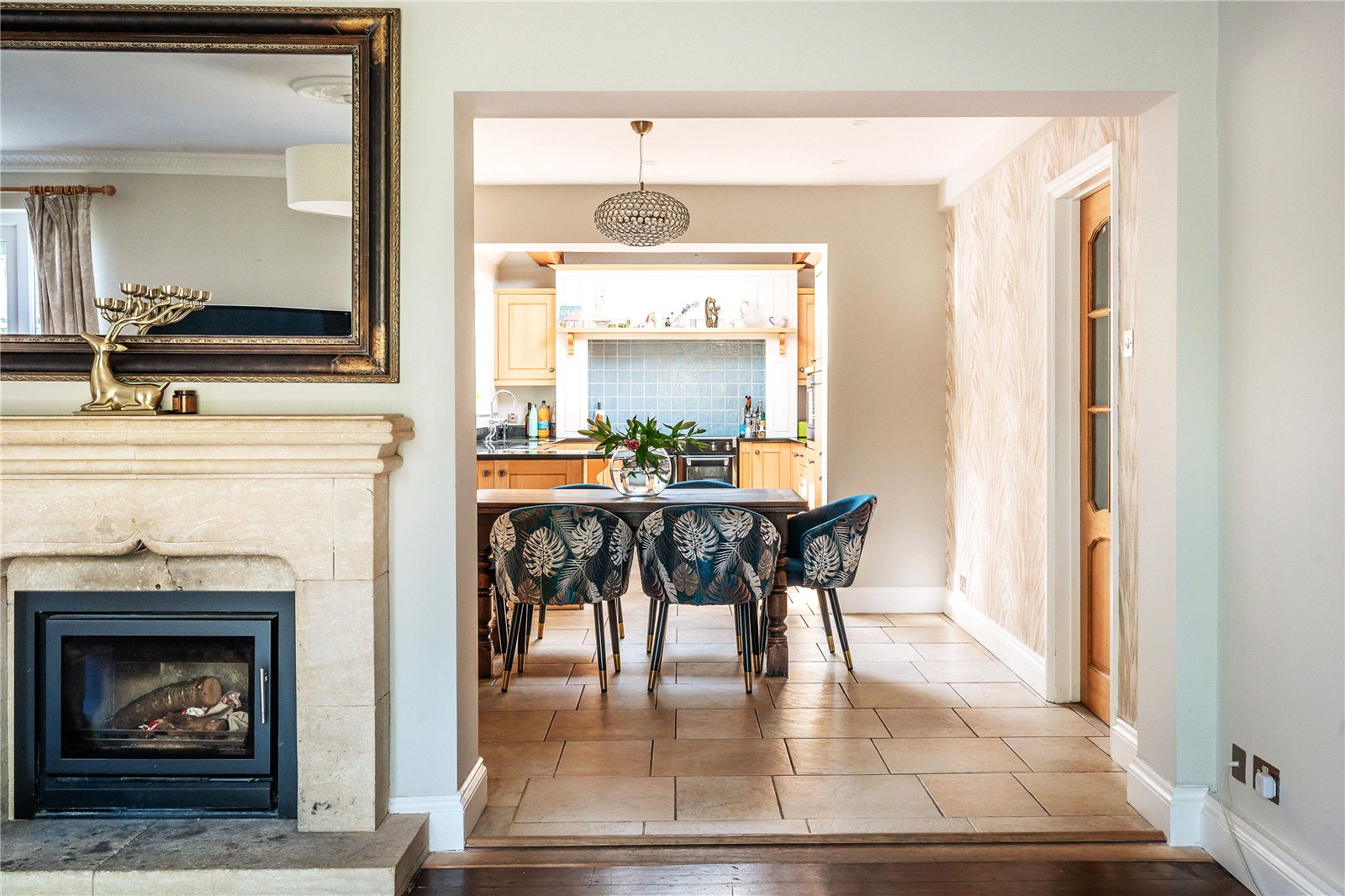 A broad reception hall leads through to the generous sitting/dining room that extends across the full width of the rear of the house. This superb space enjoys two sets of double doors out to the garden, and a delightful fireplace with wood burning stove.