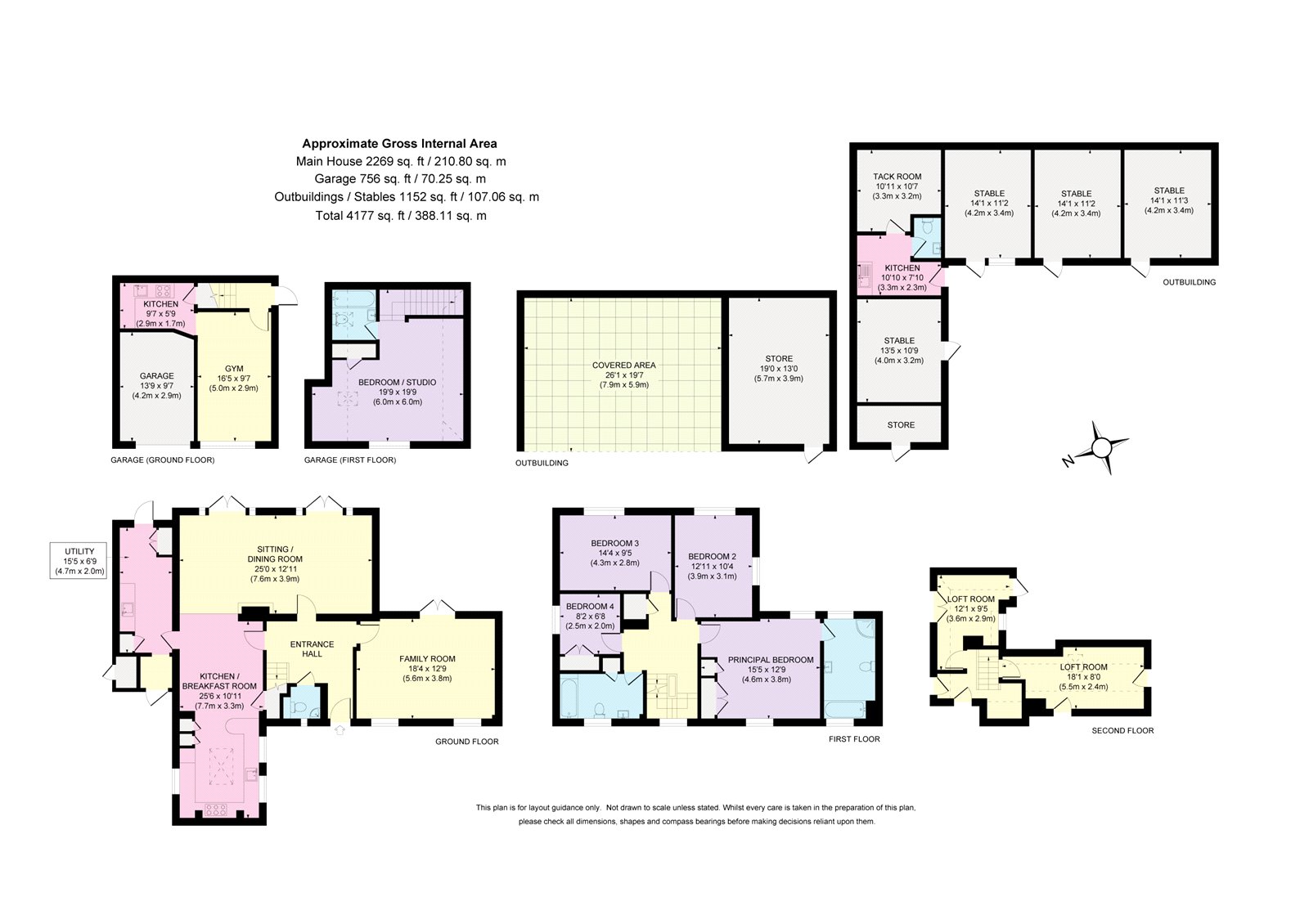 The first-floor accommodation is equally impressive. The principal bedroom suite has a range of fitted wardrobes, a full en-suite bathroom and superb views over the garden and paddocks beyond. There are three further bedrooms and a family bathroom on this floor, and a partially converted loft space has been added to create two further occasional rooms.