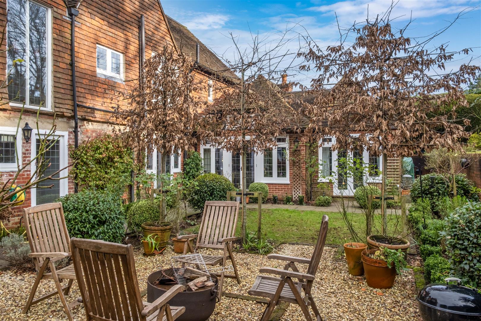 Wyecroft is entered via a five-bar electric gate onto a driveway with lots of parking and a large four-bay garage. There is a stunning terrace which covers the garage and used for entertaining during the summer with expansive views across Haslemere. The rear garden is accessed from several sets of french doors to a courtyard garden, steps leading up to a large elevated flat lawned area with large oak tree.