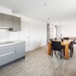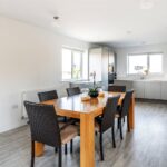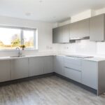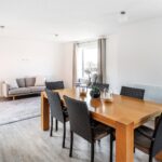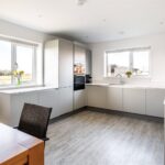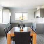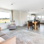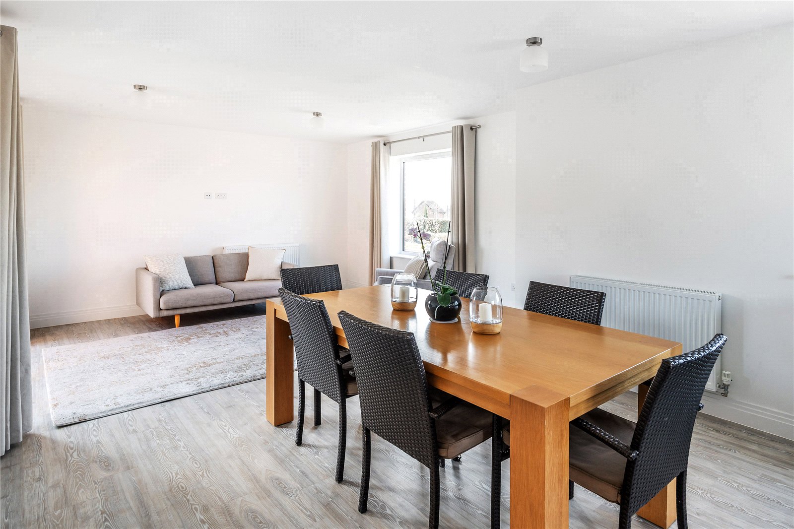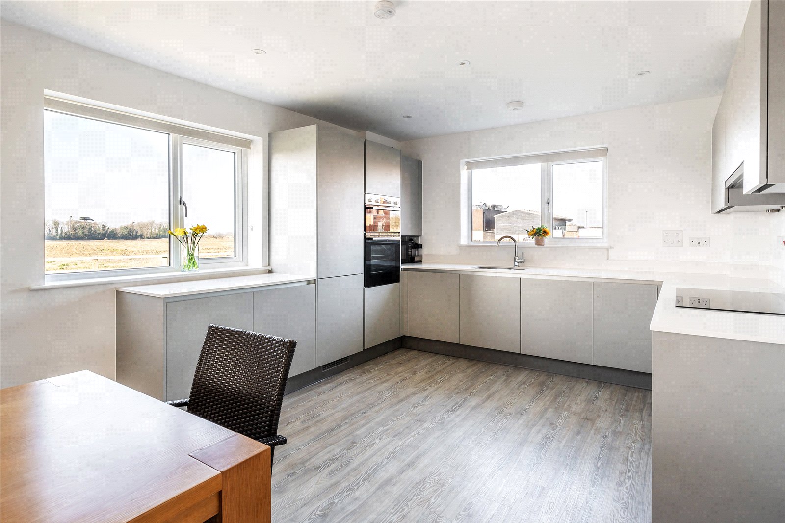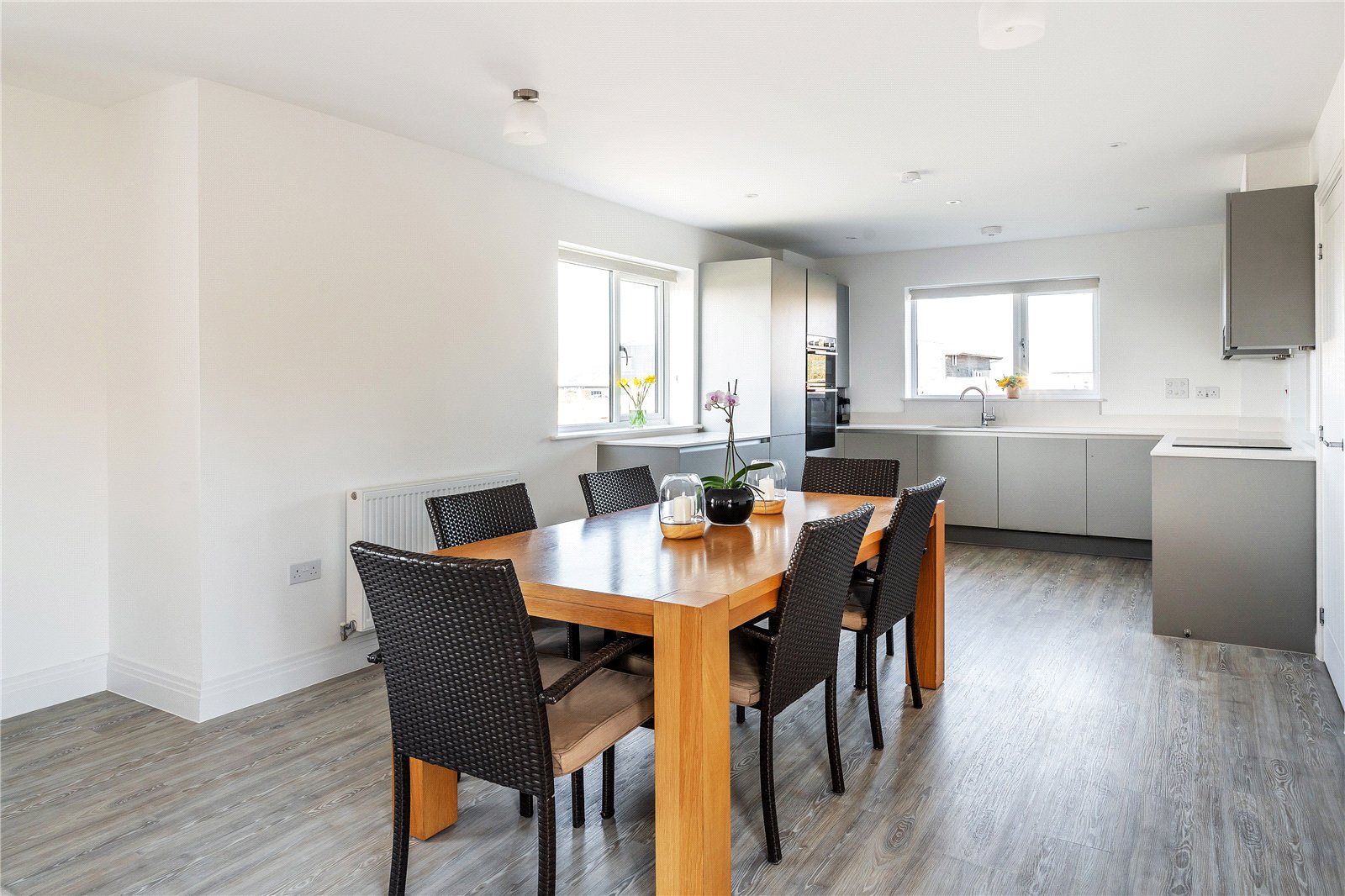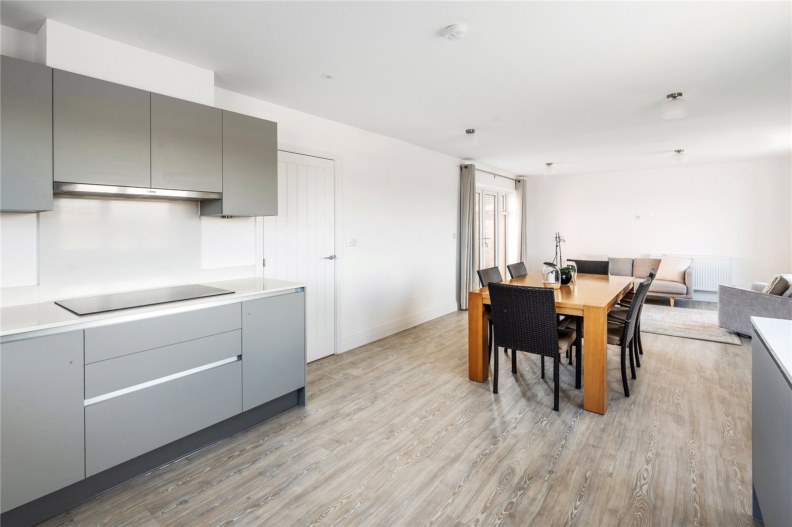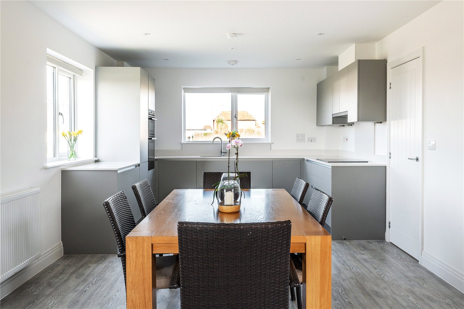 Stepping through the front door, a welcoming central hallway provides access to two generous reception rooms, offering plenty of space for both relaxation and entertaining. The spacious sitting room is particularly inviting, with dual-aspect windows overlooking the garden and French doors that open directly onto the patio, seamlessly linking indoor and outdoor living. Across the hallway, the heart of the home is an outstanding open-plan kitchen and dining space. This beautifully proportioned room is designed with everyday living and entertaining in mind, easily accommodating everything from casual family meals to larger gatherings. Triple-aspect windows frame lovely views across the surrounding greenery, while high-quality Amtico LVT flooring in subtle Scandinavian-inspired tones runs throughout. The kitchen itself combines sleek design with excellent functionality. Contemporary handleless grey cabinetry is paired with elegant white stone worktops, creating a clean and sophisticated look. Integrated Bosch appliances include a double oven at eye level, electric hob, dishwasher, washer/dryer and fridge-freezer, while the generous layout ensures plenty of storage and preparation space. The central dining area acts as a natural focal point, and additional French doors open directly onto the garden terrace, making outdoor dining effortless during the warmer months. Practical touches continue on the ground floor, where a stylish cloakroom provides convenience for guests, and a large storage cupboard beneath the staircase helps keep everyday essentials neatly tucked away.