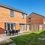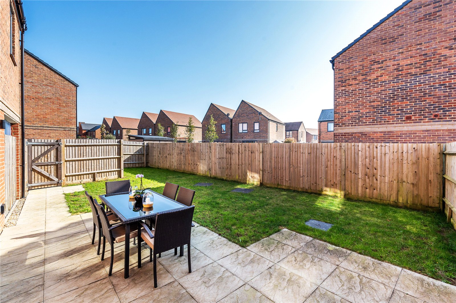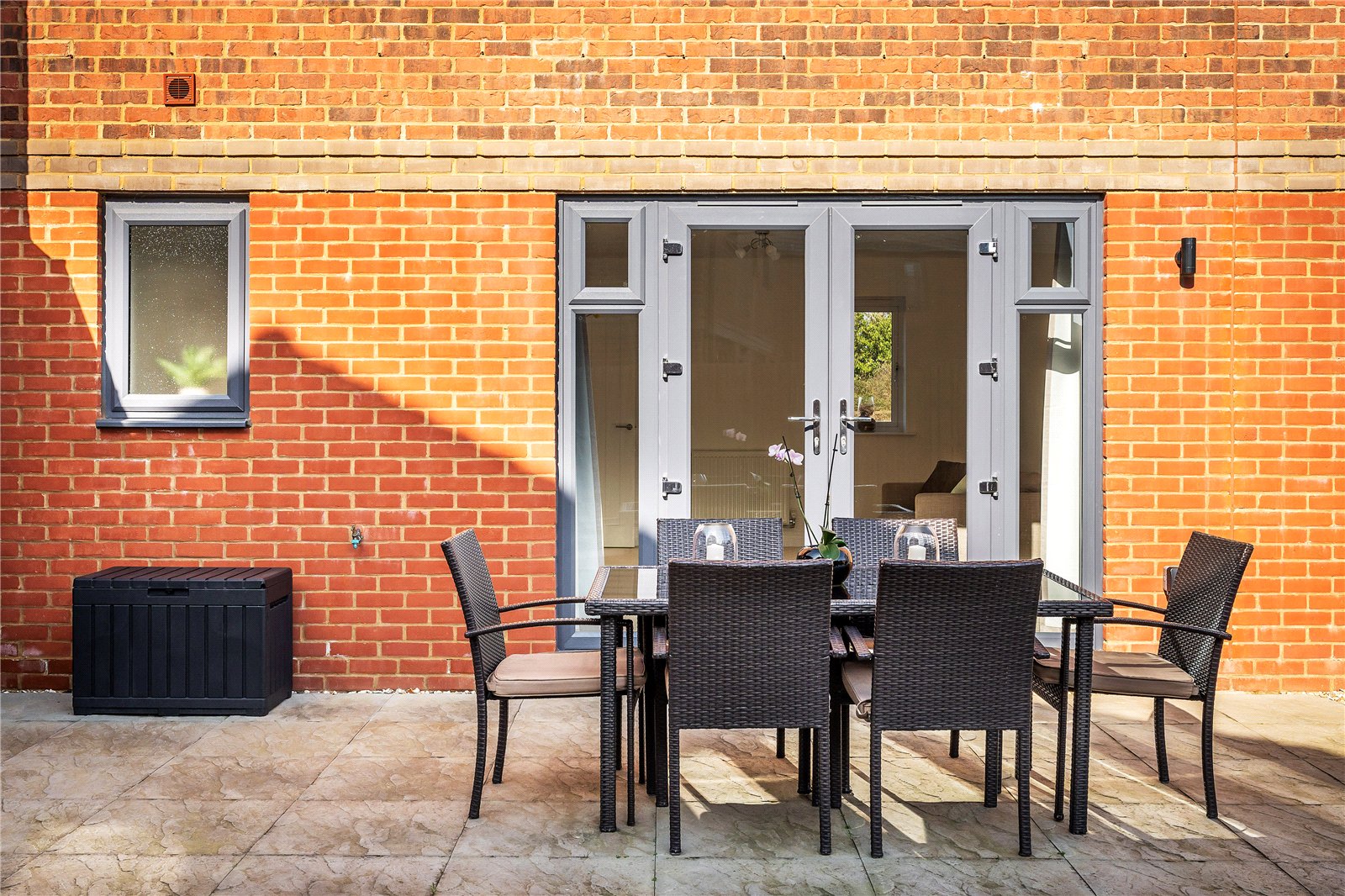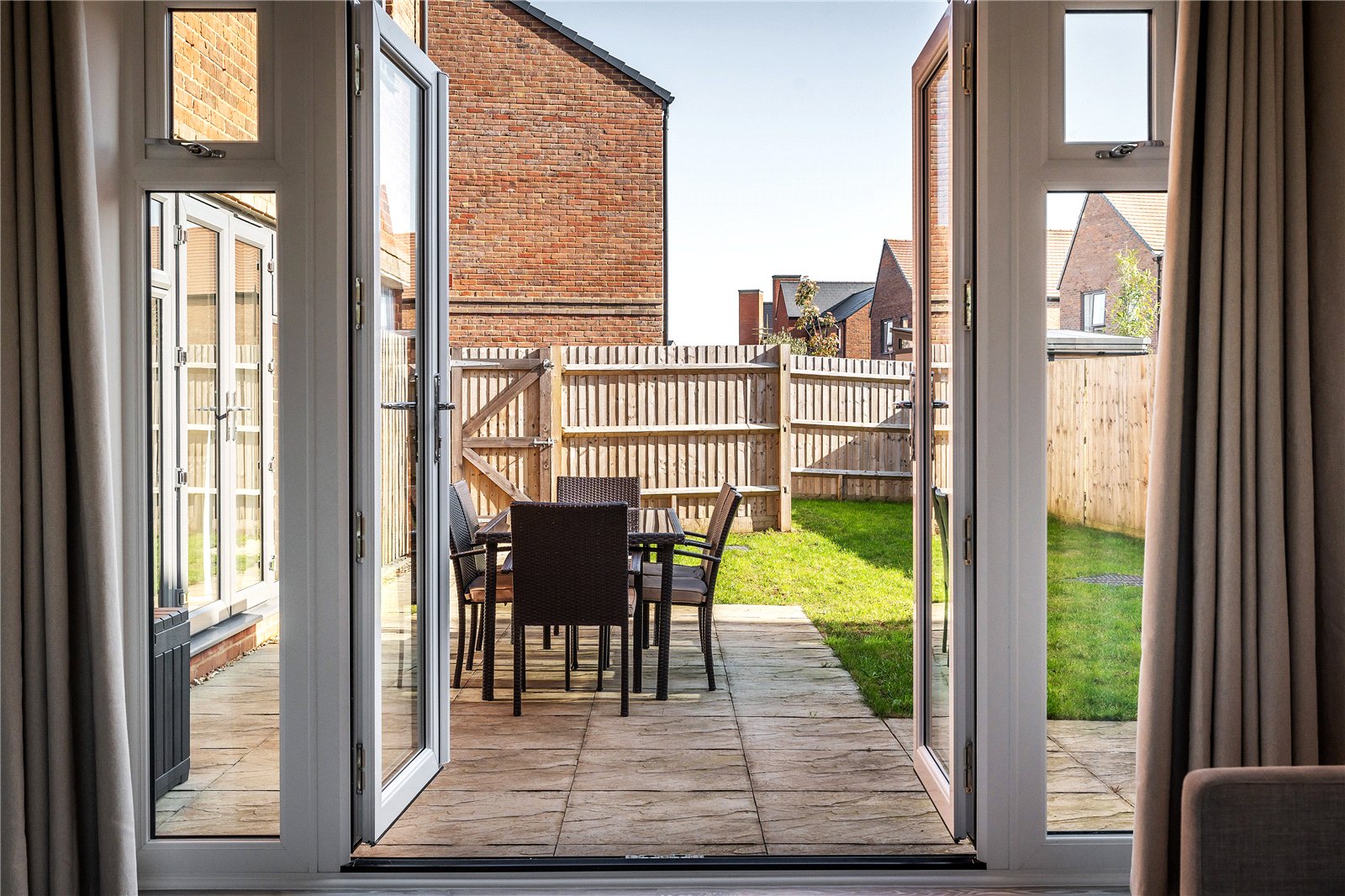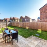 The rear garden is designed to complement the home’s sociable layout. French doors from both the sitting room and kitchen/dining room open onto a wide patio, creating the perfect space for outdoor entertaining, summer barbecues or simply enjoying a quiet coffee in the morning sun. Beyond the terrace, an established lawn offers plenty of room for children to play, with potential to further enhance the garden with planting, borders or a pergola seating area. To the side of the property, a secure timber gate provides direct access to the driveway, allowing guests to easily join outdoor gatherings. The wide driveway and attached garage together offer private off-road parking for up to three vehicles, and an electric vehicle charging point is already installed.