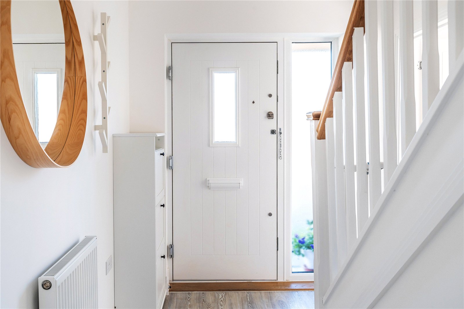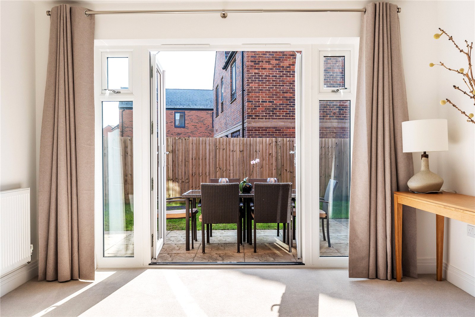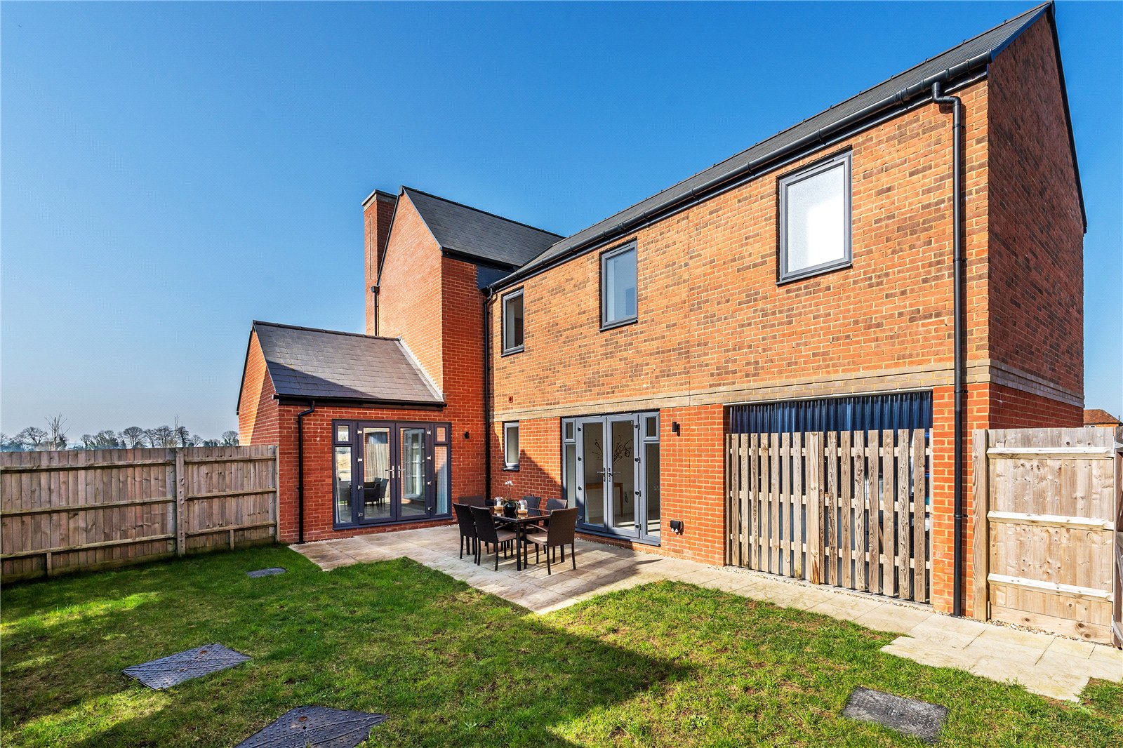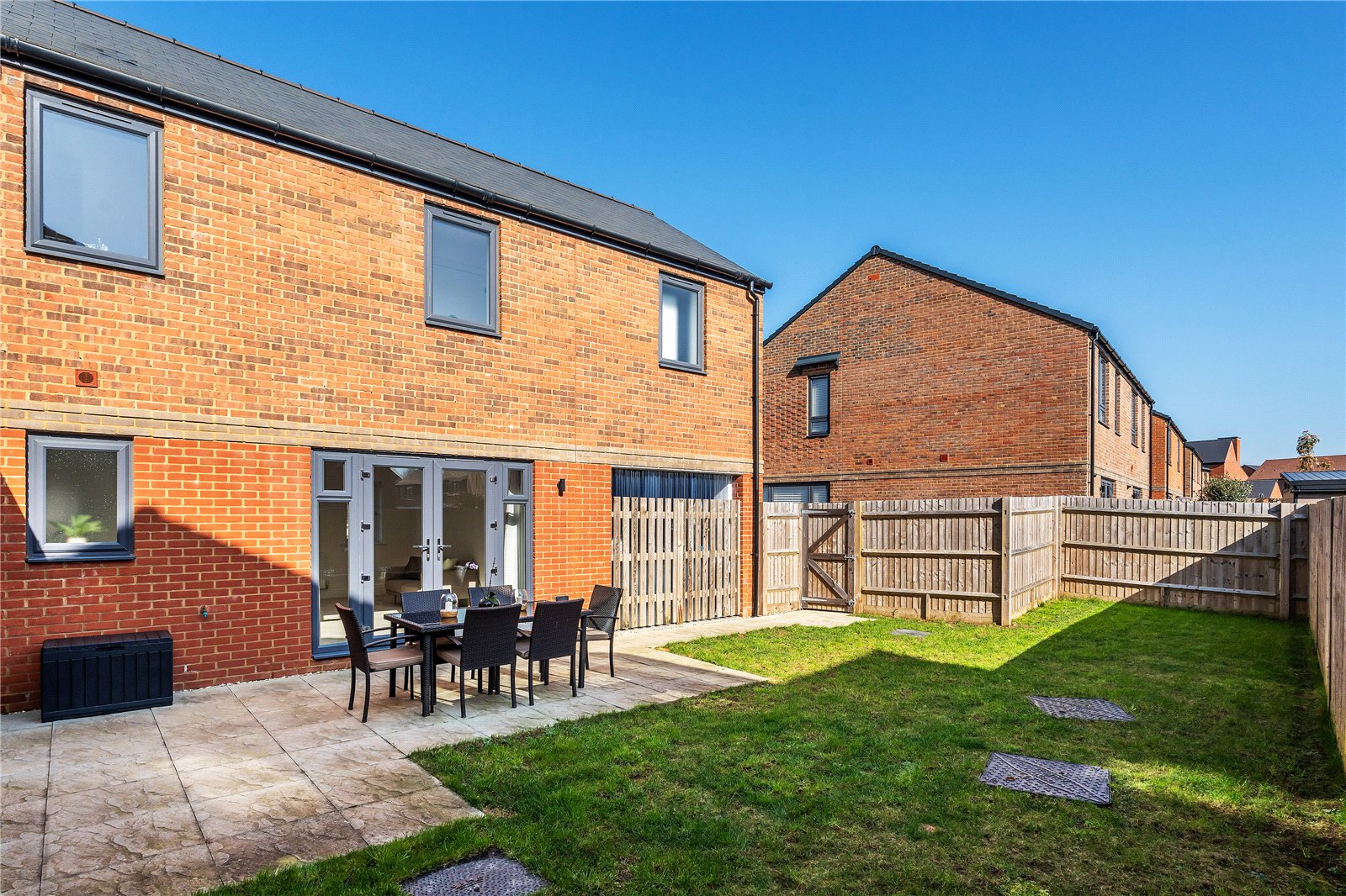 The rear garden is designed to complement the home’s sociable layout. French doors from both the sitting room and kitchen/dining room open onto a wide patio, creating the perfect space for outdoor entertaining, summer barbecues or simply enjoying a quiet coffee in the morning sun. Beyond the terrace, an established lawn offers plenty of room for children to play, with potential to further enhance the garden with planting, borders or a pergola seating area. To the side of the property, a secure timber gate provides direct access to the driveway, allowing guests to easily join outdoor gatherings. The wide driveway and attached garage together offer private off-road parking for up to three vehicles, and an electric vehicle charging point is already installed.