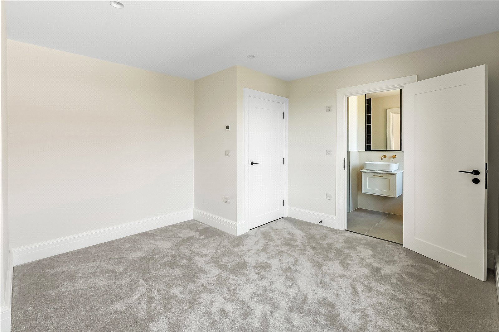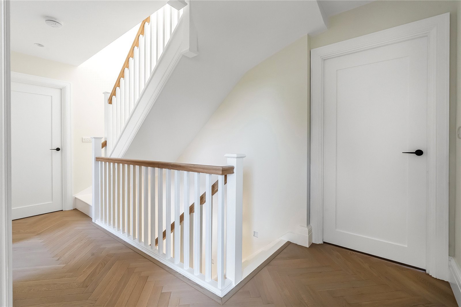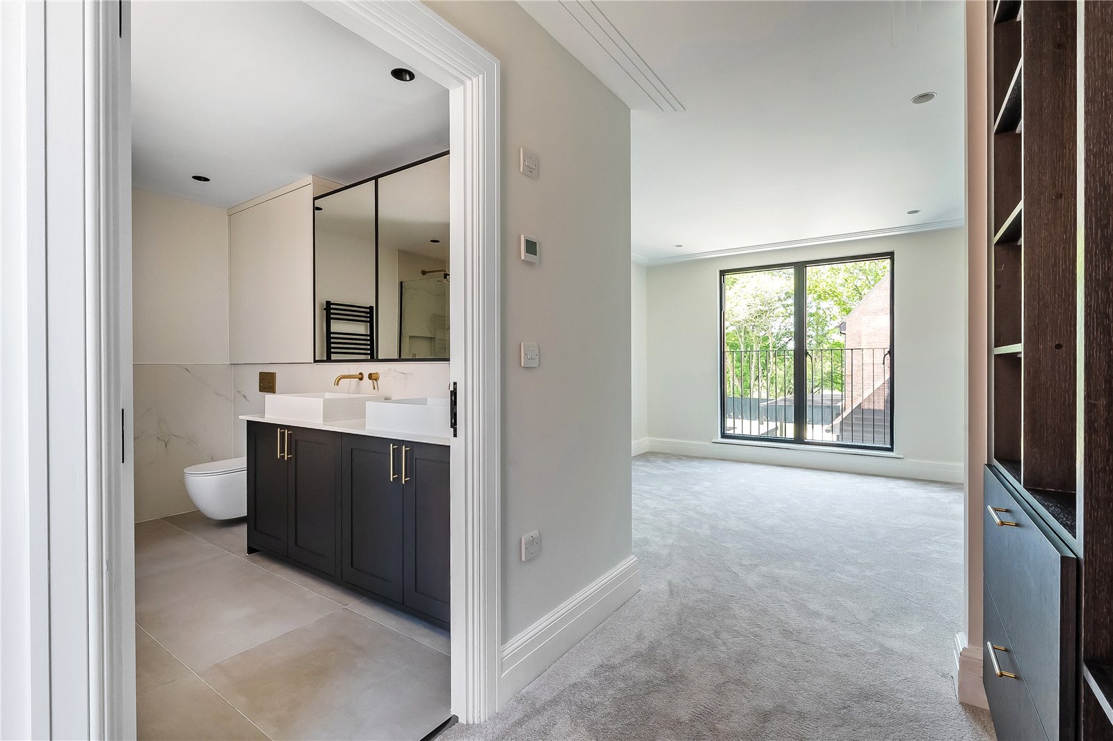The principal bedroom has been thoughtfully designed, featuring excellent ceiling height, bespoke cornices, and a set of doors leading to a Juliet balcony, all contributing to the opulent feel of this exquisite suite. A dressing area with full-height bespoke wardrobes and cabinetry, enhanced by built-in lighting, leads into a luxurious en-suite bathroom. Within this spa-like space is a luxury steel enamelled bath, Hansgrohe Grove taps, a shower, and it is further complemented by large floor and wall tiles.