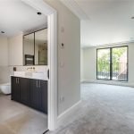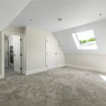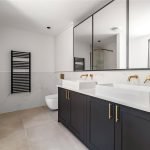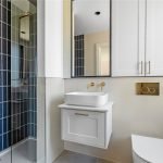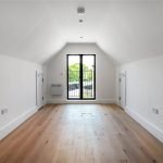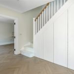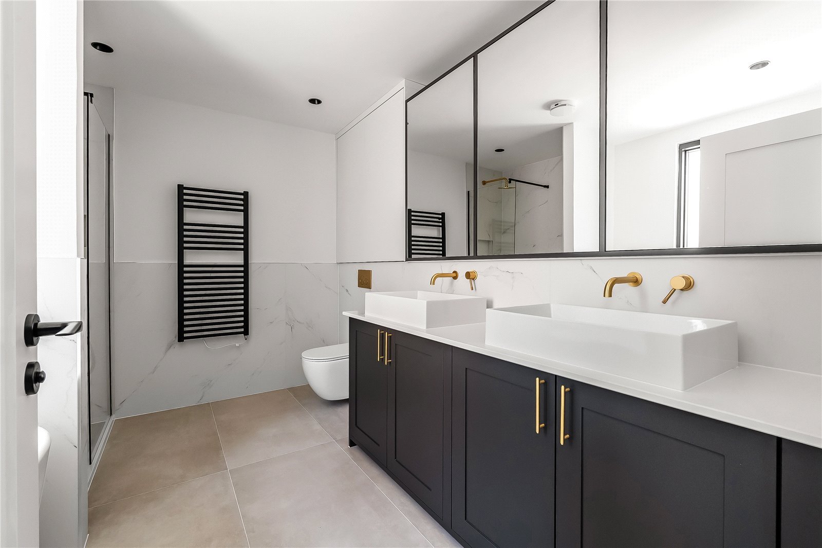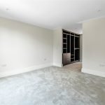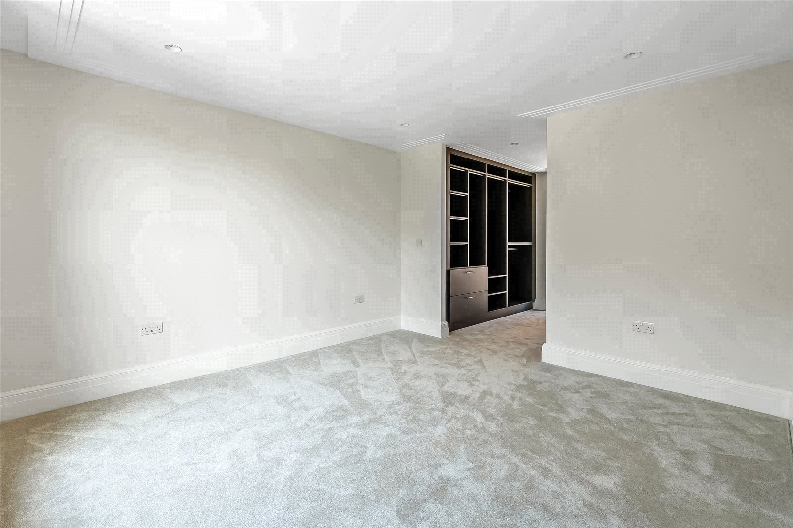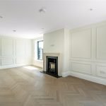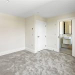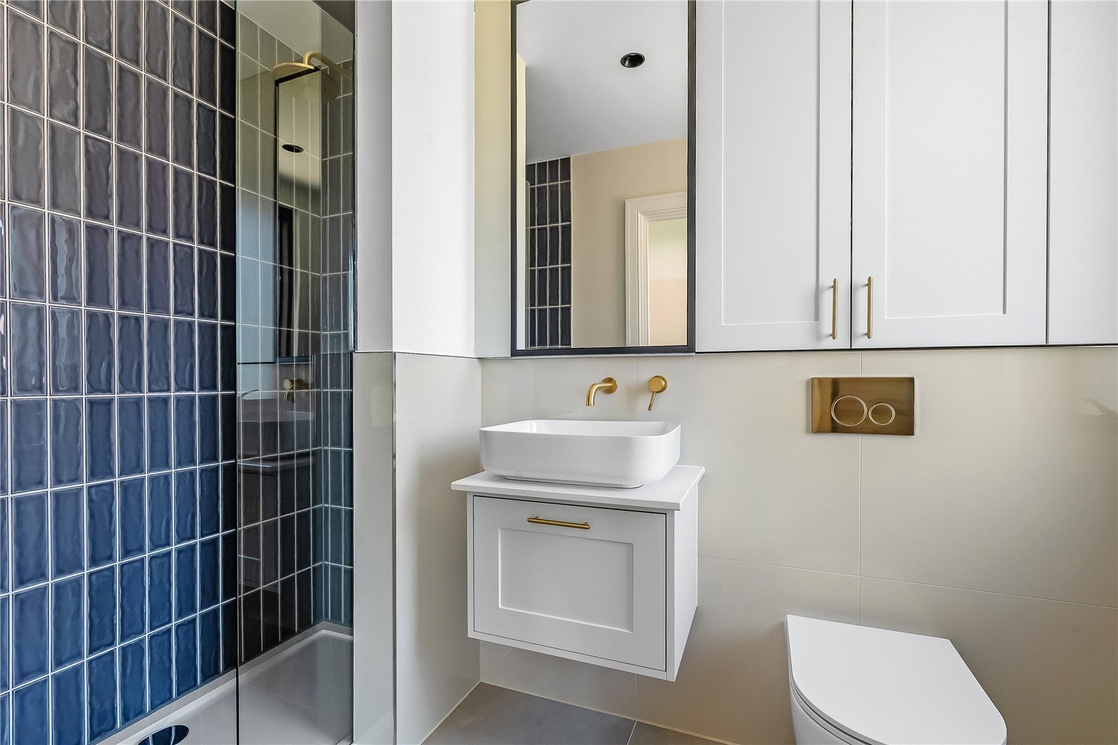 The principal bedroom has been thoughtfully designed, featuring excellent ceiling height, bespoke cornices, and a set of doors leading to a Juliet balcony, all contributing to the opulent feel of this exquisite suite. A dressing area with full-height bespoke wardrobes and cabinetry, enhanced by built-in lighting, leads into a luxurious en-suite bathroom. Within this spa-like space is a luxury steel enamelled bath, Hansgrohe Grove taps, a shower, and it is further complemented by large floor and wall tiles.