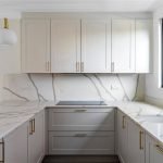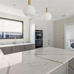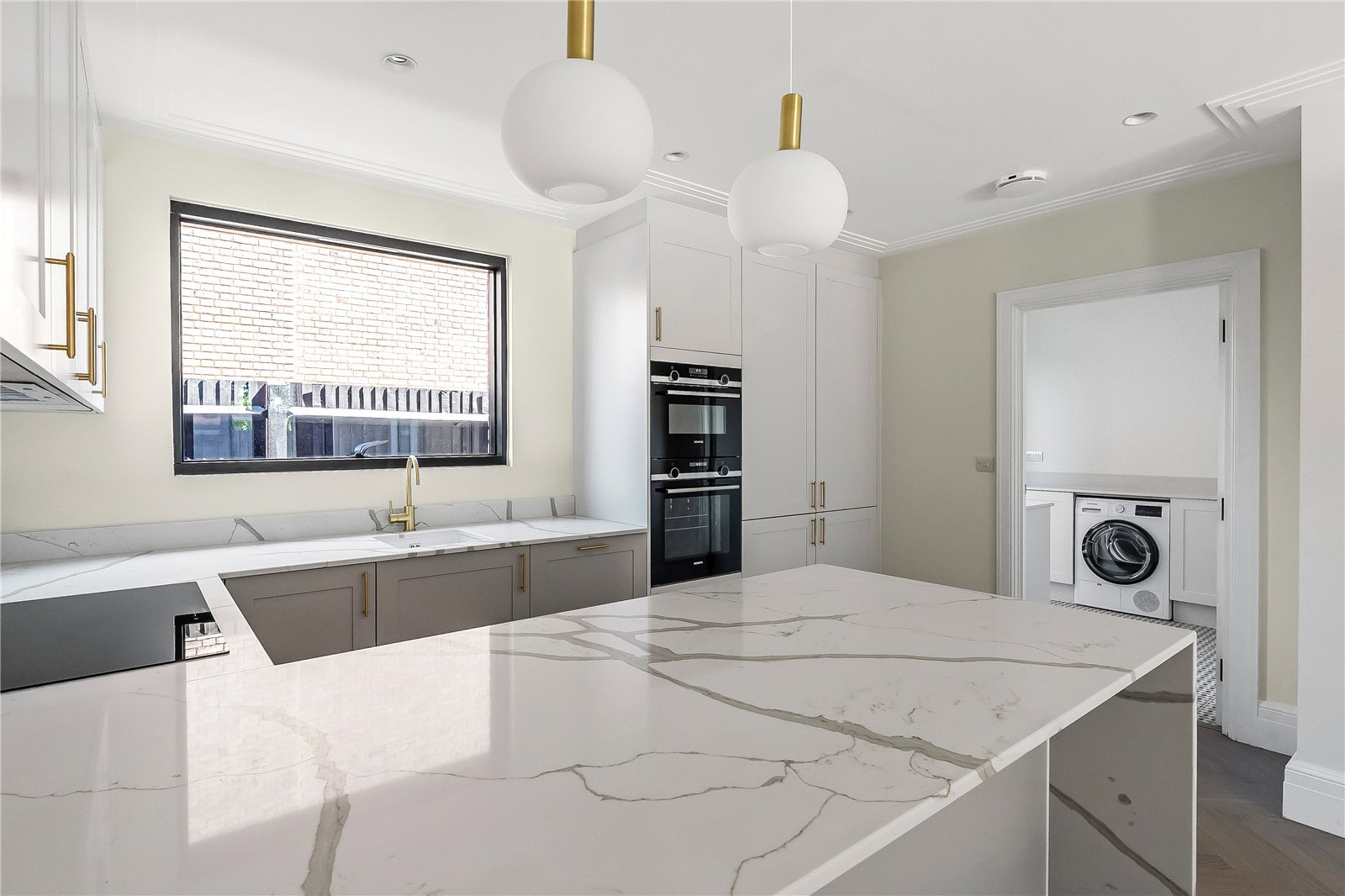 The main kitchen area is separated by a generous central island with breakfast bar seating and finished with marble marble-effect Quartz countertop.