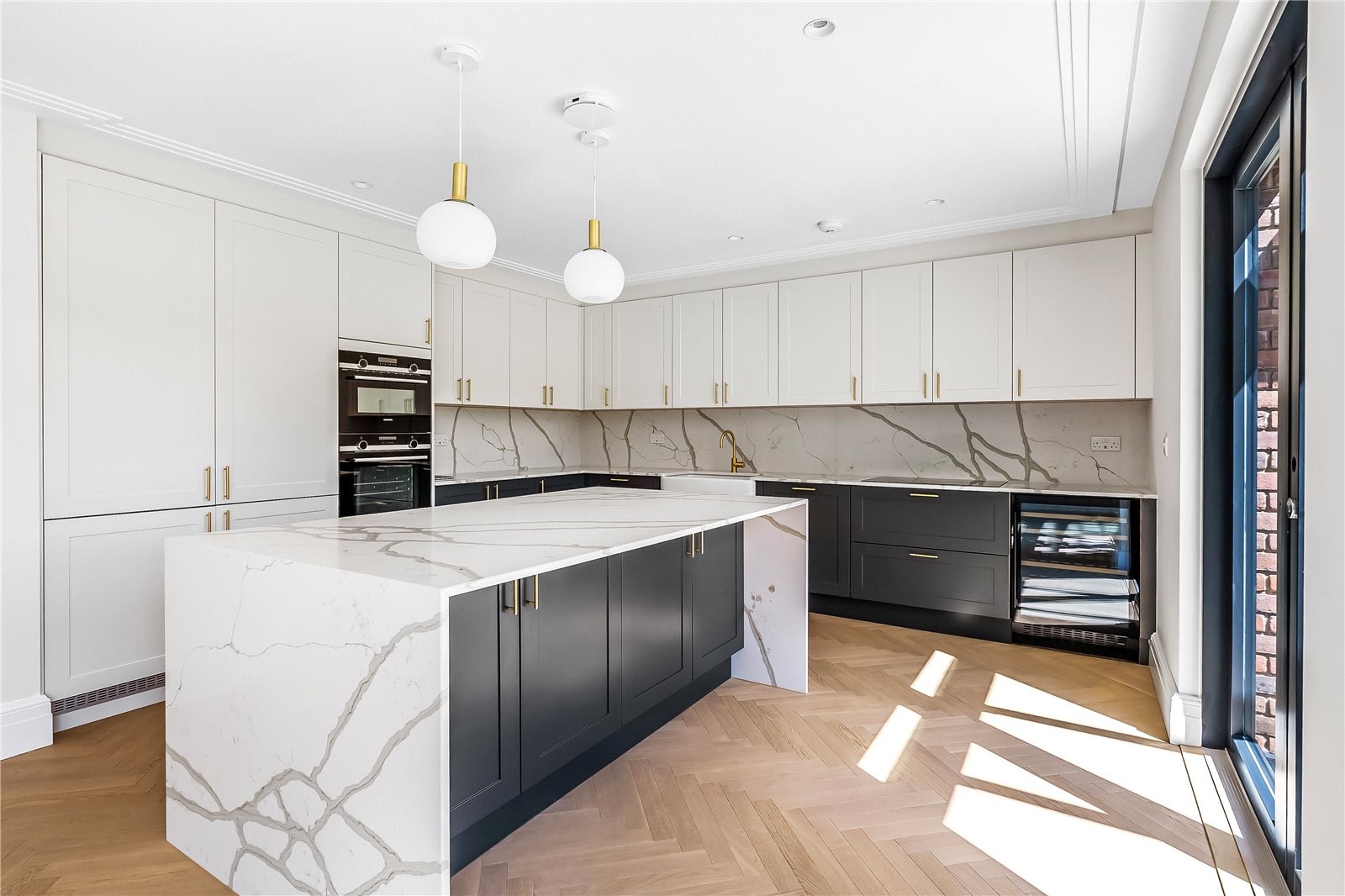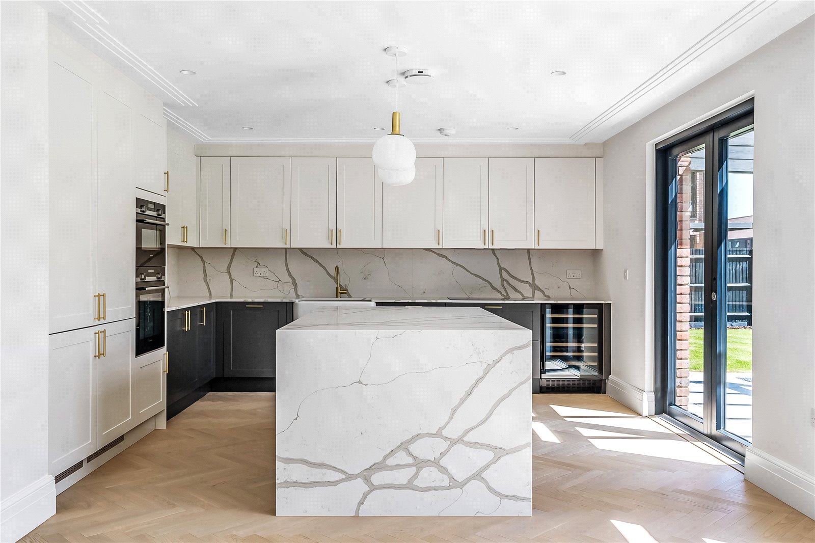 An excellent array of eye and base level units which are finished and meticulously designed in a traditional shaker style, complemented by brass handles, and under lighting, provides a wonderful linear feel. Below the upper units, the Quartz marble effect countertop not only provides a hardwearing and practical solution, but also that touch of sophistication and openly expected in such a high-end designer kitchen. A range of appliances, including a double oven, microwave, fitted fridge and freezer unit, wine fridge and dishwasher, all complement this excellent hub of the home.
