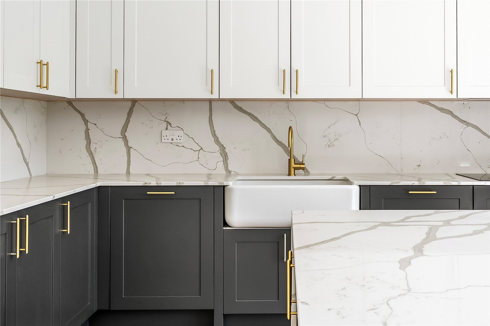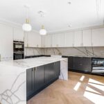 The main kitchen area is separated by a generous central island with breakfast bar seating and finished with marble effect Quartz countertop.
