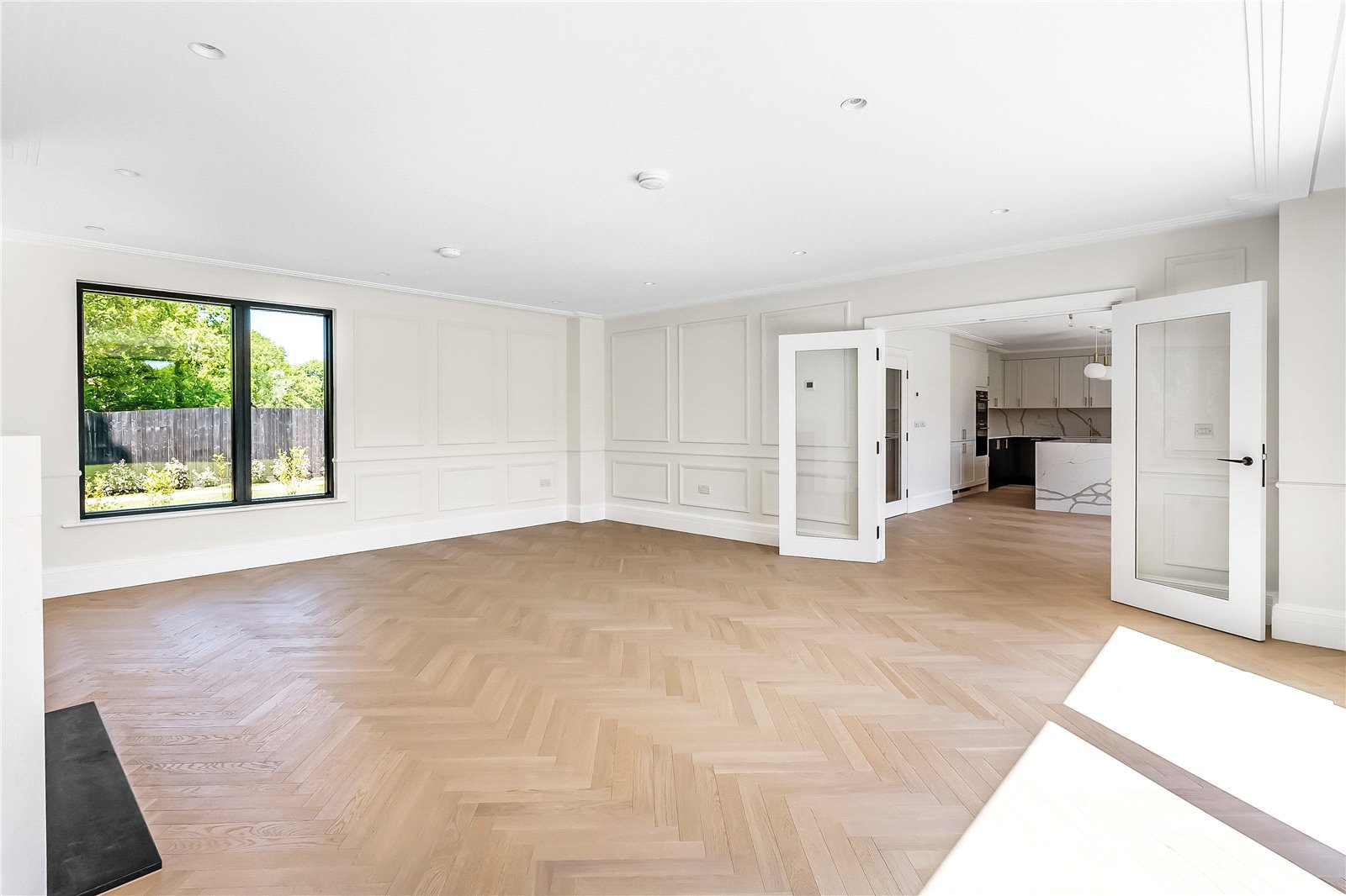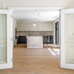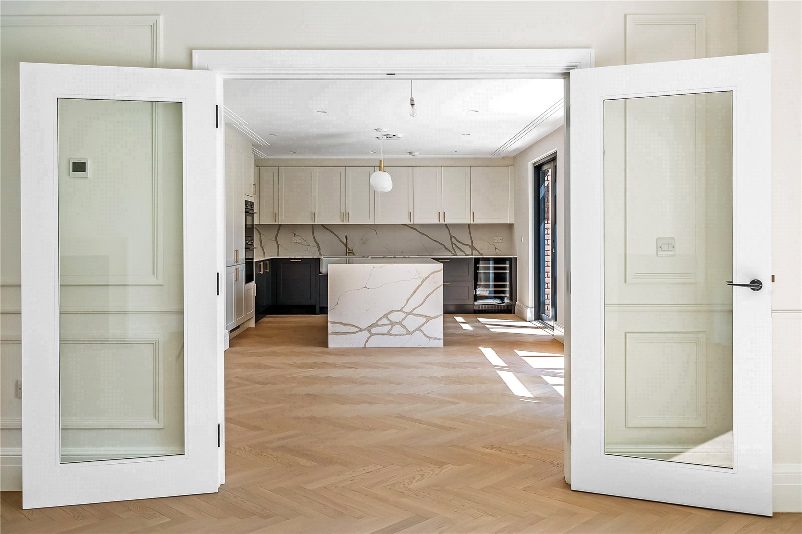 Passing through a set of glazed doors and into the dining area, the first element you will notice is the high ceilings, bespoke cornicing, and clever hidden LED accent lights that provide a wonderful wall wash of warm ambient light.