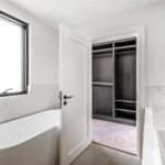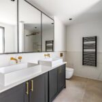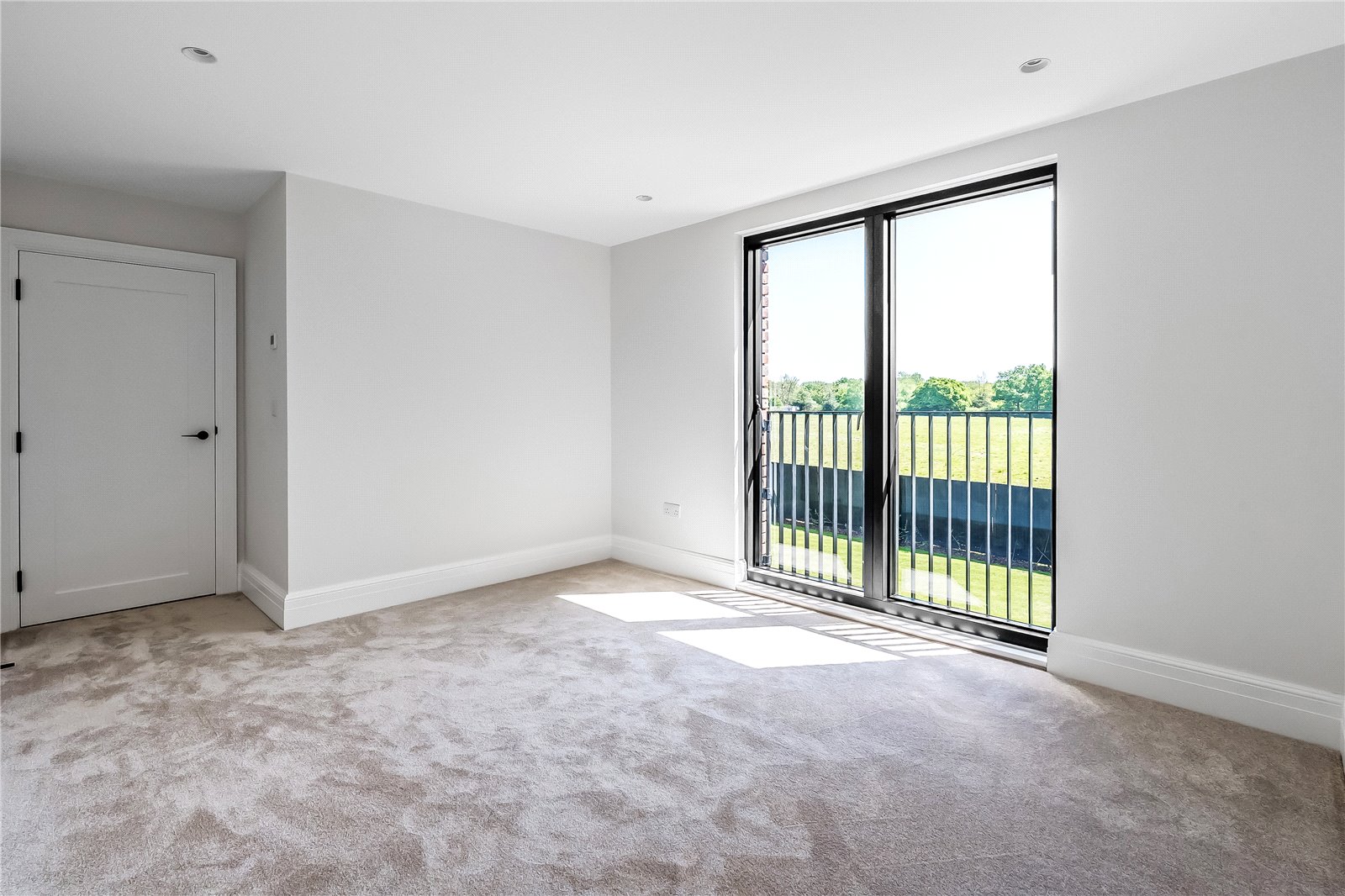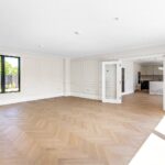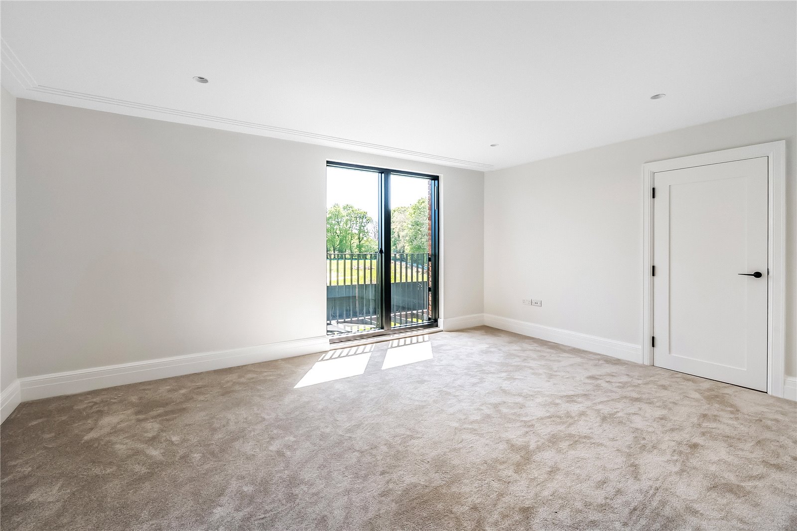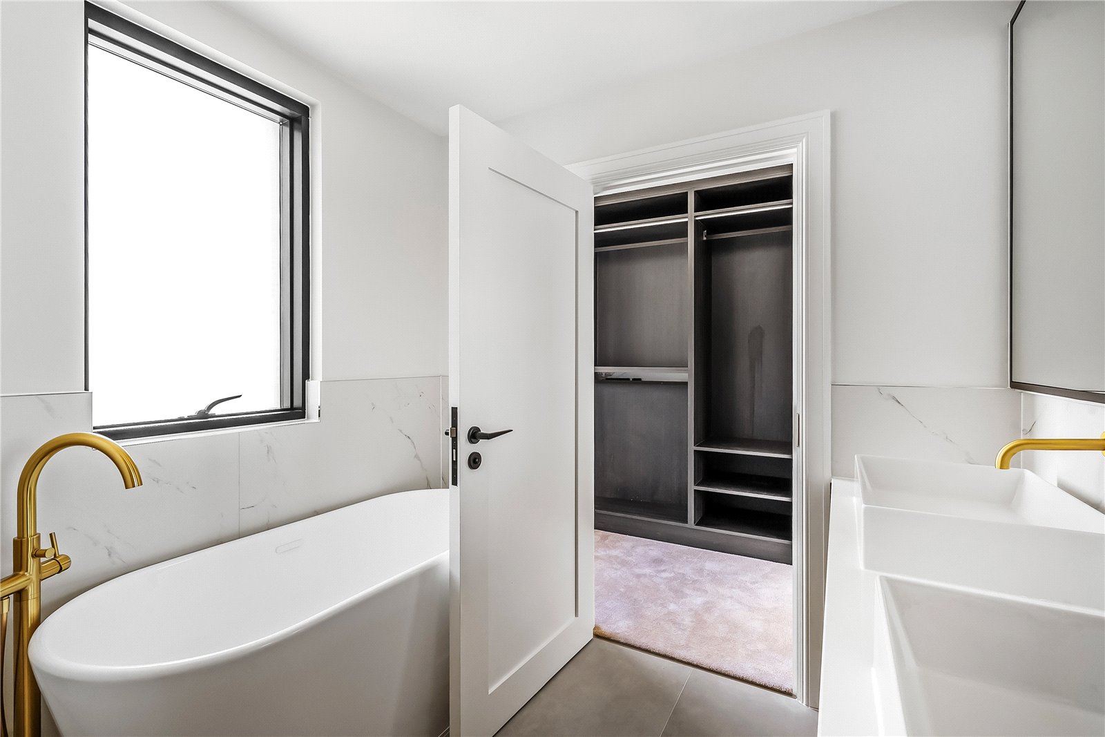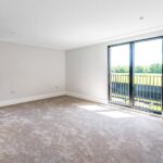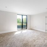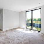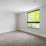 The principal bedroom has been thoughtfully designed, featuring excellent ceiling height, bespoke cornices, and a set of doors leading to a Juliet balcony, all contributing to the opulent feel of this exquisite suite. A dressing area with full-height bespoke wardrobes and cabinetry, enhanced by built-in lighting, leads into a luxurious en-suite bathroom. Within this spa-like space is a luxury steel enamelled bath, Hansgrohe Grove taps, a shower, and it is further complemented by large floor and wall tiles.