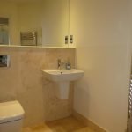 Bathroom fully tiled in Travertine, with stylish white bath, washbasin and w.c. with chrome power shower over the bath, ladder towel rail and wide mirror with ample shelf for toiletries and cosmetics.