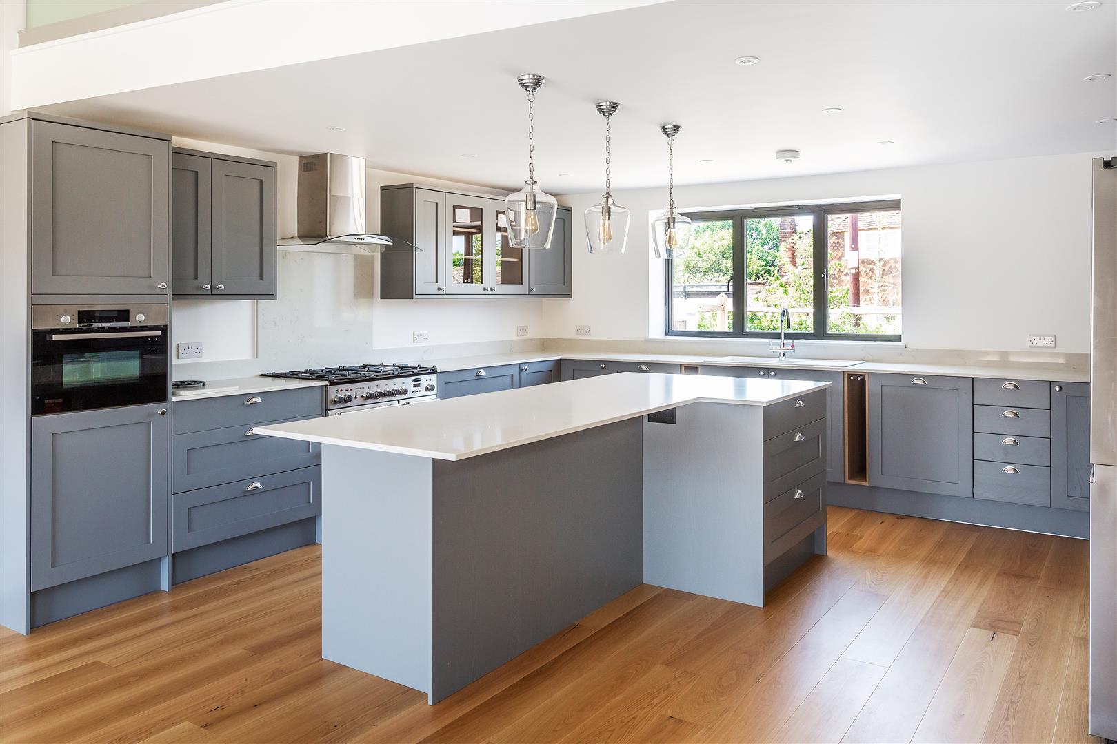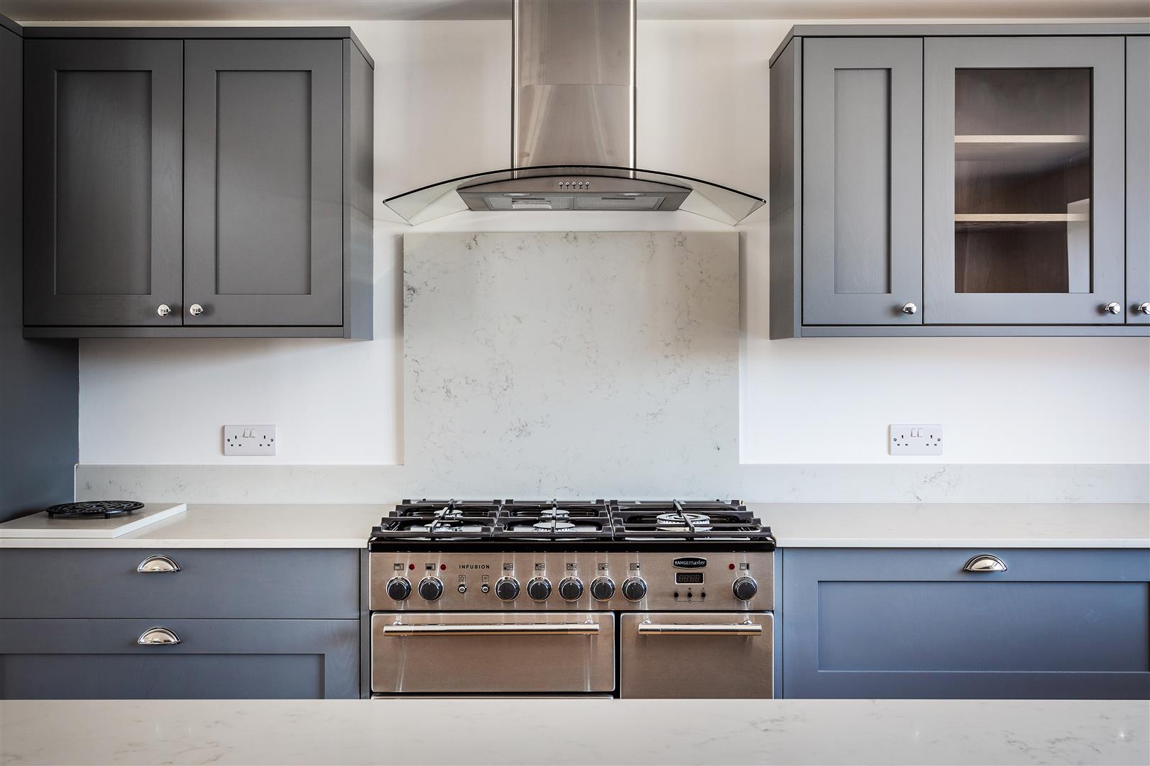The kitchen is centred around a generous island with cabinetry below and quartz work surfaces. Fitted in a modern shaker style, this fabulous space offers character and charm yet with a modern twist. Fitted into the kitchen is a rangemaster oven with a five-burner top. A large double width American style fridge freezer, dishwasher and plenty of storage all compliment this stunning hub of the home. There is also a built in wine cooler, combination microwave oven and a pantry larder with a nearby appliance cupboard.