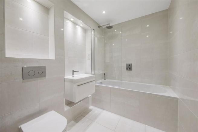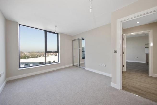 The bedroom includes fitted wardrobes and a floor to ceiling window. The bathroom includes a shower over the bath.