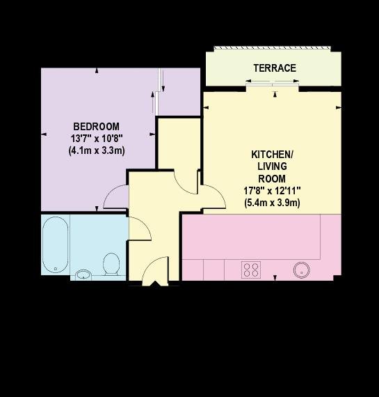 The bedroom includes fitted wardrobes and a floor to ceiling window. The bathroom includes a shower over the bath.