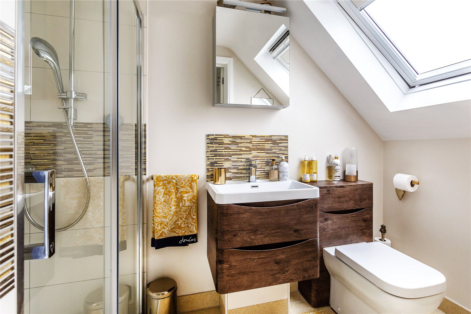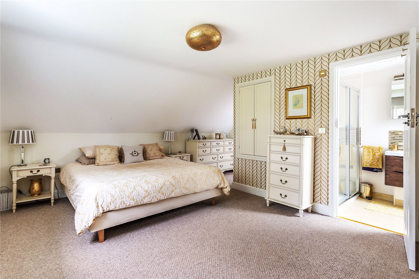 The principal bedroom has a semi-vaulted ceiling creating a wonderful sense of space, this coupled with a large two-thirds width picture window enjoys a westerly aspect with a charming view towards the village cricket green. A well appointed en-suite shower rooms further complements this stunning main bedroom. Also on the first floor is a good-sized double room with clever storage built into the eves. A separate bathroom with a standalone bath and bespoke vanity unit is equally opulent and completes the first floor.