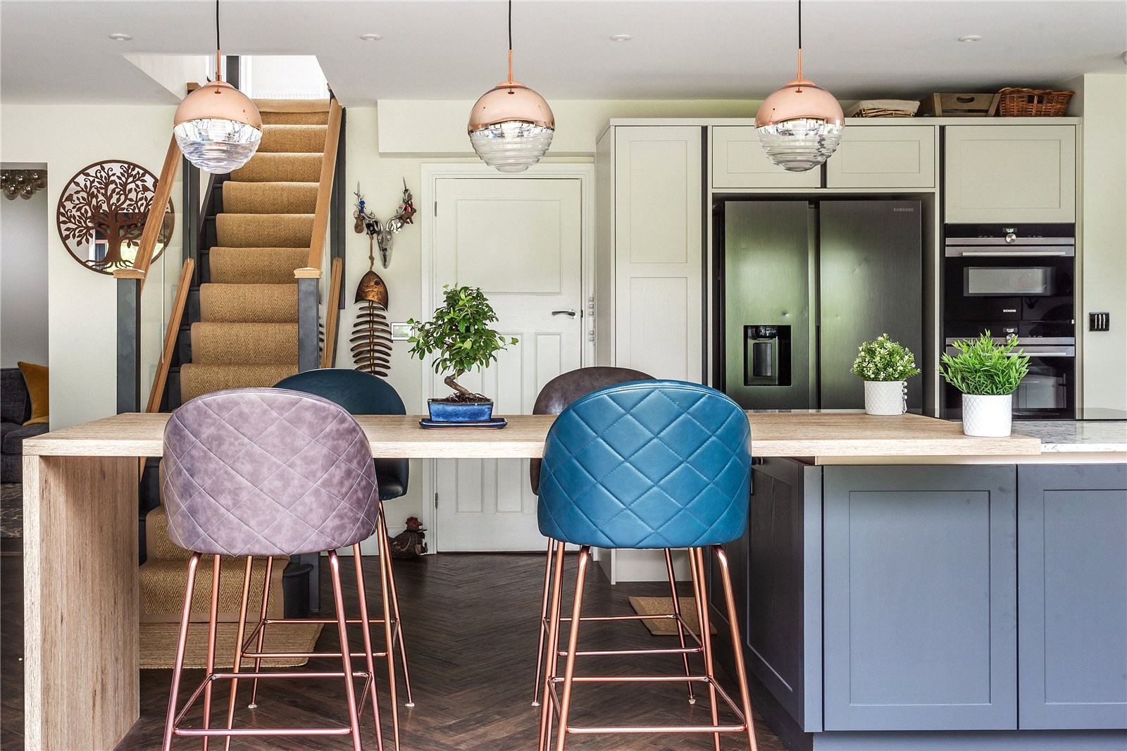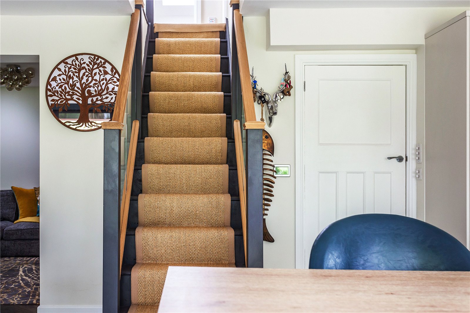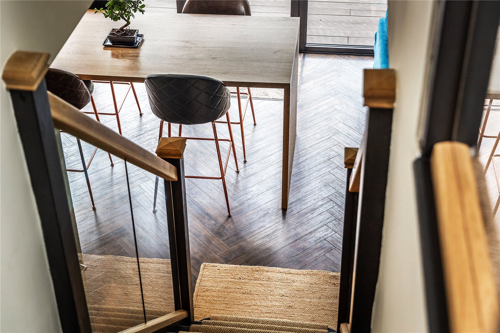 A low-rise contemporary staircase with glass balustrades from the kitchen area takes you to the first-floor landing.