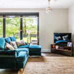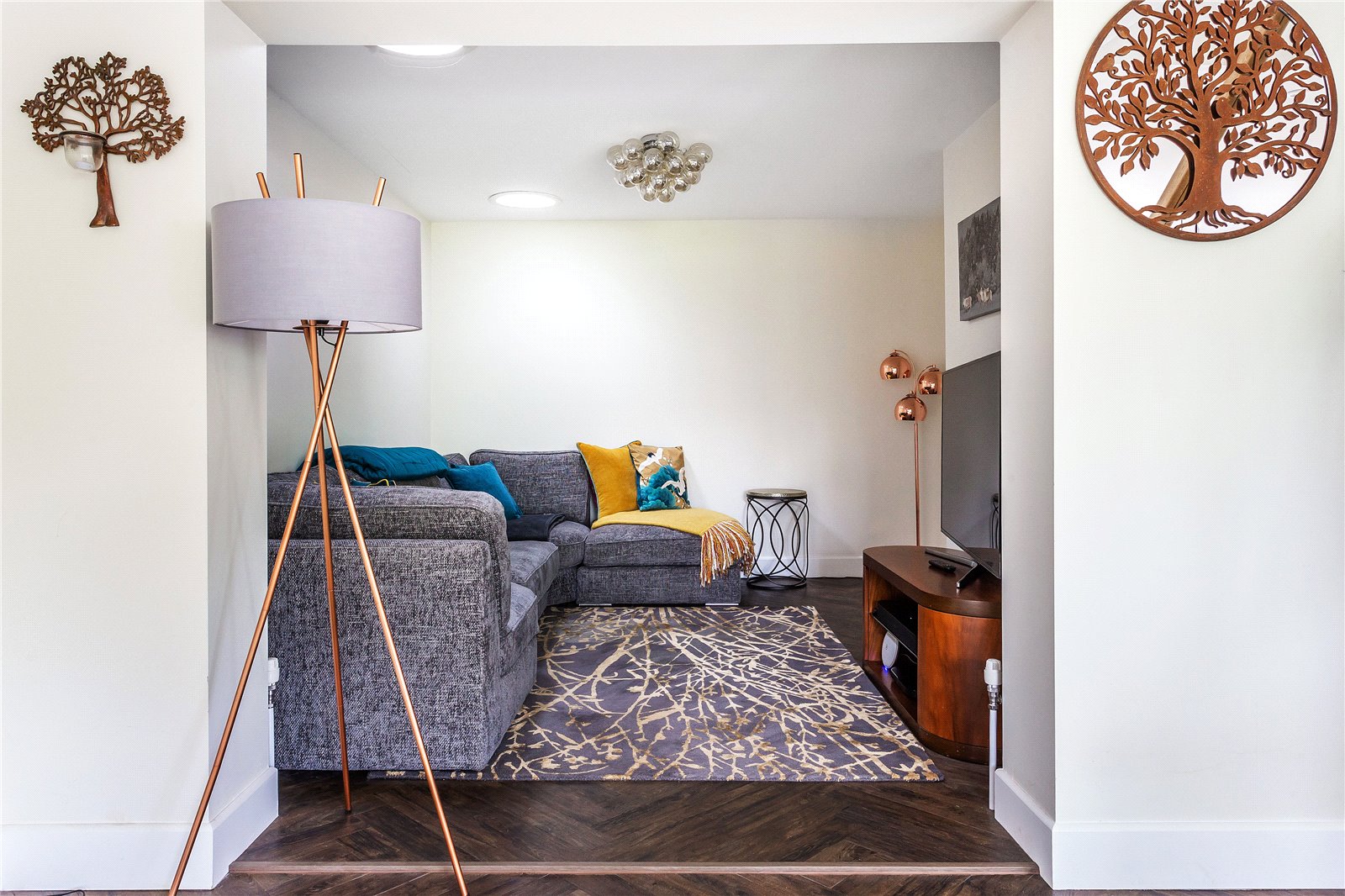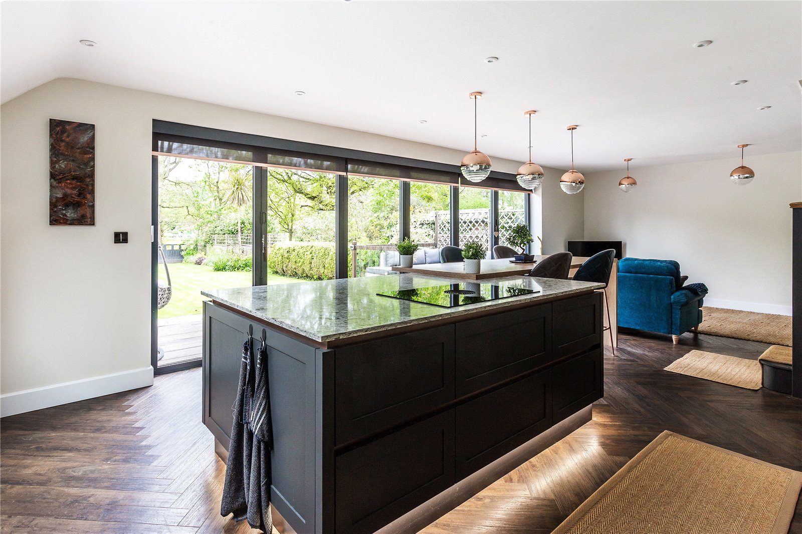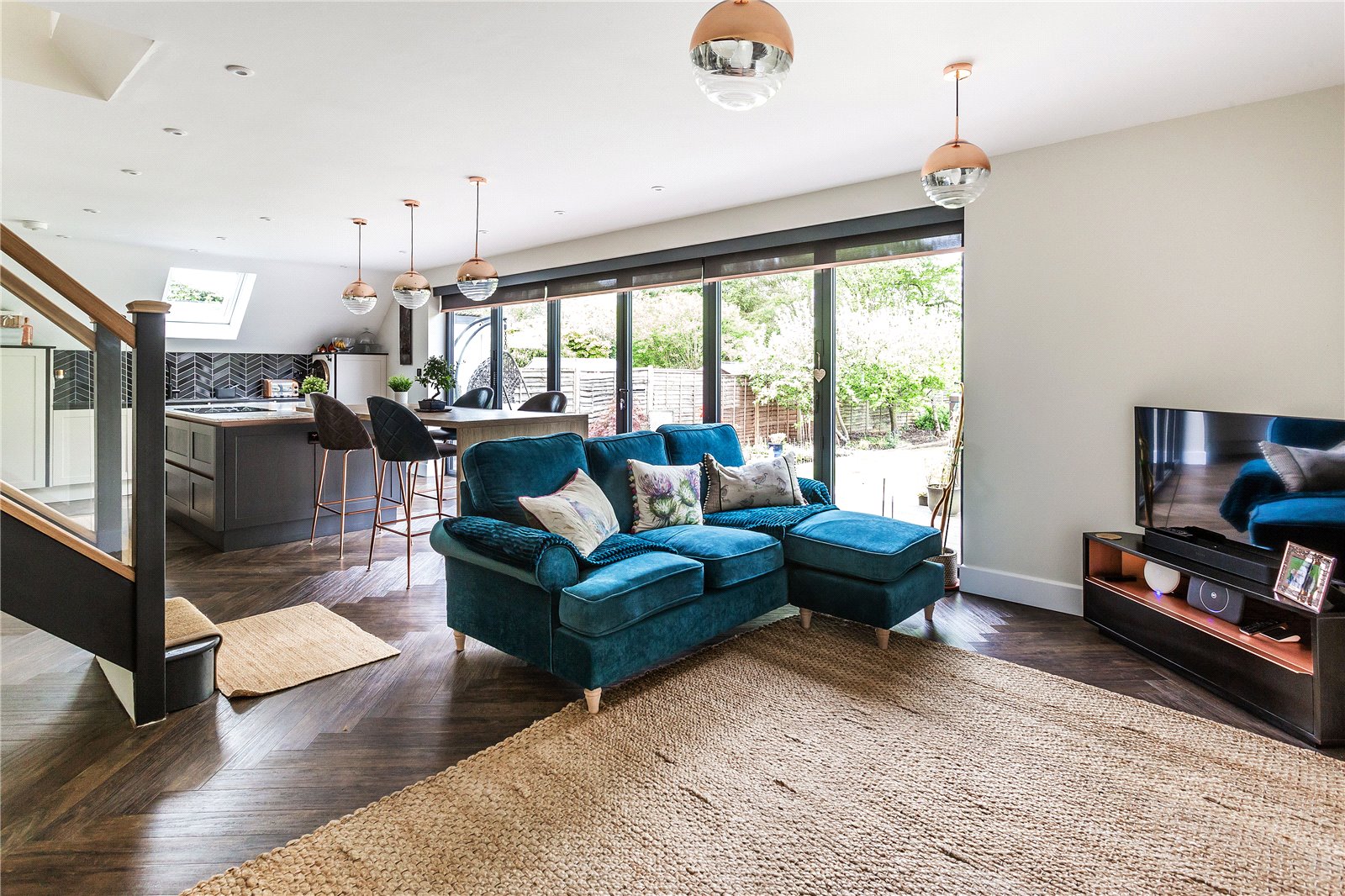 To the right-hand side of the kitchen is a cosy seating area, which in turn opens to a separate family room and cleverly lit with LED downlights and complimented with natural light tubes.