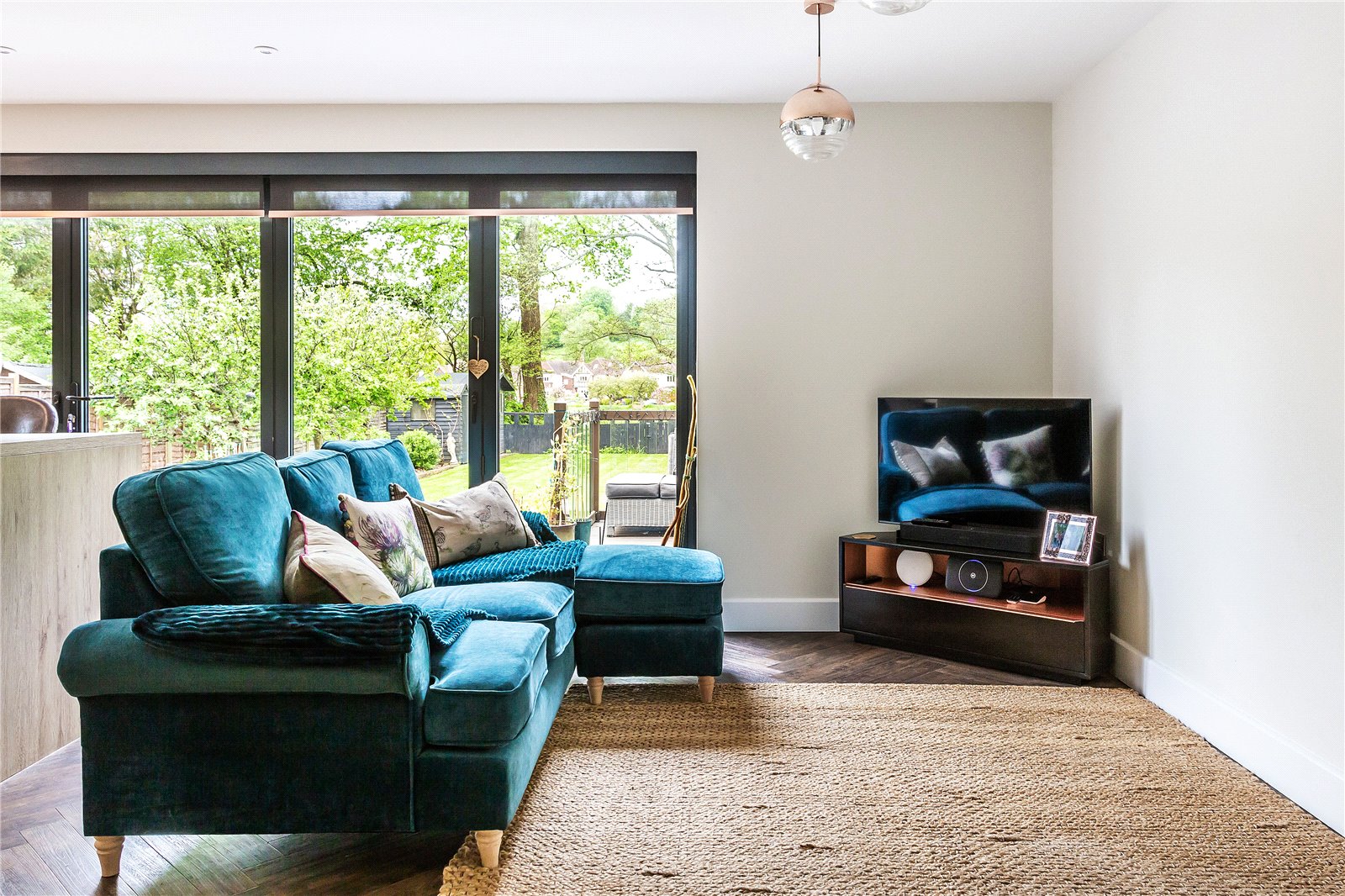 A covered entrance porch gives access to generous central entrance hallway. Upon entry your eye is immediately drawn towards the open plan kitchen/dining/family room with triple width bi-fold doors spanning the rear of the property and a glimpse to the gorgeous gardens beyond.