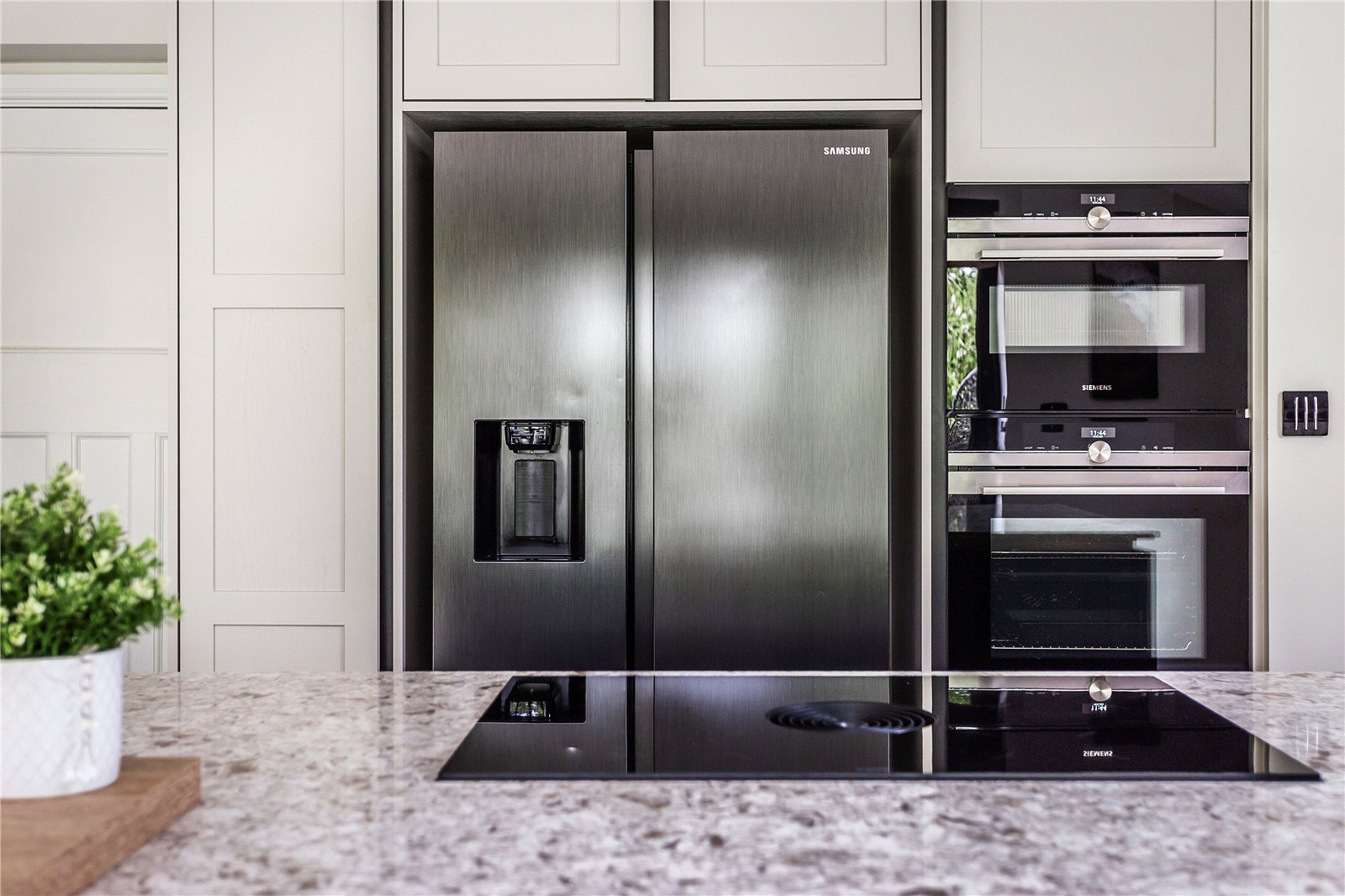 The perimeter cabinetry features a lovely subtle painted shell finish with leathered black granite work top, which blends well with the lighter striking Verona Quartz worktops. An inset graphite double sink unit also boasts a Qooker Flex tap with boiling hot water upon demand. A Fisher & Paykel double DishDraw washer, Samsung American style fridge freezer and double electric ovens will certainly appeal. The newly added utility/boot room is an absolute triumph. Again, with bespoke joinery offering ample storage spaces, coats, and boots storage. plus, a clever area for all your laundry needs. A double-glazed door leads out to the side path, perfect for when returning from a muddy dog walk!