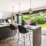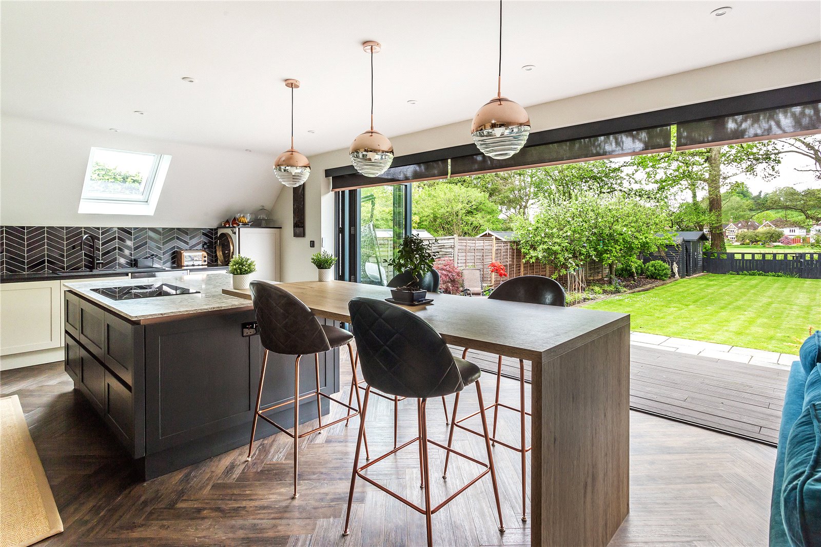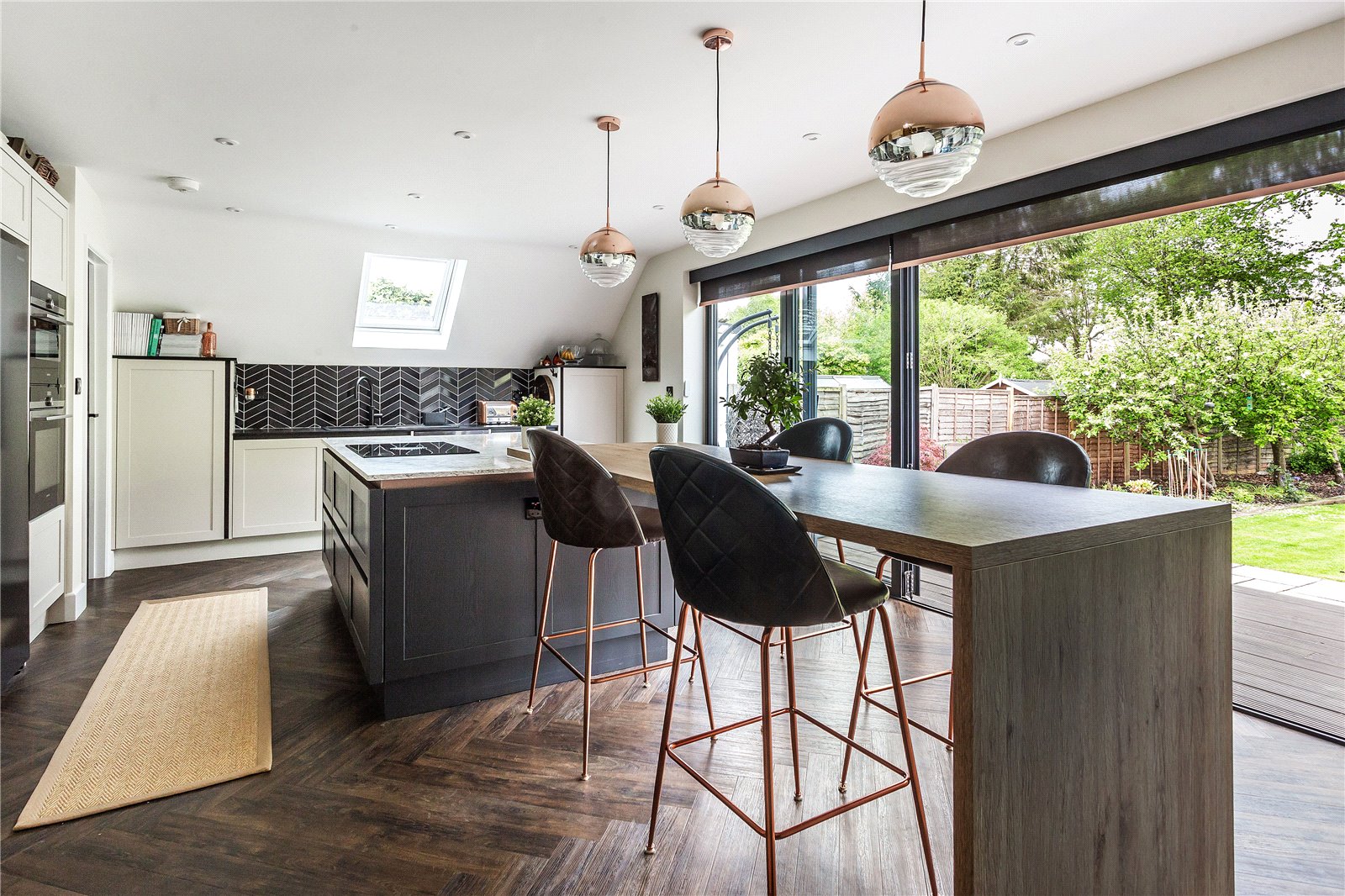 Without questions the stunning kitchen/dining space can be truly regarded as best in class. Designed by Ella Austin, whose brief was to create an open, informal, and opulent kitchen space, which is also offers a true hub of the home. A central island with split heights creates a stunning seating area with a Natural Anthor Oak breakfast bar. This is cleverly connected to the cooking island that hosts a Bora Pure vented hob and ample preparation area. The cabinetry has been crafted using a skinny shaker style and painted in a dual tone of shell and graphite. With solid wood framed drawers including internal cutlery and additional storage solutions. The handle-less panels all have a wonderful inset copper profile and clever accent LED lighting beneath the work surfaces.
