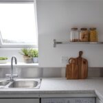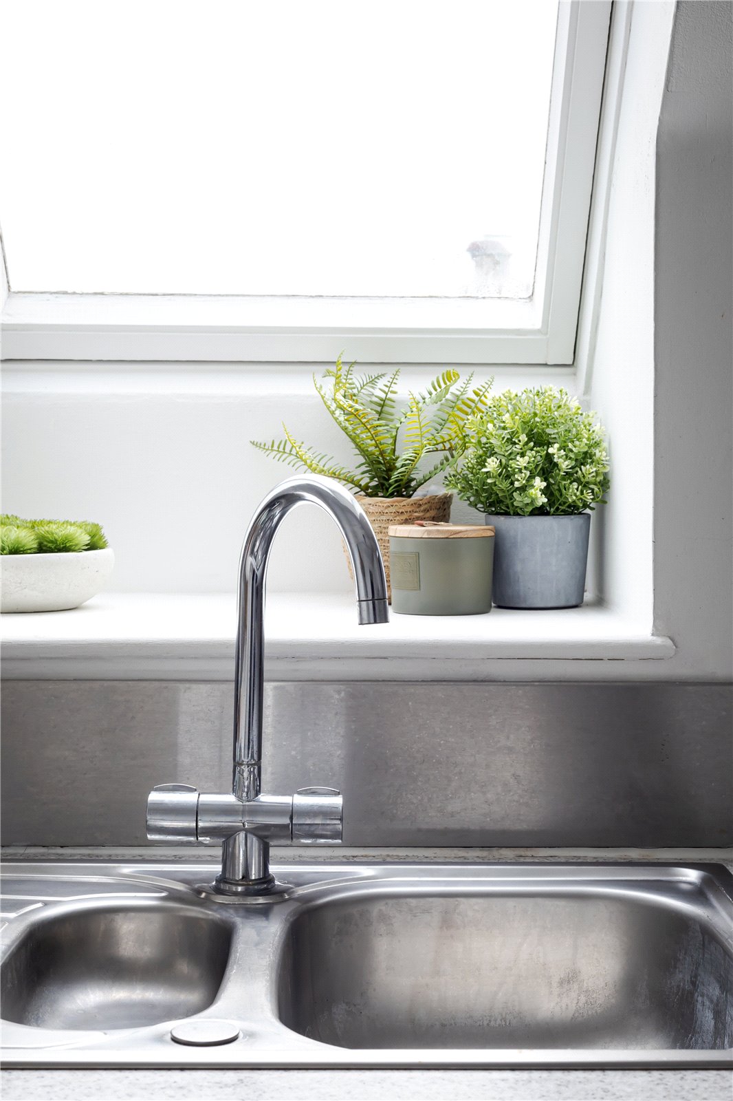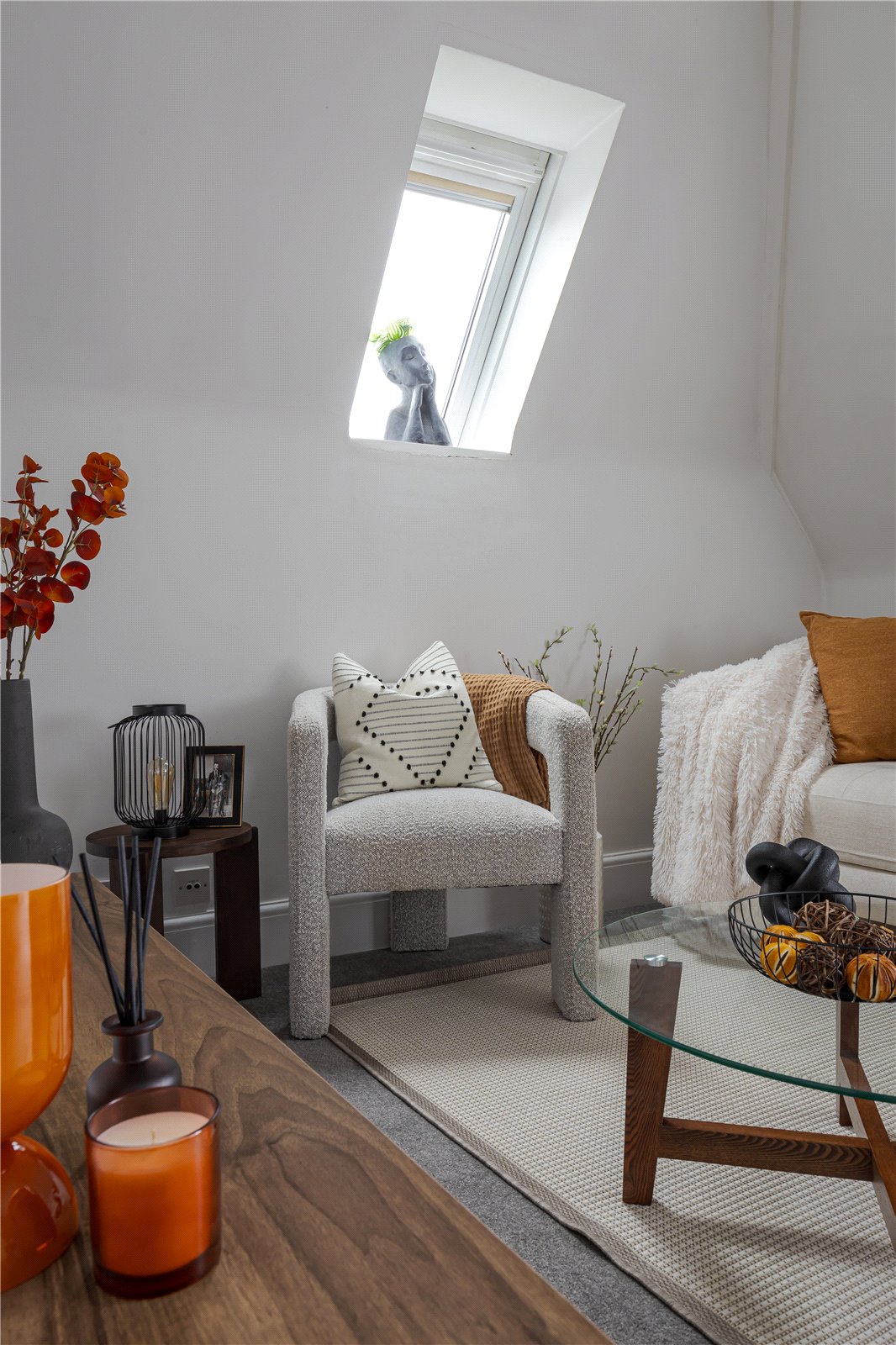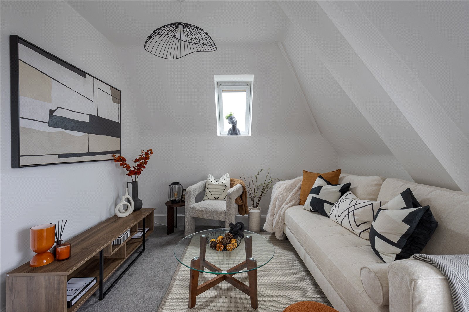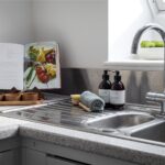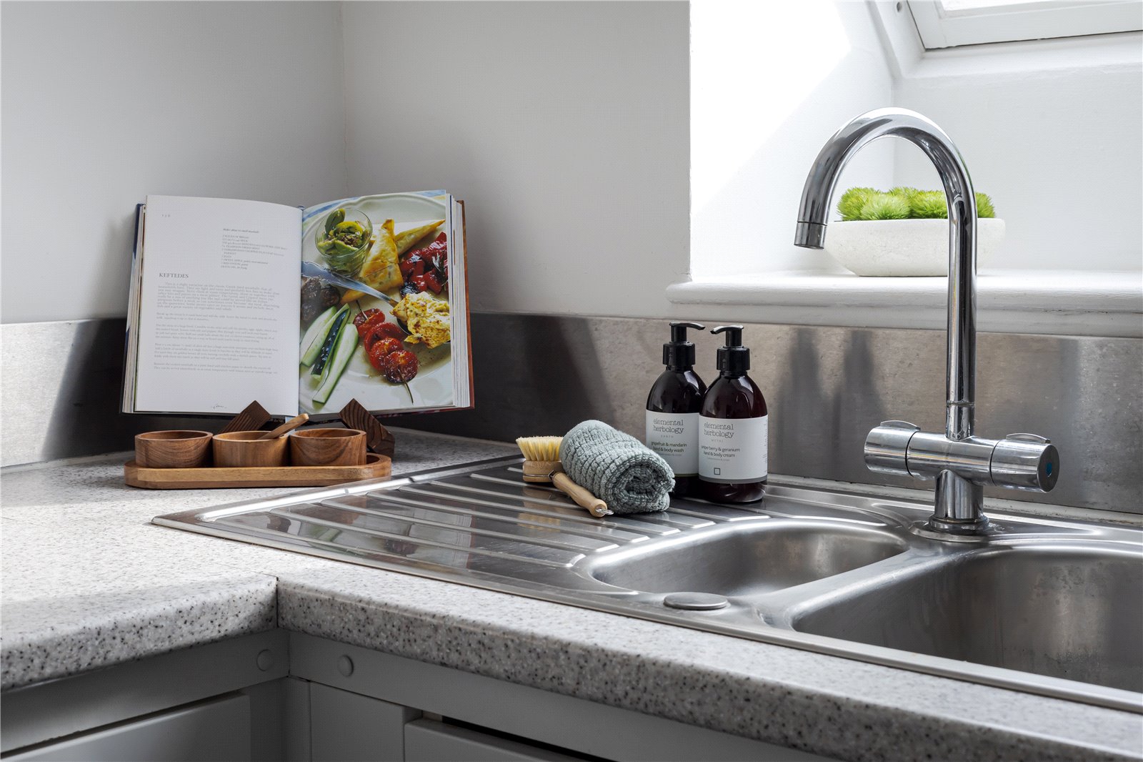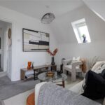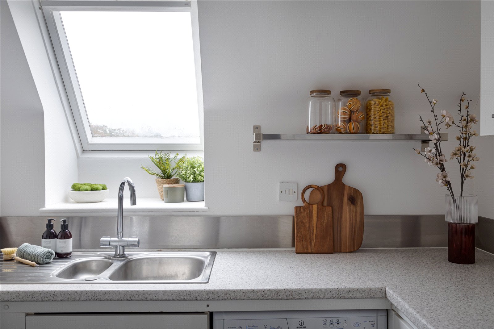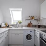 The kitchen has been carefully fitted maximizing storage space whilst including an electric oven with an induction hob over and washing machine. The clever use of a Velux window bathes the kitchen in natural light, creating a bright and airy feel.