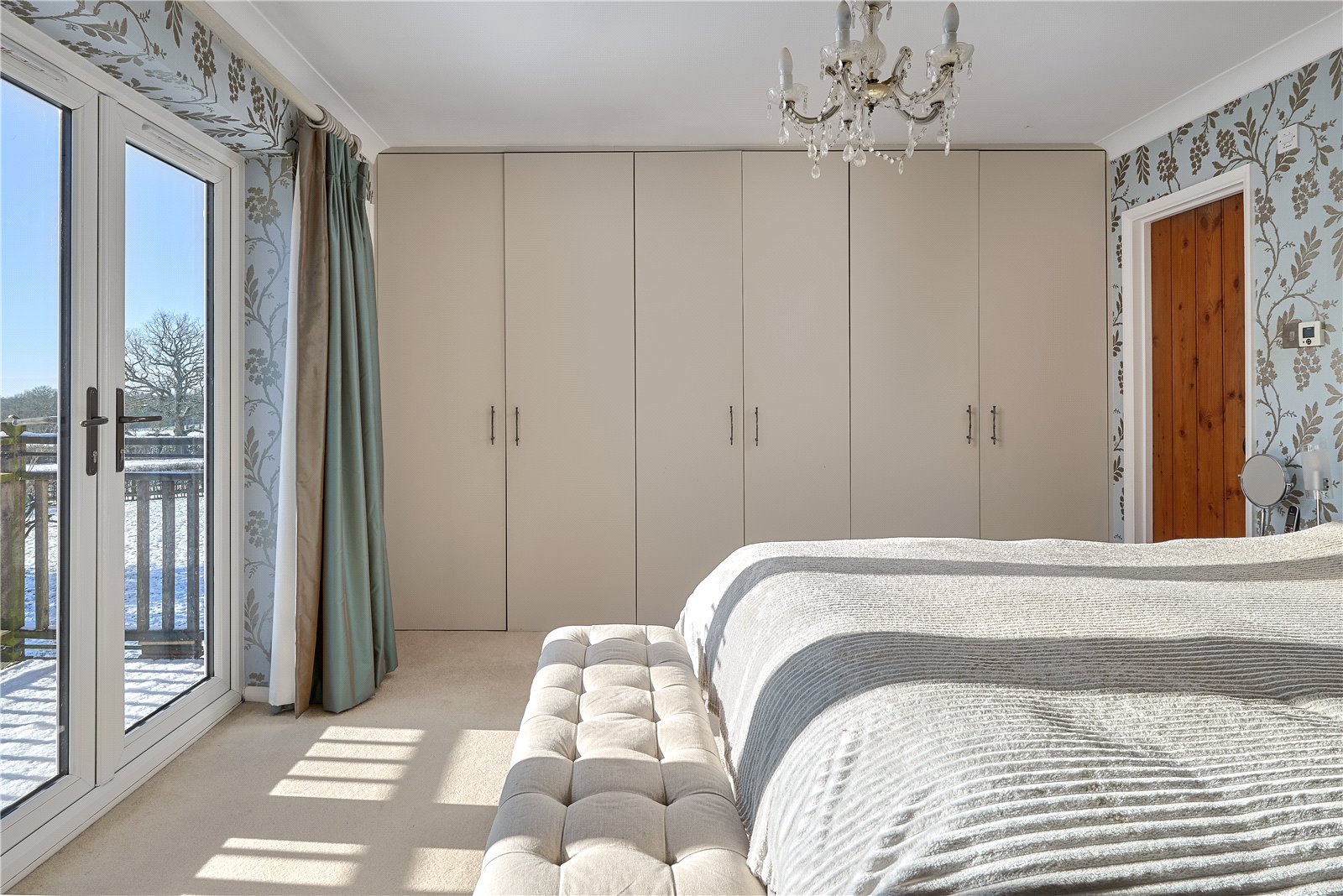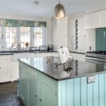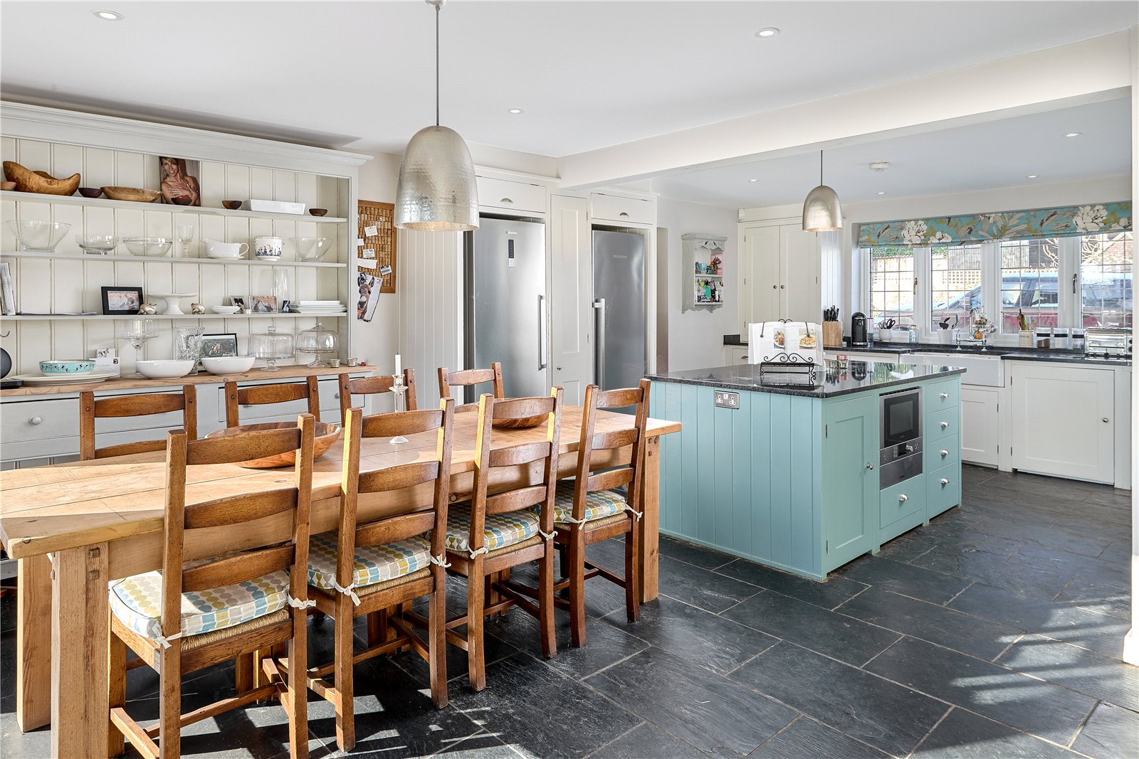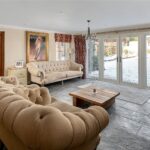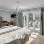A bespoke and hand-painted kitchen is situated centrally within the house, with a wide range of eye and base level units, along with space for freestanding tall fridge & freezer units, fitted dishwasher, and a four-oven range style cooker. A large central island provides ample space for chefs of all standards, beneath the stone countertop are further storage cupboards and a built-in microwave oven.