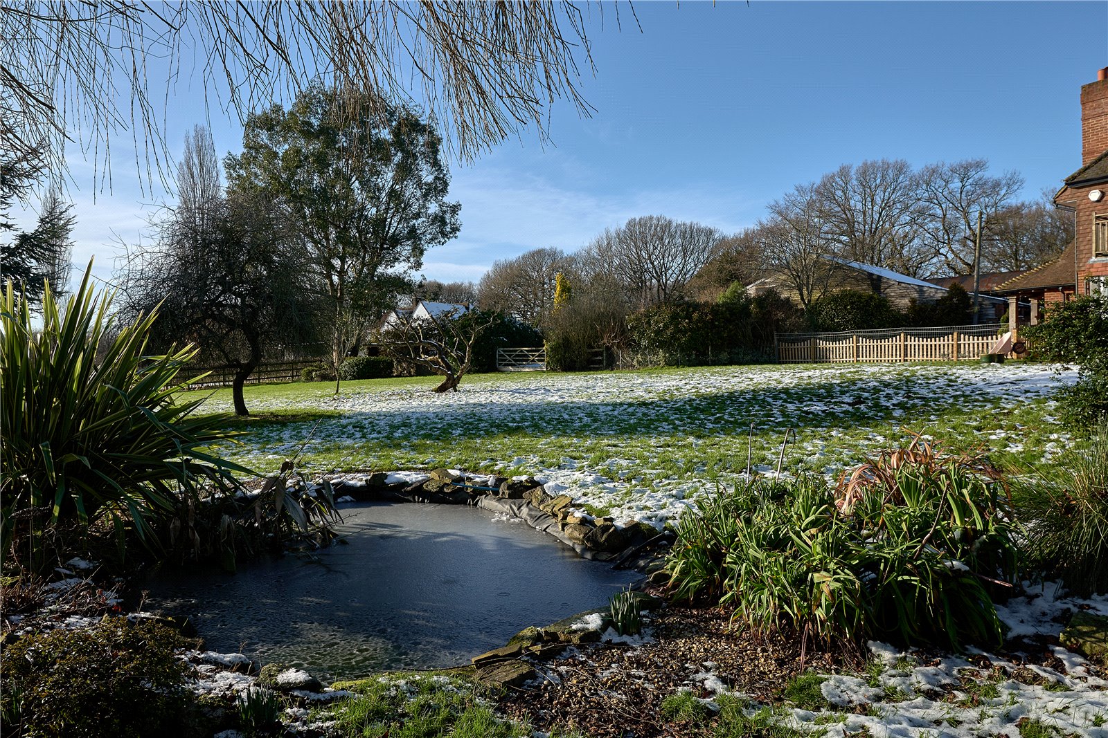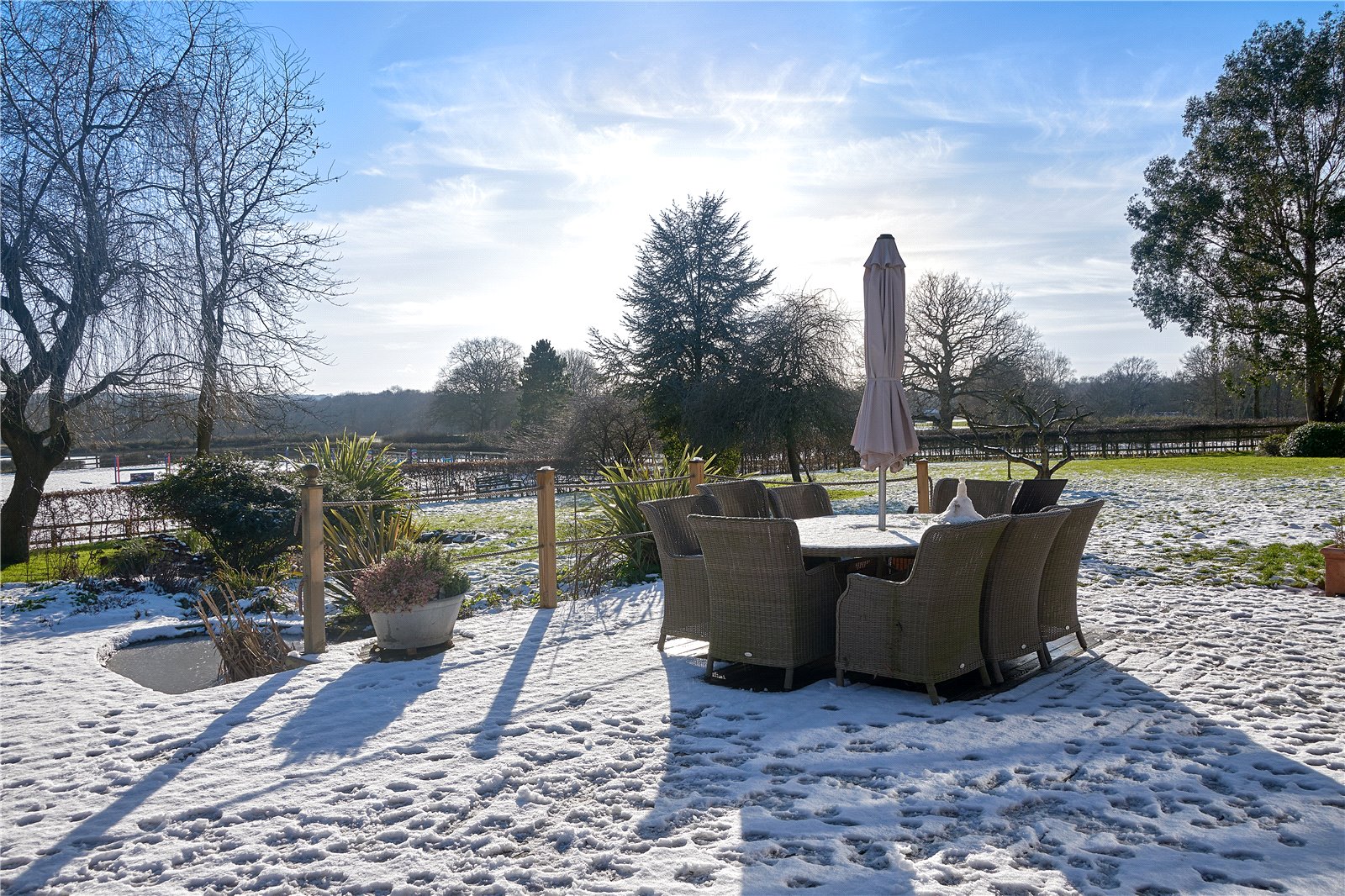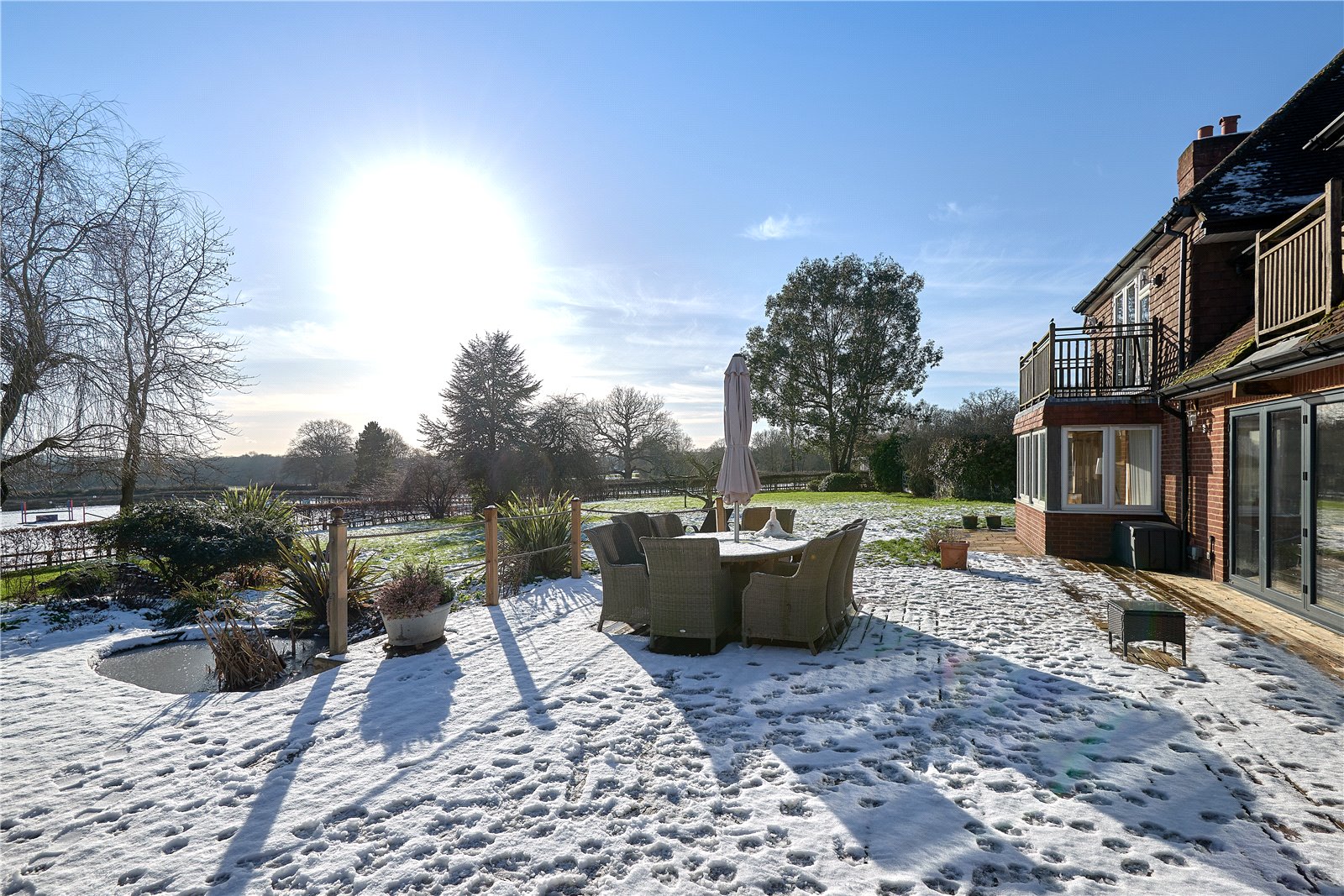 The formal gardens surround the house, with a large entertaining raised terraced area and the most attractive pergola, the views of your fields stretch ahead of you creating a most peaceful location. The gardens are well stocked with plenty of mature shrubs and herbaceous borders, a pretty pond sits neatly in the corner of the terrace. On summer days the bi-folding doors from the breakfast room go immediately out onto the outdoor entertaining area.