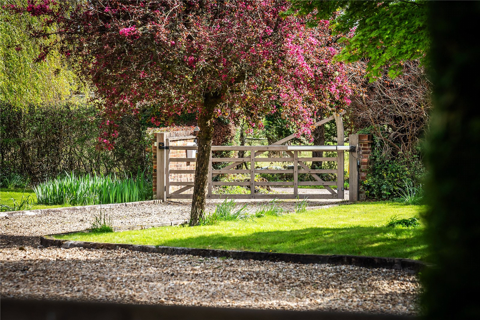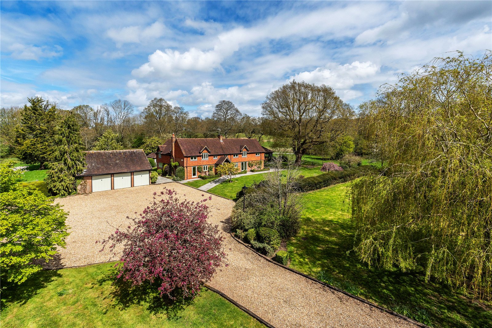The property is approached via a quiet country lane, with an electric five-bar wooden gate flanked by brick pillars opening onto a sweeping gravel driveway, which leads to a generous parking area and a detached triple garage. Planning permission was previously granted (now lapsed) for the addition of a stable block comprising three loose boxes and a tack room, offering excellent potential for those with equestrian interests.