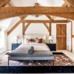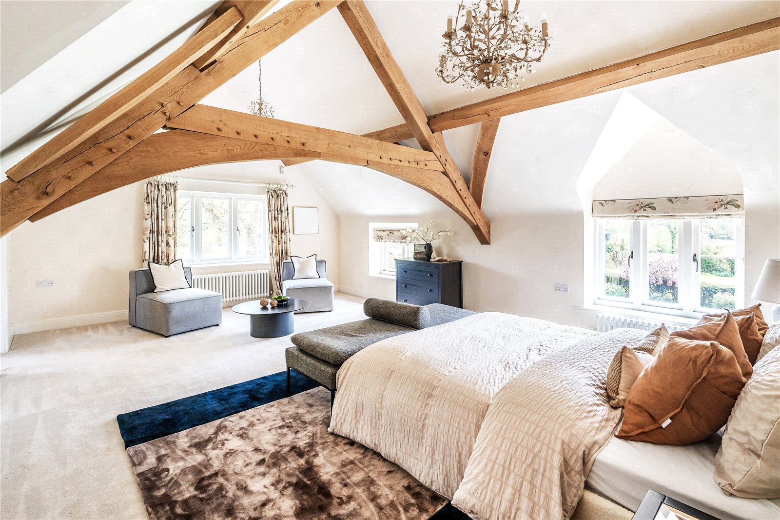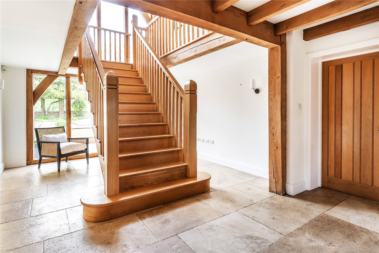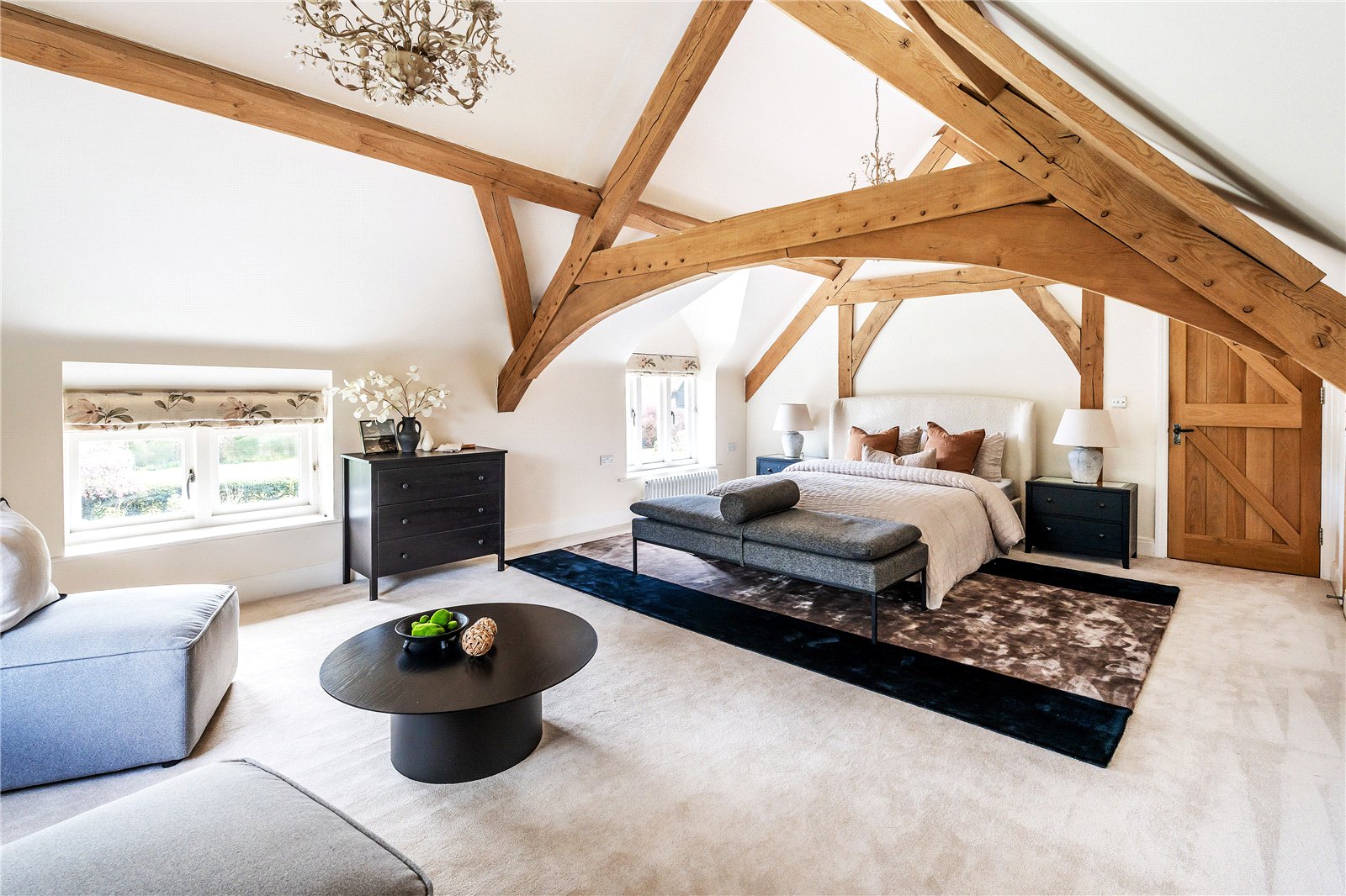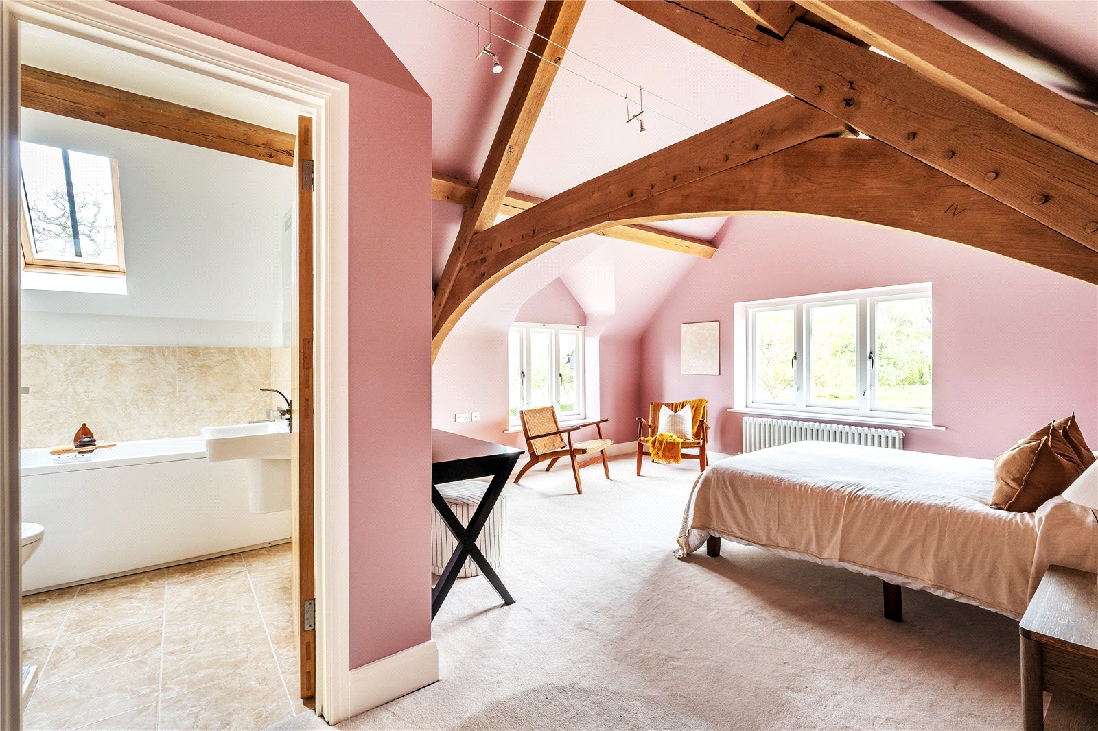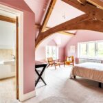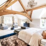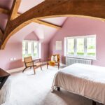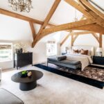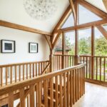 A centrally positioned solid wood staircase rises to the first floor, where a galleried landing enjoys elevated views across the grounds. All six bedrooms are generously proportioned and feature vaulted ceilings, enhancing the sense of space and character, with three benefiting from en-suite facilities. The principal suite is especially noteworthy, showcasing beautifully exposed beams and refined detailing, creating a luxurious and restful retreat.