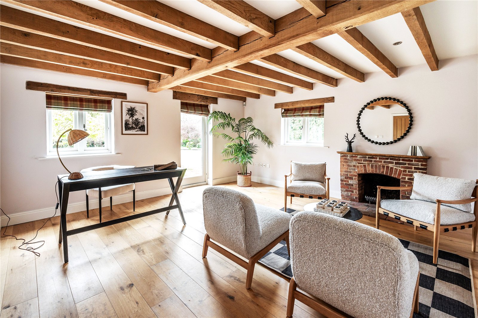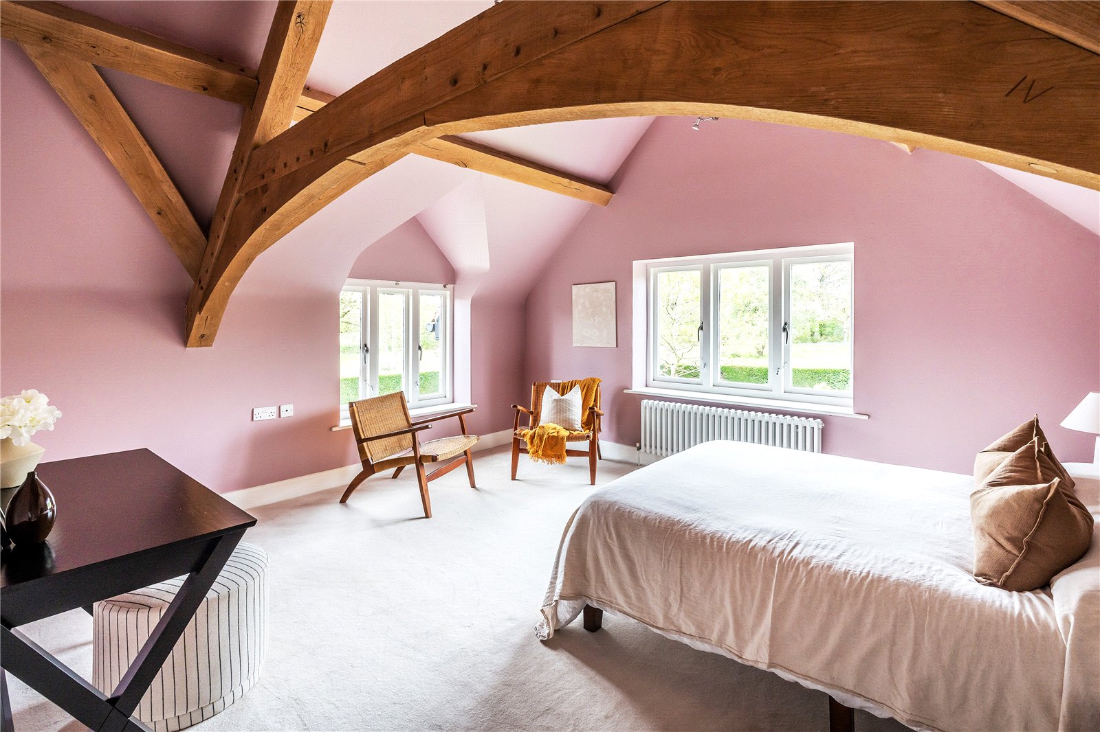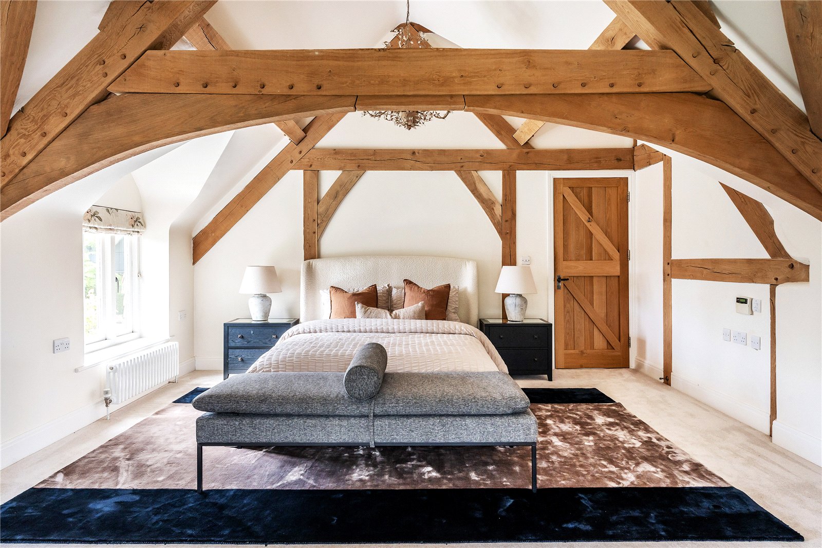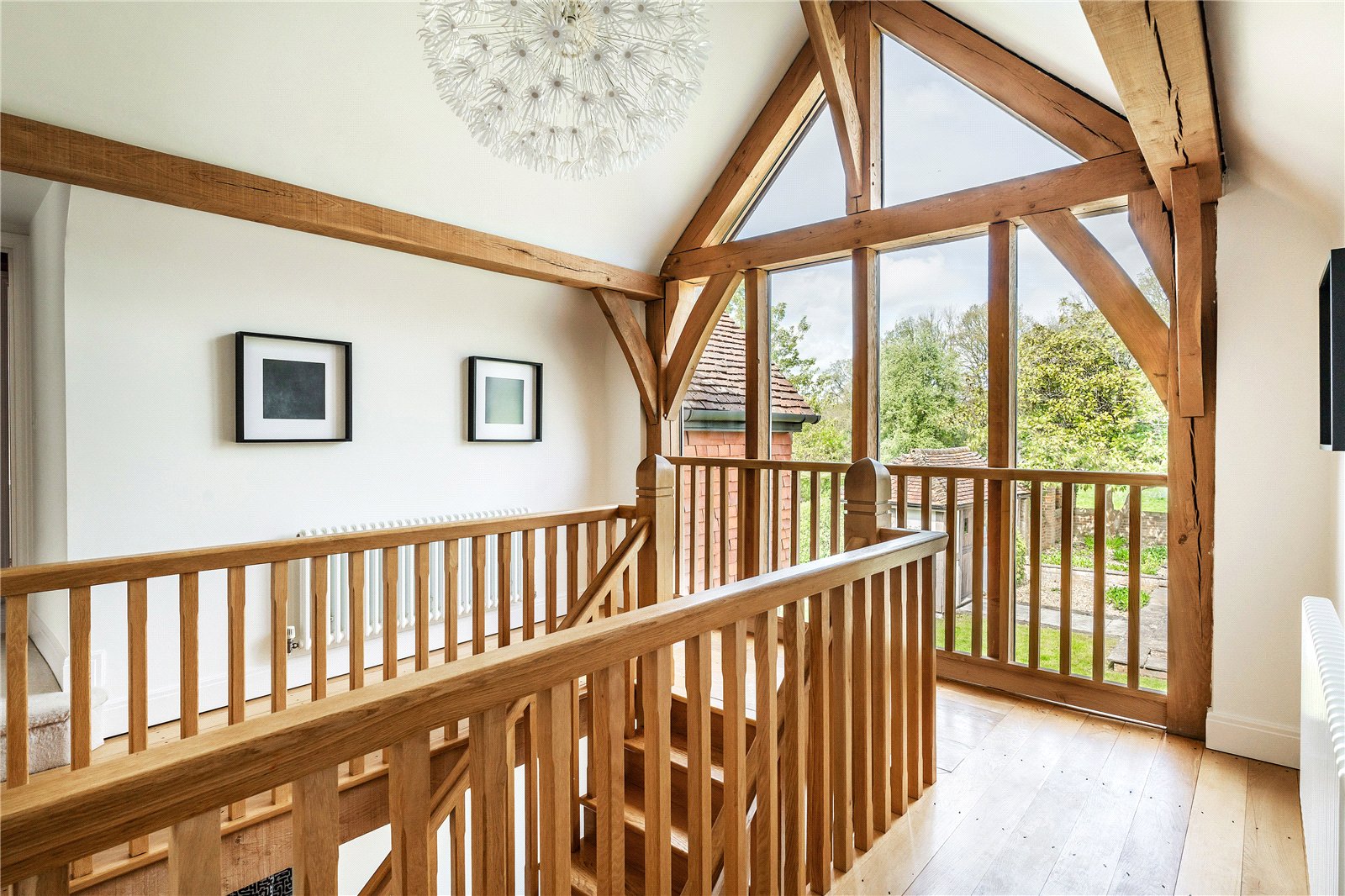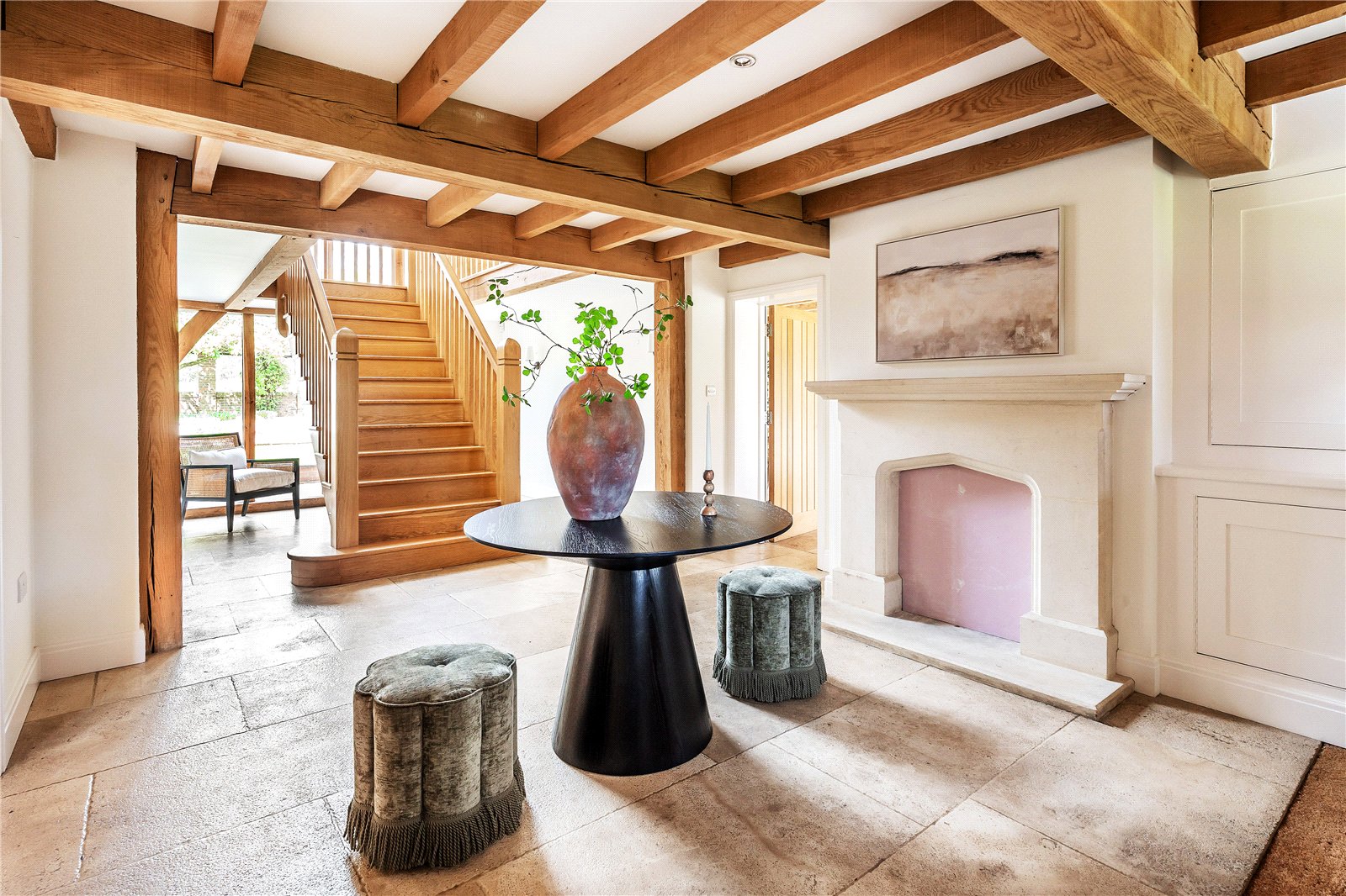 A centrally positioned solid wood staircase rises to the first floor, where a galleried landing enjoys elevated views across the grounds. All six bedrooms are generously proportioned and feature vaulted ceilings, enhancing the sense of space and character, with three benefiting from en-suite facilities. The principal suite is especially noteworthy, showcasing beautifully exposed beams and refined detailing, creating a luxurious and restful retreat.