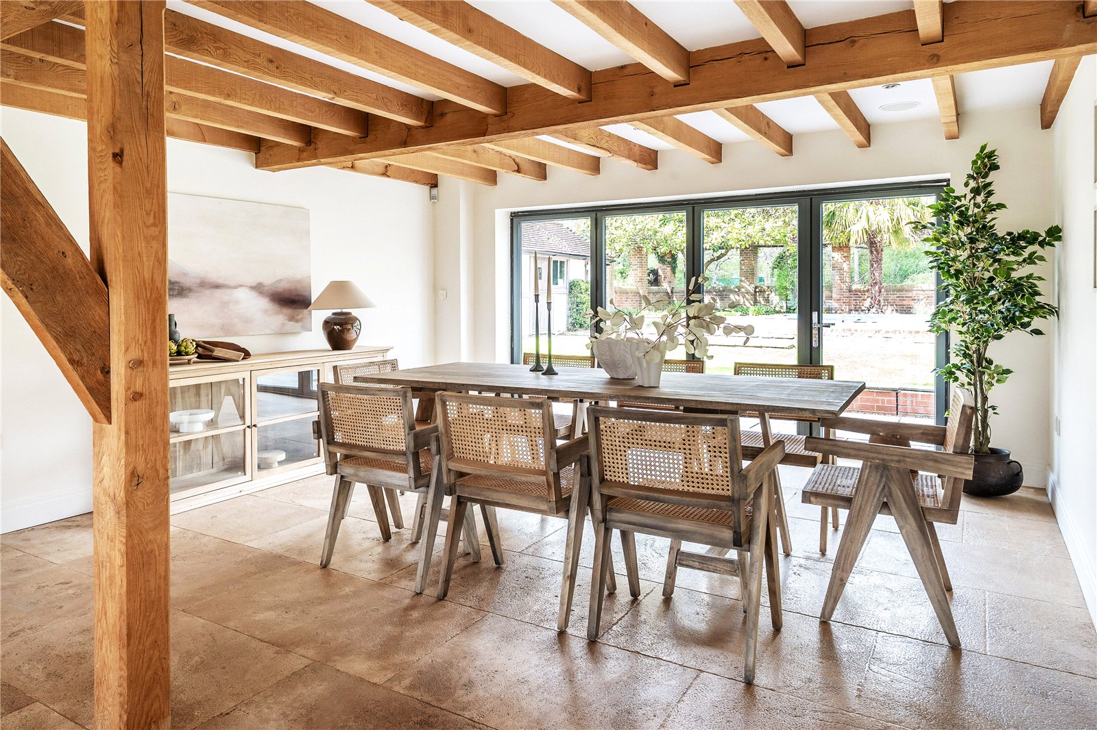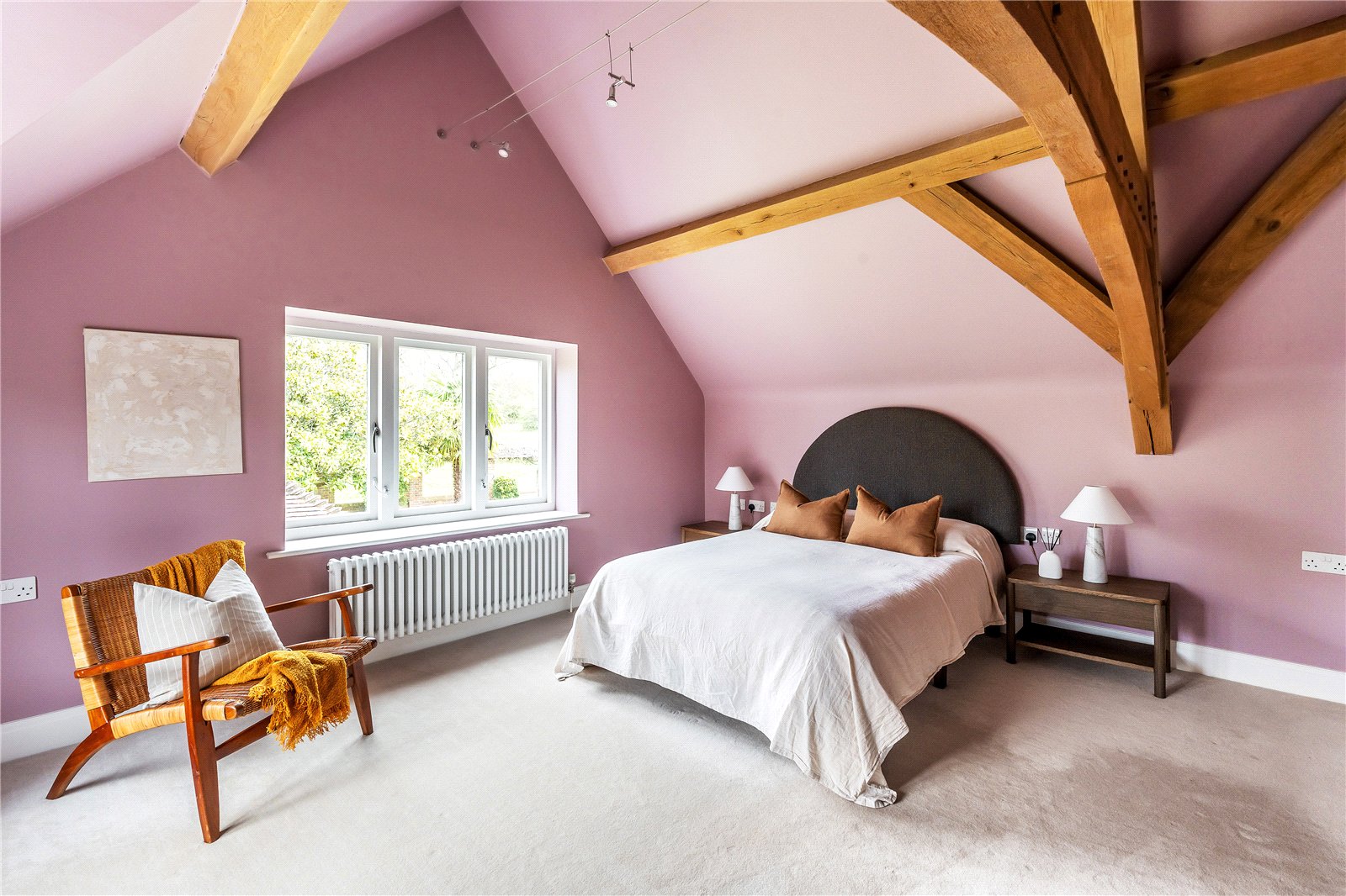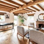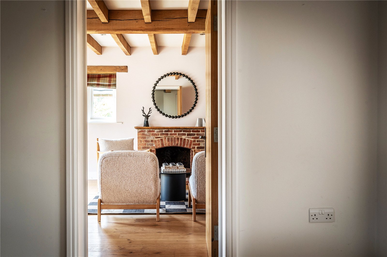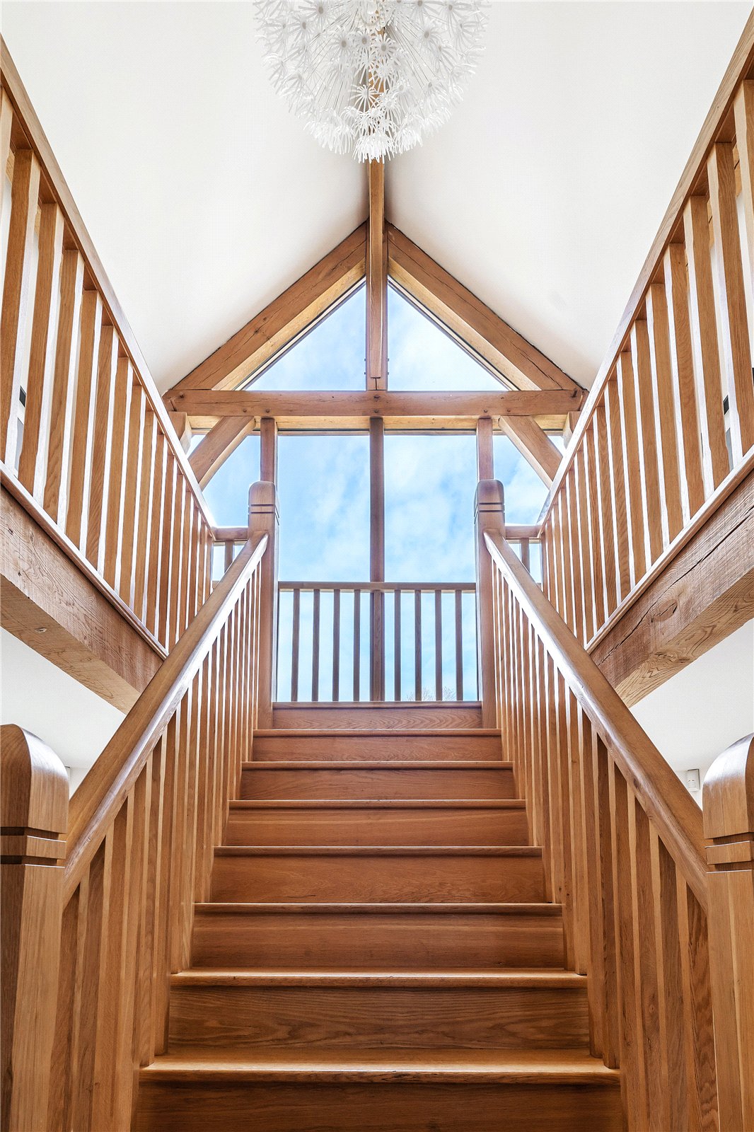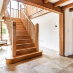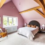 A centrally positioned solid wood staircase rises to the first floor, where a galleried landing enjoys elevated views across the grounds. All six bedrooms are generously proportioned and feature vaulted ceilings, enhancing the sense of space and character, with three benefiting from en-suite facilities. The principal suite is especially noteworthy, showcasing beautifully exposed beams and refined detailing, creating a luxurious and restful retreat.