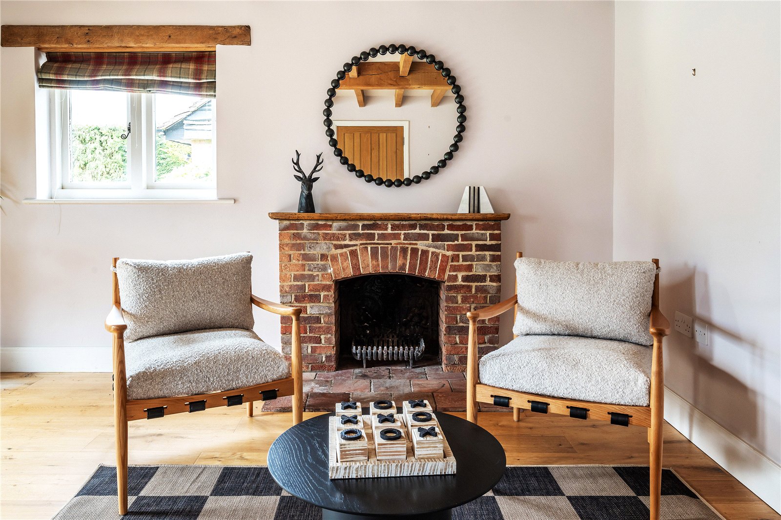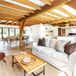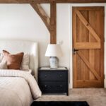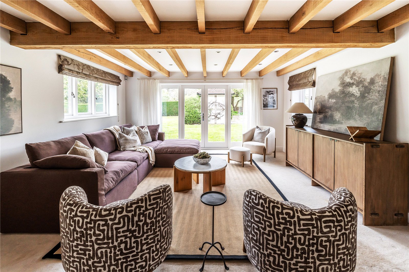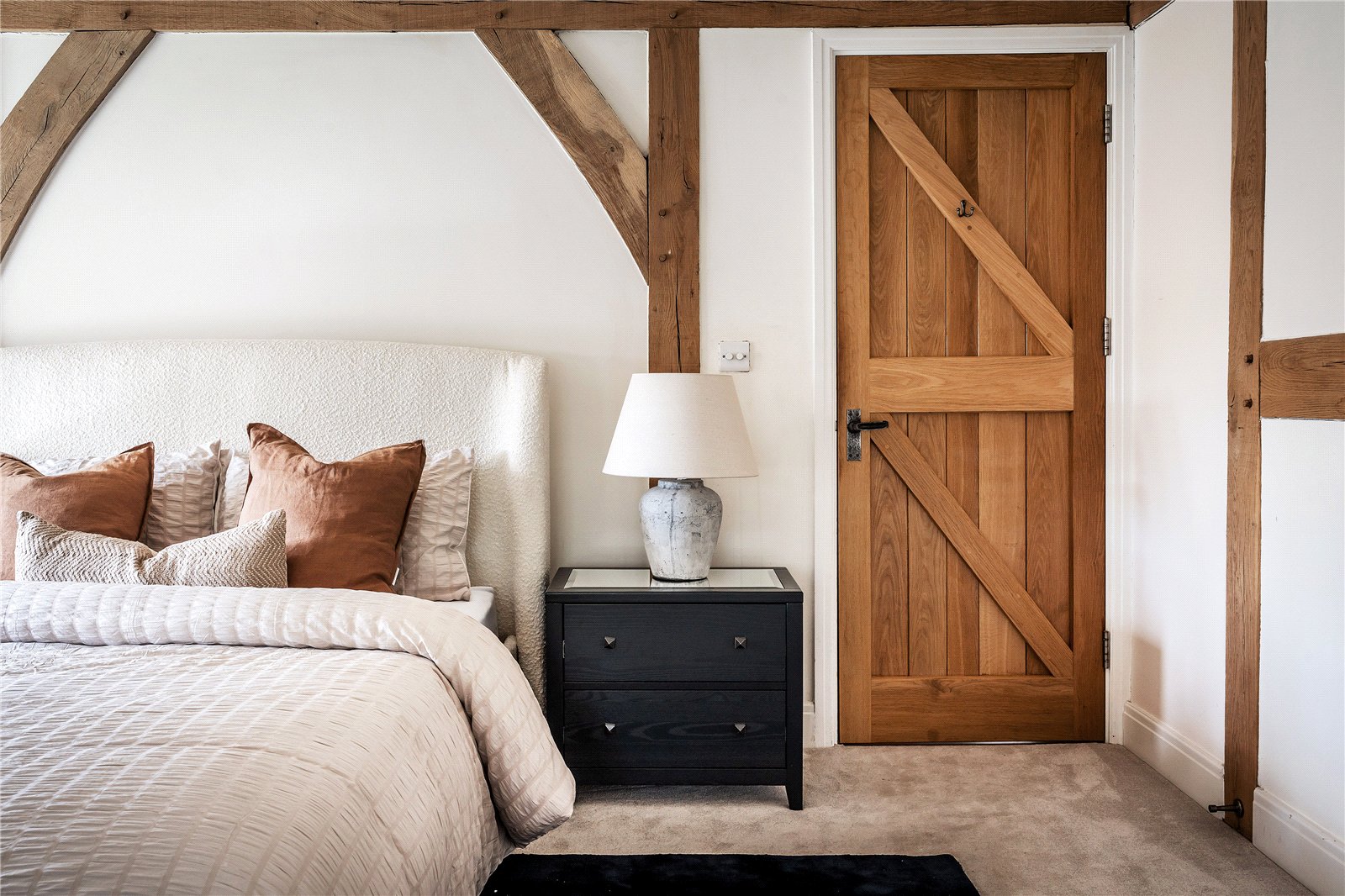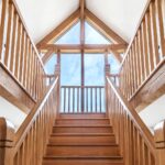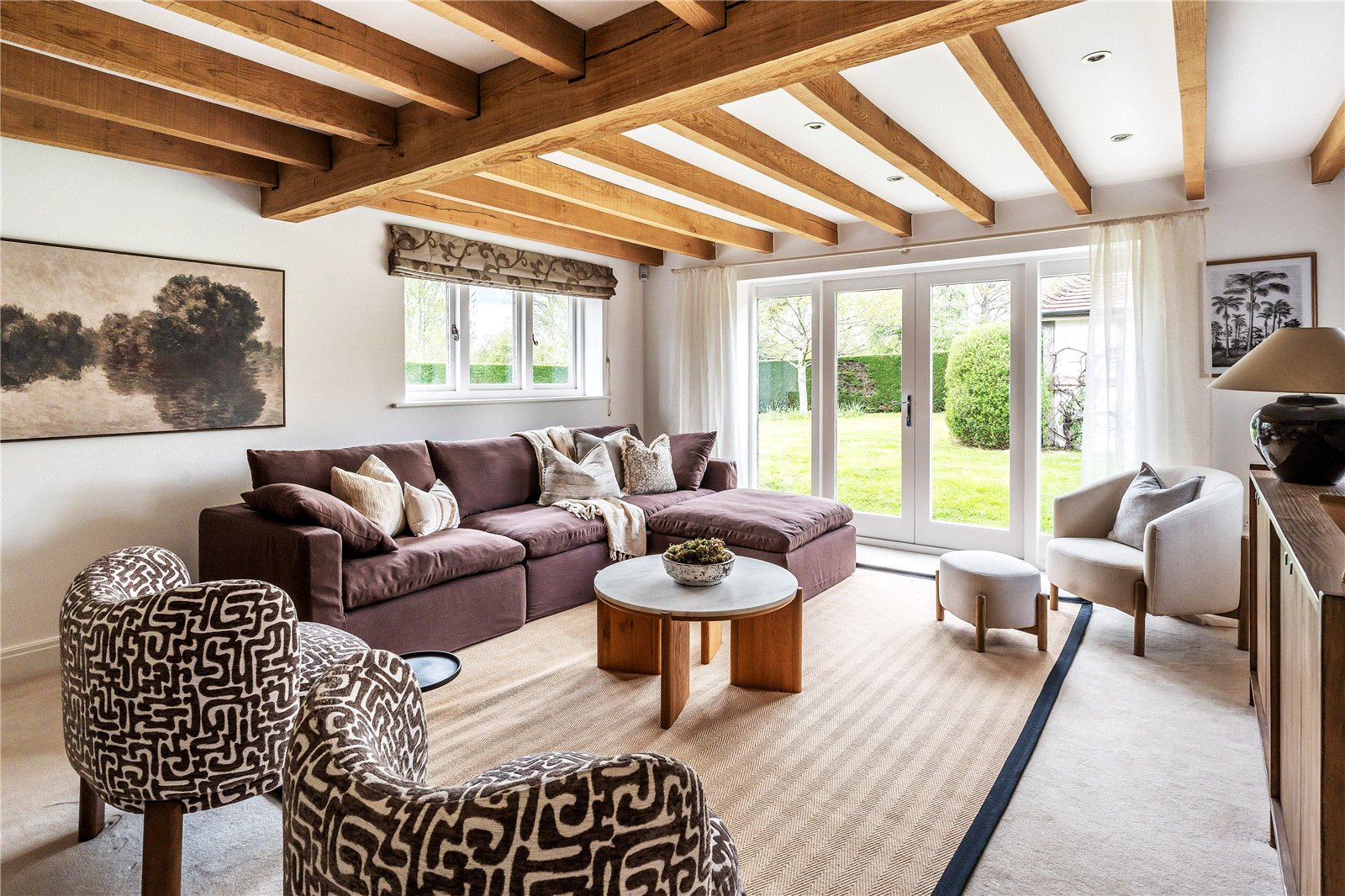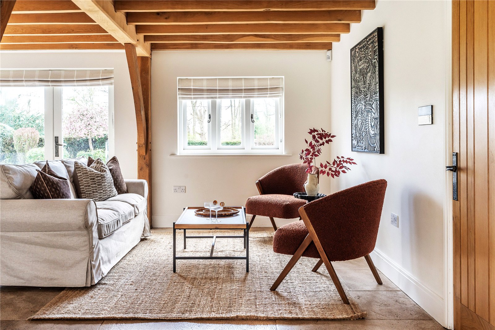 A centrally positioned solid wood staircase rises to the first floor, where a galleried landing enjoys elevated views across the grounds. All six bedrooms are generously proportioned and feature vaulted ceilings, enhancing the sense of space and character, with three benefiting from en-suite facilities. The principal suite is especially noteworthy, showcasing beautifully exposed beams and refined detailing, creating a luxurious and restful retreat.
